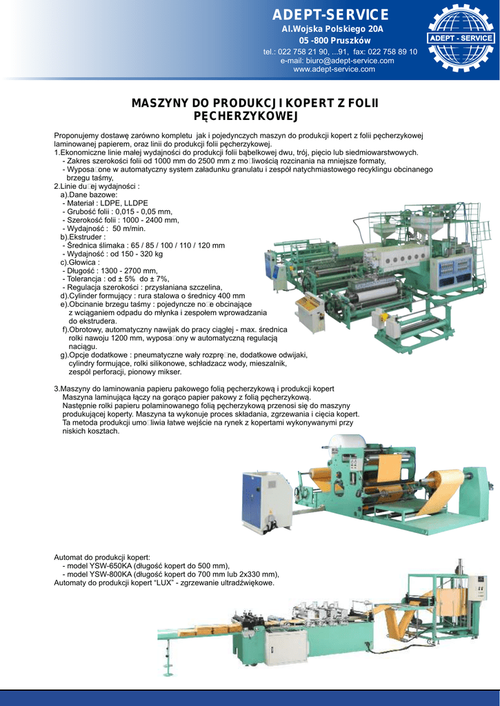 ADEPT-SERVICE Al.Wojska Polskiego 20A 05 -800 Pruszków tel.: 022 758 21 90, ...91, fax: 022 758 89 10 e-mail: [email protected] www.adept-service.com MASZYNY DO PRODUKCJI KOPERT Z FOLII PĘCHERZYKOWEJ Proponujemy dostawę zarówno kompletu jak i pojedynczych maszyn do produkcji kopert z folii pęcherzykowej laminowanej papierem, oraz linii do produkcji folii pęcherzykowej. 1.Ekonomiczne linie małej wydajności do produkcji folii bąbelkowej dwu, trój, pięcio lub siedmiowarstwowych. - Zakres szerokości folii od 1000 mm do 2500 mm z możliwością rozcinania na mniejsze formaty, - Wyposażone w automatyczny system załadunku granulatu i zespół natychmiastowego recyklingu obcinanego brzegu taśmy, 2.Linie dużej wydajności : a).Dane bazowe: - Materiał : LDPE, LLDPE - Grubość folii : 0,015 - 0,05 mm, - Szerokość folii : 1000 - 2400 mm, - Wydajność : 50 m/min. b).Ekstruder : - Średnica ślimaka : 65 / 85 / 100 / 110 / 120 mm - Wydajność : od 150 - 320 kg c).Głowica : - Długość : 1300 - 2700 mm, - Tolerancja : od ± 5% do ± 7%, - Regulacja szerokości : przysłaniana szczelina, d).Cylinder formujący : rura stalowa o średnicy 400 mm e).Obcinanie brzegu taśmy : pojedyncze noże obcinające z wciąganiem odpadu do młynka i zespołem wprowadzania do ekstrudera. f).Obrotowy, automatyczny nawijak do pracy ciągłej - max. średnica rolki nawoju 1200 mm, wyposażony w automatyczną regulacją naciągu. g).Opcje dodatkowe : pneumatyczne wały rozprężne, dodatkowe odwijaki, cylindry formujące, rolki silikonowe, schładzacz wody, mieszalnik, zespól perforacji, pionowy mikser. 3.Maszyny do laminowania papieru pakowego folią pęcherzykową i produkcji kopert Maszyna laminująca łączy na gorąco papier pakowy z folią pęcherzykową. Następnie rolki papieru polaminowanego folią pęcherzykową przenosi się do maszyny produkującej koperty. Maszyna ta wykonuje proces składania, zgrzewania i cięcia kopert. Ta metoda produkcji umożliwia łatwe wejście na rynek z kopertami wykonywanymi przy niskich kosztach. Automat do produkcji kopert: - model YSW-650KA (długość kopert do 500 mm), - model YSW-800KA (długość kopert do 700 mm lub 2x330 mm), Automaty do produkcji kopert “LUX” - zgrzewanie ultradźwiękowe. ADEPT-SERVICE Al.Wojska Polskiego 20A 05 -800 Pruszków tel.: 022 758 21 90, ...91, fax: 022 758 89 10 e-mail: [email protected] www.adept-service.com AUTOMAT DO PRODUKCJI ARKUSZY - Funkcja rozcinania i cięcia folii na arkusze, - Rozcinanie folii realizowane za pomocą noży krążkowych, - Cięcie na arkusze realizowane za pomocą płaskich noży, - Automat wyposażony w ręcznie ustawiane szpilki blokujące, oraz licznik cykli. RĘCZNIE OBSŁUGIWANA ZGRZEWARKA DO PRODUKCJI WORKÓW - Model YSW-1500HS-A (max. szerokość worka 2000 mm), - Model YSW-2000HS-A (max. szerokość worka 2000 mm). MASZYNA PERFORUJĄCA - Przystosowana do perforacji folii polietylenowej pęcherzykowej oraz spienionej, - Regulowane odstępy między liniami perforacji. - Łatwa w obsłudze.