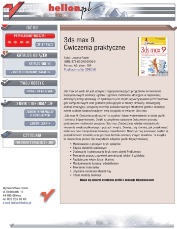 IDZ DO PRZYK£ADOWY ROZDZIA£ SPIS TREœCI KATALOG KSI¥¯EK KATALOG ONLINE ZAMÓW DRUKOWANY KATALOG 3ds max 9. Æwiczenia praktyczne Autor: Joanna Pasek ISBN: 978-83-246-0936-9 Format: A5, stron: 184 Przyk³ady na ftp: 5092 kB TWÓJ KOSZYK DODAJ DO KOSZYKA CENNIK I INFORMACJE ZAMÓW INFORMACJE O NOWOœCIACH ZAMÓW CENNIK CZYTELNIA FRAGMENTY KSI¥¯EK ONLINE 3ds max od wielu lat jest jednym z najpopularniejszych programów do tworzenia trójwymiarowych animacji i grafiki. Ogromne mo¿liwoœci dostêpne w najnowszej, dziewi¹tej wersji sprawiaj¹, ¿e aplikacja ta jest czêsto wykorzystywana przez twórców gier komputerowych oraz grafików pracuj¹cych w bran¿y filmowej i telewizyjnej. Jednak intuicyjny i przyjazny interfejs pozwala tworzyæ efektowne grafiki i animacje nawet osobom rozpoczynaj¹cym sw¹ przygodê ze œwiatem 3ds max. „3ds max 9. Æwiczenia praktyczne” to szybkie i ³atwe wprowadzenie w œwiat grafiki i animacji trójwymiarowej. Dziêki szczegó³owo opisanym æwiczeniom poznasz podstawowe mo¿liwoœci programu 3ds max. Zdobêdziesz wiedzê niezbêdn¹ do tworzenia nieskomplikowanych postaci i wnêtrz. Dowiesz siê równie¿, jak projektowaæ materia³y oraz manipulowaæ kamer¹ i oœwietleniem. Nauczysz siê animowaæ postaæ za poœrednictwem szkieletu oraz poznasz techniki animacji innych obiektów. Ta ksi¹¿ka to nieoceniona pomoc dla wszystkich adeptów grafiki trójwymiarowej. • Modelowanie z prostych bry³ i splajnów • Edycja obiektów siatkowych • Dodawanie i odejmowanie bry³; nowy obiekt ProBoolean • Tworzenie postaci z pow³oki zewnêtrznej (skóry) i szkieletu • Realistyczne w³osy, futra i tkaniny • Manipulowanie kamer¹ i oœwietleniem • Tworzenie materia³ów • U¿ywanie renderera Mental Ray • Ró¿ne metody animacji Naucz siê tworzyæ efektowne grafiki i animacje trójwymiarowe! Wydawnictwo Helion ul. Koœciuszki 1c 44-100 Gliwice tel. 032 230 98 63 e-mail: [email protected] Rozdział 1. Pierwsza postać: Pinokio 5 Początek Proste bryły (Primitives) Obiekty siatkowe (Mesh) Przygotowanie „skóry” Włosy, nowa specjalność 3ds max Proboolean; łączenie brył 5 13 23 31 44 51 Rozdział 2. Pierwsza scena: ławka pod oknem 55 Modelowanie wnętrza Kamera i podstawowe oświetlenie sceny Materiały Realistyczne oświetlenie wnętrza Realistyczne oświetlenie na zewnątrz, czyli Pinokio wychodzi z domu Rozdział 3. Skóra i szkielet, czyli jak przygotować postać do animacji Przygotowanie sceny Gotowy szkielet humanoida (Biped) Nakładanie skóry na szkielet Rozdział 4. Animacja postaci Swobodna animacja (Freeform) Animowanie za pomocą śladów stóp (Footsteps) Łączenie sekwencji ruchu 55 73 78 95 101 109 109 116 122 127 127 133 138 4 3ds max 9 • Ćwiczenia praktyczne Rozdział 5. Inne rodzaje animacji Animacja modyfikatorów i parametrów początkowych obiektów Animacja transformacji Upadek Tkanina Uwagi końcowe 145 146 150 163 167 177 Animacja obiektu typu Biped jest niezwykle intuicyjna. Możemy ustawiać pajacyka w dowolnych pozach, obracając poszczególne części ciała (tryb Freeform). Możemy też zmusić go do marszu lub biegu, rozmieszczając w scenie ślady stóp, po których pajac będzie się poruszać (tryb Footsteps). W tym rozdziale wypróbujemy obie możliwości. Akcja filmu nie będzie skomplikowana. Posadzimy Pinokia na ławeczce pośrodku sceny, a potem nakłonimy go, by wstał i wyszedł z komnaty. W trybie swobodnym (Freeform) animujemy pajaca wstającego z ławki. Ć W I C Z E N I E 4.1 Unieruchamianie stóp postaci 1. Otwórz plik pinokio_physique.max z poprzedniego rozdziału i zapisz go pod inną nazwą, np. pinokio_wstaje.max. 2. Zaznacz jedną ze stóp. 3. Przejdź do panelu Motion, lecz tym razem wyłącz tryb Figure Mode. 4. W rolecie Key Info kliknij ikonę Set Planted Key, oznaczoną kółkiem na rysunku 4.1. 128 3ds max 9 • Ćwiczenia praktyczne Rysunek 4.1. Tworzenie klucza dla stopy 5. W rolecie Track Selection kliknij ikonę Opposite , by została zaznaczona druga stopa. 6. Ponownie kliknij ikonę Set Planted Key. Stopy zostały przymocowane do podłogi. Ć W I C Z E N I E 4.2 Animacja środka ciężkości 1. Sprawdź, czy jesteś w zerowym ujęciu animacji. Numer bieżącego ujęcia możesz odczytać na suwaku pod oknami widokowymi. Powinieneś zobaczyć tam 0/100 (ujęcie zerowe ze stu dostępnych). Jeśli numer jest inny, przejdź do ujęcia 0., przeciągając suwak maksymalnie w lewo. 2. Kliknij przycisk AutoKey w dolnej części ekranu. Przycisk przybierze ostrzegawczą barwę czerwoną, gdyż jesteśmy teraz w trybie animacji. 3. W rolecie Track Selection włącz narzędzie Body Vertical . 4. W oknie Left przesuń środek ciężkości (obiekt pinokio szkielet) w dół, umieszczając biodra na wysokości ławki. 5. Narzędziem Body Horizontal przesuń środek ciężkości nad ławkę, tak by pajac usiadł (rysunek 4.2). 6. Przejdź do ujęcia Front i przesuń środek ciężkości choć o włos tym samym narzędziem, by utworzyć klucz dla tej współrzędnej położenia. 7. Przesuń suwak animacji do ujęcia 20. Możesz też wpisać 20 w okienku tekstowym dostępnym w grupie ikon sterowania odtwarzaniem animacji (Play, Stop itp.) i zatwierdzić ten numer naciśnięciem klawisza Enter. 129 Rozdział 4. • Animacja postaci Rysunek 4.2. W zerowym ujęciu animacji pajac siedzi na ławce 8. Korzystając z narzędzi Body Horizontal i Body Vertical w oknie Left i Front umieść środek ciężkości mniej więcej tam, gdzie był na początku, tak by znów nadać pajacowi pozycję stojącą. 9. Wyłącz tryb AutoKey. 10. Kliknij Play , by odtworzyć animację. Między ujęciem 0. a 20. pajacyk wstaje z ławki, lecz czyni to bardzo sztywno. Animujemy teraz inne części szkieletu, aby nadać pajacykowi bardziej naturalny wygląd. Można to zrobić w trybie AutoKey, który właśnie poznałeś, lecz łatwiej będzie uniknąć niepożądanych przemieszczeń kości, animując je w trybie S