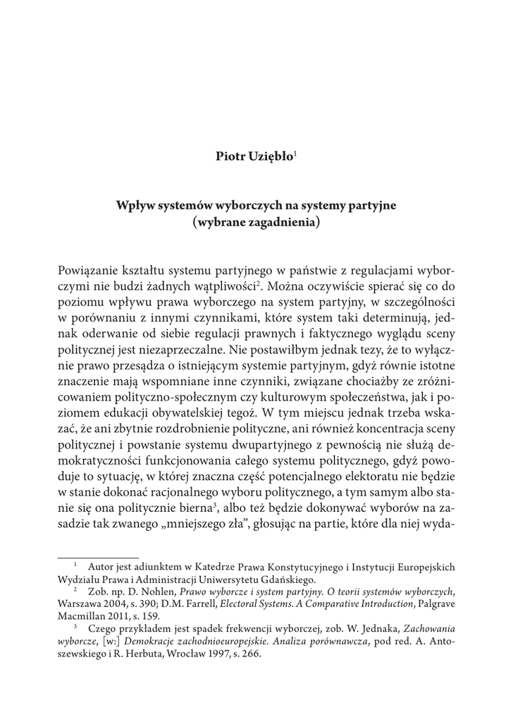 Piotr Uziębło1 Wpływ systemów wyborczych na systemy partyjne (wybrane zagadnienia) Powiązanie kształtu systemu partyjnego w państwie z regulacjami wyborczymi nie budzi żadnych wątpliwości2. Można oczywiście spierać się co do poziomu wpływu prawa wyborczego na system partyjny, w szczególności w porównaniu z innymi czynnikami, które system taki determinują, jednak oderwanie od siebie regulacji prawnych i faktycznego wyglądu sceny politycznej jest niezaprzeczalne. Nie postawiłbym jednak tezy, że to wyłącznie prawo przesądza o istniejącym systemie partyjnym, gdyż równie istotne znaczenie mają wspomniane inne czynniki, związane chociażby ze zróżnicowaniem polityczno-społecznym czy kulturowym społeczeństwa, jak i poziomem edukacji obywatelskiej tegoż. W tym miejscu jednak trzeba wskazać, że ani zbytnie rozdrobnienie polityczne, ani również koncentracja sceny politycznej i powstanie systemu dwupartyjnego z pewnością nie służą demokratyczności funkcjonowania całego systemu politycznego, gdyż powoduje to sytuację, w której znaczna część potencjalnego elektoratu nie będzie w stanie dokonać racjonalnego wyboru politycznego, a tym samym albo stanie się ona politycznie bierna3, albo też będzie dokonywać wyborów na zasadzie tak zwanego „mniejszego zła”, głosując na partie, które dla niej wyda1 Autor jest adiunktem w Katedrze Prawa Konstytucyjnego i Instytucji Europejskich Wydziału Prawa i Administracji Uniwersytetu Gdańskiego. 2 Zob. np. D. Nohlen, Prawo wyborcze i system partyjny. O teorii systemów wyborczych, Warszawa 2004, s. 390; D.M. Farrell, Electoral Systems. A Comparative Introduction, Palgrave Macmillan 2011, s. 159. 3 Czego przykładem jest spadek frekwencji wyborczej, zob. W. Jednaka, Zachowania wyborcze, [w:] Demokracje zachodnioeuropejskie. Analiza porównawcza, pod red. A. Antoszewskiego i R. Herbuta, Wrocław 1997, s. 266. PRZEGLĄD PRAWA KONSTYTUCYJNEGO 2011/3 68 ją się najmniej groźne4. Obie te postawy nie mogą być uznane za pożądane, a w konsekwencji – cementując układ polityczny – przyczyniają się do jego delegitymizacji. Najlepszym przykładem mogą być Stany Zjednoczone, gdzie znacząca część wyborców nie identyfikuje się z dwiema największymi partiami politycznymi5, nie widząc jednak szansy na zmianę systemu dwupartyjnego. Dlatego też od prawa wyborczego trzeba oczekiwać, aby było ono w stanie zagwarantować rzeczywistą konkurencyjność na gruncie rywalizacji partyjnej, nie prowadząc jednak, co naturalne, do pełnej defragmentacji układu stronnictw politycznych. I właśnie w dalszej części niniejszego artykułu pragnę skupić się na analizie funkcjonowania elementów systemu wyborczego stworzonego przez ustawodawstwo wyborcze pod kątem kreowania przez nie systemów partyjnych oraz ich utrzymywania w określonym stanie. Podstawowym problemem, nad którym warto się zastanowić, jest określenie tych elementów prawa wyborczego (a także regulacji z tym powiązanych), które w bezpośredni bądź pośredni sposób determinują układ sceny politycznej. Powszechnie podkreśla się, że podstawowe znaczenie ma tutaj wybór systemu wyborczego w znaczeniu wąskim, a więc metoda alokacji mandatów pomiędzy poszczególne ugrupowania startujące w wyborach. Nie jest to jednak jedyny determinant kształtujący scenę partyjną. Trzeba również podkreślić, że ściśle w tym miejscu powiązany z systemem wyborczym staje się kształt okręgów wyborczych, który również może, pomimo przyjęcia z pozoru demokratycznego systemu alokacji mandatów, być istotnym czynnikiem dla rozwoju systemu partyjnego. Z tym także związane jest występowanie progów wyborczych i ich ewentualnego poziomu6. Poza tym nie sposób nie wspomnieć, że poza elementami konstruującymi system wyborczy znaczące dla systemu partyjnego są także trzy inne kwestie. Pierwszą z nich są zasady zgłaszania kandydatów w wyborach, które mogą stanowić formę uprzywilejowania pewnych stronnictw. Drugim czynnikiem G. Bingham Powell Jr., Wybory jako narzędzie demokracji. Koncepcje większościowe i proporcjonalne, Warszawa 2006, s. 177. 5 A. Blais, E. Gidengil, R. Nadeau, N. Nevitte, Measuring Party Identification: Britain, Canada, and the United States, „Political Behavior” Vol. 23, No. 1, 2001, s. 11–12. 6 Por. A. Antoszewski, Systemy wyborcze, [w:] Demokracje zachodnioeuropejskie. Analiza porównawcza, pod red. A. Antoszewskiego i R. Herbuta, Wrocław 1997, s. 228–230. 4 Piotr Uziębło • Wpływ systemów wyborczych na systemy partyjne... 69 staje się także sposób prowadzenia kampanii wyborczej7, a wreszcie trzecim czynnikiem o kluczowym – jest już problem finansowania polityki, widziany przede wszystkim w kontekście stwarzania równych szans wyborczych oraz dający możliwość dostępu do sceny politycznej nowotworzonym ugrupowaniom. Jednakże obszary te pozostaną poza sferą analizy dokonanej w niniejszym artykule. Jak już wspomniałem, spośród wszystkich elementów prawa wyborczego największe znaczenie dla budowy i utrwalenia układu partyjnego w państwie ma regulacja systemu wyborczego. To właśnie wybór systemu wyborczego staje się kluczem do zrozumienia kształtu systemu partyjnego, jak i jego genezy. Generalizując, można powiedzieć, że w szczególności istotne jest tutaj przyjęcie większościowej bądź proporcjonalnej formuły wyborczej. Teoretycznie w tym pierwszym przypadku decydujące znaczenie ma chęć zapewnienia stabilnej większości parlamentarnej, w drugim zaś podstawowe znaczenie nadaje się reprezentatywności parlamentu. Naturalnie jednak jest to istotne uproszczenie, gdyż w obu przypadkach można pokazać przykłady odmienne, jednak co do zasady obie te formuły powodują właśnie takie odmienne konsekwencje8. Odnosząc się do systemu większościowego, trzeba podkreślić, ze skutek jego wprowadzenia może być dwojaki. Najczęściej oczywi