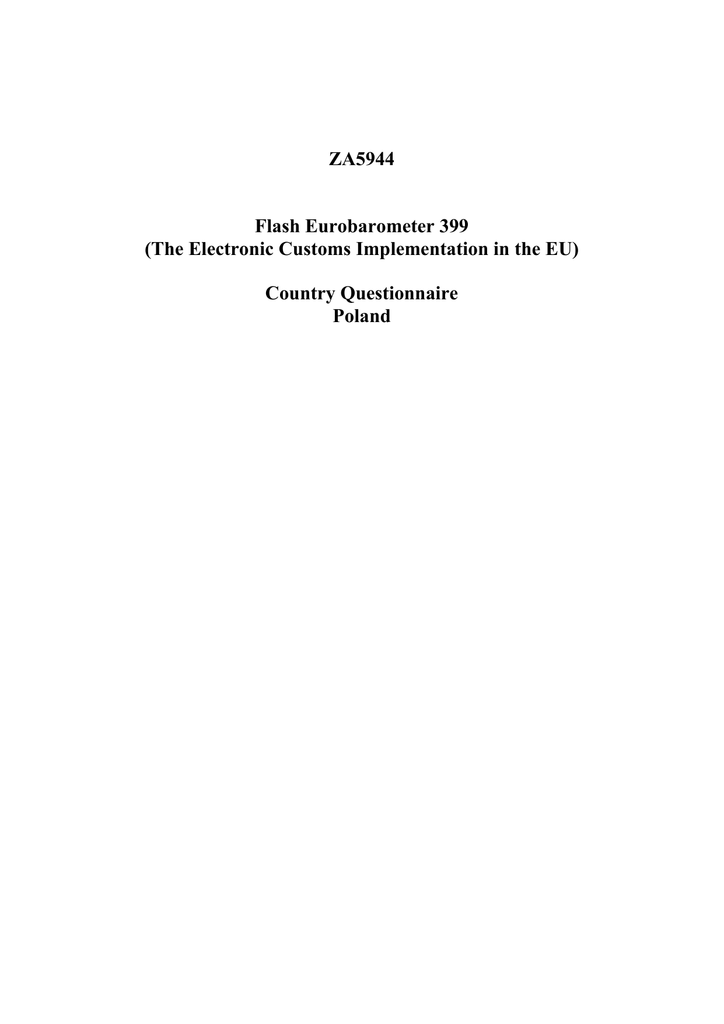ZA5944 Flash Eurobarometer 399 (The Electronic Customs Implementation in the EU) Country Questionnaire Poland A numer projektu Flash B kod państwa C numer wywiadu NACE Kod NACE (Informacja z próby) Kod NACE – 4 cyfry SIZE Wielkość firmy (Informacja z próby) Wielkość firmy (INTRO 1) Dzień dobry. Nazywam się (IMIĘ I NAZWISKO) i dzwonię z TNS Polska. Nawiązujemy kontakt z kluczowymi decydentami z różnych firm europejskich, aby poznać ich opinie na temat bieżących spraw biznesowych. Czy mogę na początek sprawdzić, czy Państwa firma kwalifikuje się do badania? A00 Czy w 2013 roku Pana(i) firma importowała z krajów spoza Unii Europejskiej lub eksportowała do tych krajów? ODCZYTAJ WSZYTKIE TRZY ODPOWIEDZI Tak Nie Nie wiem/ trudno powiedzieć (ODCZYTAJ) 1 2 3 NEW JEŚLI A00=2 „NIE”, ZAKOŃCZ WYWIAD 1 JEŚLI A00=1, „TAK”, LUB A00=3 „Nie wie /trudno powiedzieć”, PRZEJDŹ DO INTRO1a (INTRO1a) Czy mogę rozmawiać z (IMIĘ I NAZWISKO RESPONDENTA LUB TYTUŁ/OPIS STANOWISKA, JEŚLI NIE PODANO PERSONALIÓW)? (INTRO 2) JEŚLI OSOBA PRZY TELEFONIE PROSI O DODATKOWE INFORMACJE. Nawiązujemy kontakt z kluczowymi decydentami z różnych firm europejskich, aby poznać ich opinie na temat bieżących spraw biznesowych. Pozyskane informacje zostaną wykorzystane przy wytyczaniu kierunków i planowaniu europejskiej polityki na następne lata. Będę bardzo wdzięczny/a, jeśli będę mógł(mogła) z nim/nią porozmawiać, aby zawrzeć jego/jej opinie w badaniu. JEŚLI STOSOWNY RESPONDENT NIE JEST DOSTĘPNY, UMÓW SIĘ NA KOLEJNY TELEFON. (INTRO 3) (PODCZAS ROZMOWY Z DOCELOWYMI RESPONDENTAMI) Dzień dobry, nazywam się (IMIĘ I NAZWISKO) i dzwonię z TNS Polska, firmy zajmującej się badaniami opinii. JEŚLI P5D<>"" I P5d<>999, PROSZĘ WYŚWIETLIĆ „SKIEROWANIE OD:” ORAZ P5d (NA TYM SAMYM EKRANIE CO INTRO 3) (INTRO4) Nawiązujemy kontakt z kluczowymi decydentami z różnych firm europejskich, aby poznać ich opinie na temat bieżących spraw biznesowych i Pana/i udział byłby dla nas bardzo cenny. Pozyskane informacje zostaną wykorzystane przy wytyczaniu kierunków i planowaniu europejskiej polityki na następne lata. Czy znajdzie Pan/i czas, żeby odpowiedzieć na kilka pytań? Nie powinno to zająć więcej niż 15 minut. ZADAJ LAN1 TYLKO W BE, EE, FI, IE, LV, LU, MT LAN1 W jakim języku chciał(a)by Pan/i, byśmy przeprowadzili wywiad? (ODCZYTAJ - TYLKO JEDNA ODPOWIEDŹ) Austria - niemiecki Belgia - niderlandzki Belgia - francuski Bułgaria - bułgarski Chorwacja - chorwacki Republika Czeska - czeski Dania - duński Estonia - estoński Estonia - rosyjski Finlandia - fiński Finlandia - szwedzki Francja - francuski Niemcy - niemiecki Grecja - grecki Węgry - węgierski Islandia - islandzki Irlandia - angielski Irlandia - irlandzki 1 2 3 4 5 6 7 8 9 10 11 12 13 14 15 16 17 18 2 Włochy - włoski Łotwa - łotewski Łotwa - rosyjski Litwa - litewski Luksemburg - luksemburski Luksemburg - francuski Luksemburg - niemiecki Macedonia - macedoński Macedonia - albański Malta - maltański Malta - angielski Czarnogóra - czarnogórski Holandia - niderlandzki Norwegia - norweski Polska - polski Portugalia - portugalski Republika Cypryjska - grecki Rumunia - rumuński Słowacja - słowacki Słowenia - słoweński Hiszpania - kataloński Hiszpania - hiszpański Szwecja - szwedzki Szwajcaria - niemiecki Szwajcaria - francuski Szwajcaria - włoski Turcja - turecki Turcja - kurdyjski Turecka społeczność na Cyprze - turecki Zjednoczone Królestwo - angielski Stany Zjednoczone Ameryki Północnej - angielski 19 20 21 22 23 24 25 26 27 28 29 30 31 32 33 34 35 36 37 38 39 40 41 42 43 44 45 46 47 48 49 (UPEWNIENIE RESPONDENTA) Chciał(a)bym zapewnić, że Pana/i współpraca jest całkowicie dobrowolna, a wszystkie odpowiedzi są poufne. Dla celów kontroli jakości oraz dla celów szkoleniowych wywiad ten może być monitorowany lub nagrywany. Na początek zadam kilka pytań do celów statystycznych. DLA WSZYSTKICH A0 Czy w 2013 roku Pana(i) firma importowała z krajów spoza Unii Europejskiej lub eksportowała do tych krajów? ODCZYTAJ WSZYTKIE TRZY ODPOWIEDZI Tak Nie Nie wiem/ trudno powiedzieć (ODCZYTAJ) 1 2 3 NEW JEŚLI A0=2 „NIE”, ZAKOŃCZ WYWIAD 3 JEŚLI A0=1, „TAK”, PRZEJDŹ DO B2 JEŚLI A0=3 „Nie wie/trudno powiedzieć”, PRZEJDŹ DO B1 B2a Czy jest Pan(i) osobą odpowiedzialną za stosowanie się do przepisów celnych lub za operacje celne? Tak Nie 1 2 NEW JEŚLI B2a=1 „TAK”, PRZEJDŹ DO P5d JEŚLI B2a=2 „NIE”, PRZEJDŹ DO C0 C0 Czy mogę porozmawiać z osobą odpowiedzialną za stosowanie się do przepisów celnych lub za operacje celne? Tak, i osoba ta jest teraz dostępna Tak, i osoba ta nie jest teraz dostępna Nie/odmowa (NIE ODCZYTUJ) 1 2 3 NEW JEŚLI C0=3, ZAKOŃCZ WYWIAD JEŚLI C0=1 „Tak, i osoba ta jest dostępna” lub CO=2 „Tak, i osoba ta nie jest teraz dostępna”, PRZEJDŹ DO P5a1-P5c1 P5a1 Czy może mi Pan(i) podać imię i nazwisko osoby odpowiedzialnej za stosowanie się do przepisów celnych lub za operacje celne? (ANK.: PROSZĘ ZAPISAĆ IMIĘ I NAZWISKO WSKAZANEJ OSOBY – JEŚLI „BRAK ODPOWIEDZI/ODMOWA”, KOD „999”) (2028,2029-2048) 10 2 FL359 P5a P5b1 Jakie stanowisko zajmuje ta osoba? (ANK.: PROSZĘ ZAPISAĆ STANOWISKO WSKAZANEJ OSOBY – JEŚLI „BRAK ODPOWIEDZI/ODMOWA”, KOD „999”) 4 10 2 (2049,2050-2069) FL359 P5b P5c1 Czy może mi Pan(i) podać numer wewnętrzny lub bezpośredni numer do tej osoby? (ANK.: PROSZĘ ZAPISAĆ NUMER WEWNĘTRZNY/ BEZPOŚREDNI NUMER WSKAZANEJ OSOBY – JEŚLI „BRAK ODPOWIEDZI/ODMOWA”, KOD „999”) (2070,2071-2090) 10 2 FL359 P5c JEŚLI C0=1, PRZEJDŹ DO P5d JEŚLI WŁAŚCIWY RESPONDENT NIE JEST DOSTĘPNY (C0=2), UMÓW SIĘ NA WYWIAD W INNYM TERMINIE. ZADAJ B1a, JEŚLI A0=3, „Nie wiem/trudno powiedzieć” B1a Czy mogę porozmawiać z osobą odpowiedzialną za podejmowanie decyzji w firmie (dyrektorem zarządzającym, prezesem) lub z osobą, która kieruje działalności