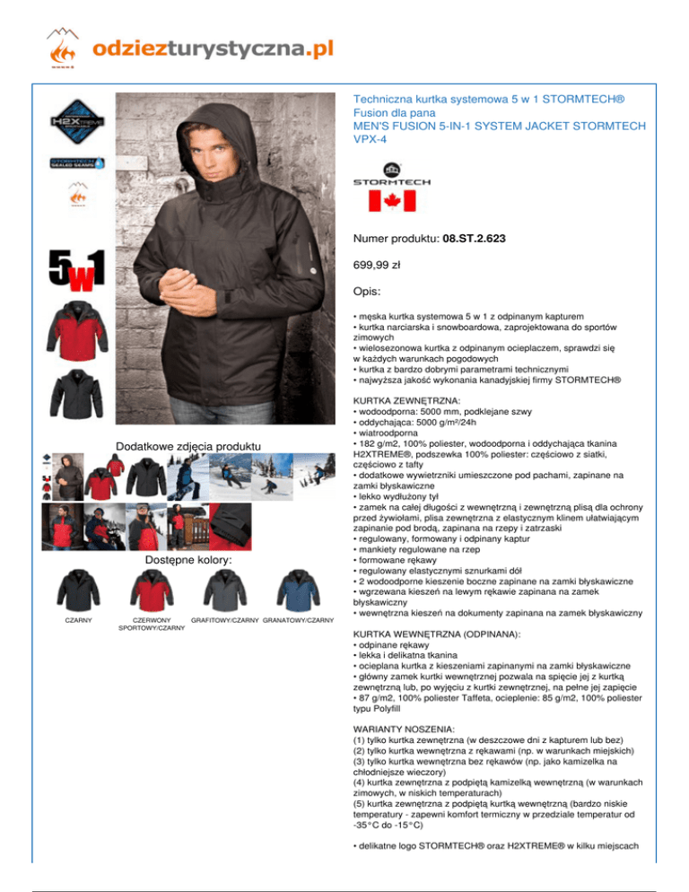 Techniczna kurtka systemowa 5 w 1 STORMTECH® Fusion dla pana MEN'S FUSION 5-IN-1 SYSTEM JACKET STORMTECH VPX-4 Numer produktu: 08.ST.2.623 699,99 zł Opis: • męska kurtka systemowa 5 w 1 z odpinanym kapturem • kurtka narciarska i snowboardowa, zaprojektowana do sportów zimowych • wielosezonowa kurtka z odpinanym ocieplaczem, sprawdzi się w każdych warunkach pogodowych • kurtka z bardzo dobrymi parametrami technicznymi • najwyższa jakość wykonania kanadyjskiej firmy STORMTECH® Dodatkowe zdjęcia produktu Dostępne kolory: CZARNY CZERWONY GRAFITOWY/CZARNY GRANATOWY/CZARNY SPORTOWY/CZARNY KURTKA ZEWNĘTRZNA: • wodoodporna: 5000 mm, podklejane szwy • oddychająca: 5000 g/m²/24h • wiatroodporna • 182 g/m2, 100% poliester, wodoodporna i oddychająca tkanina H2XTREME®, podszewka 100% poliester: częściowo z siatki, częściowo z tafty • dodatkowe wywietrzniki umieszczone pod pachami, zapinane na zamki błyskawiczne • lekko wydłużony tył • zamek na całej długości z wewnętrzną i zewnętrzną plisą dla ochrony przed żywiołami, plisa zewnętrzna z elastycznym klinem ułatwiającym zapinanie pod brodą, zapinana na rzepy i zatrzaski • regulowany, formowany i odpinany kaptur • mankiety regulowane na rzep • formowane rękawy • regulowany elastycznymi sznurkami dół • 2 wodoodporne kieszenie boczne zapinane na zamki błyskawiczne • wgrzewana kieszeń na lewym rękawie zapinana na zamek błyskawiczny • wewnętrzna kieszeń na dokumenty zapinana na zamek błyskawiczny KURTKA WEWNĘTRZNA (ODPINANA): • odpinane rękawy • lekka i delikatna tkanina • ocieplana kurtka z kieszeniami zapinanymi na zamki błyskawiczne • główny zamek kurtki wewnętrznej pozwala na spięcie jej z kurtką zewnętrzną lub, po wyjęciu z kurtki zewnętrznej, na pełne jej zapięcie • 87 g/m2, 100% poliester Taffeta, ocieplenie: 85 g/m2, 100% poliester typu Polyfill WARIANTY NOSZENIA: (1) tylko kurtka zewnętrzna (w deszczowe dni z kapturem lub bez) (2) tylko kurtka wewnętrzna z rękawami (np. w warunkach miejskich) (3) tylko kurtka wewnętrzna bez rękawów (np. jako kamizelka na chłodniejsze wieczory) (4) kurtka zewnętrzna z podpiętą kamizelką wewnętrzną (w warunkach zimowych, w niskich temperaturach) (5) kurtka zewnętrzna z podpiętą kurtką wewnętrzną (bardzo niskie temperatury - zapewni komfort termiczny w przedziale temperatur od -35°C do -15°C) • delikatne logo STORMTECH® oraz H2XTREME® w kilku miejscach • waga kurtki: ok. 1650 g • wszystkie kolory dostępne do rozmiaru 3XL włącznie, kolor czarny dostępny również w rozmiarze 4XL Powered by TCPDF (www.tcpdf.org)