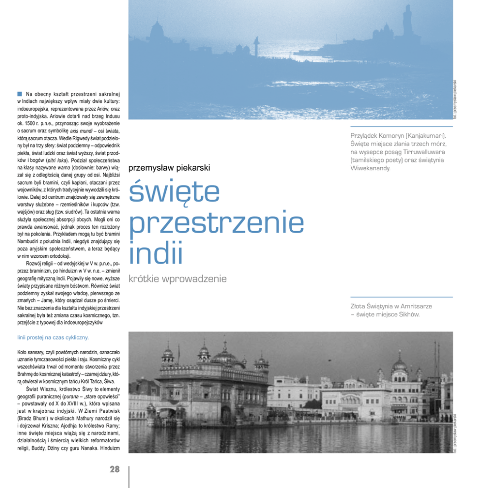 fot.: przemysław piekarski Na obecny kształt przestrzeni sakralnej w Indiach największy wpływ miały dwie kultury: indoeuropejska, reprezentowana przez Ariów, oraz proto-indyjska. Ariowie dotarli nad brzeg Indusu ok. 1500 r. p.n.e., przynosząc swoje wyobrażenie o sacrum oraz symbolikę axis mundi – osi świata, którą sacrum otacza. Wedle Rigwedy świat podzielony był na trzy sfery: świat podziemny – odpowiednik piekła, świat ludzki oraz świat wyższy, świat przodków i bogów (pitri loka). Podział społeczeństwa na klasy nazywane warna (dosłownie: barwy) wiązał się z odległością danej grupy od osi. Najbliżsi sacrum byli bramini, czyli kapłani, otaczani przez wojowników, z których tradycyjnie wywodzili się królowie. Dalej od centrum znajdowały się zewnętrzne warstwy służebne – rzemieślników i kupców (tzw. wajśjów) oraz sług (tzw. siudrów). Ta ostatnia warna służyła społecznej absorpcji obcych. Mogli oni co prawda awansować, jednak proces ten rozłożony był na pokolenia. Przykładem mogą tu być bramini Nambudiri z południa Indii, niegdyś znajdujący się poza aryjskim społeczeństwem, a teraz będący w nim wzorcem ortodoksji. Rozwój religii – od wedyjskiej w V w. p.n.e., poprzez braminizm, po hinduizm w V w. n.e. – zmienił geografię mityczną Indii. Pojawiły się nowe, wyższe światy przypisane różnym bóstwom. Również świat podziemny zyskał swojego władcę, pierwszego ze zmarłych – Jamę, który osądzał dusze po śmierci. Nie bez znaczenia dla kształtu indyjskiej przestrzeni sakralnej była też zmiana czasu kosmicznego, tzn. przejście z typowej dla indoeuropejczyków przemysław piekarski święte przestrzenie indii krótkie wprowadzenie Koło sansary, czyli powtórnych narodzin, oznaczało uznanie tymczasowości piekła i raju. Kosmiczny cykl wszechświata trwał od momentu stworzenia przez Brahmę do kosmicznej katastrofy – czarnej dziury, którą otwierał w kosmicznym tańcu Król Tańca, Śiwa. Świat Wisznu, królestwo Śiwy to elementy geografii puranicznej (purana – „stare opowieści” – powstawały od X do XVIII w.), która wpisana jest w krajobraz indyjski. W Ziemi Pastwisk (Bradz Bhumi) w okolicach Mathury narodził się i dojrzewał Kriszna; Ajodhja to królestwo Ramy; inne święte miejsca wiążą się z narodzinami, działalnością i śmiercią wielkich reformatorów religii, Buddy, Dżiny czy guru Nanaka. Hinduizm 28 fot.: przemysław piekarski linii prostej na czas cykliczny. fot.: przemysław piekarski święta jest już sama woda, ze względu na dokonywane w niej obrzędy funeralne (prochy wrzuca się do wody) oraz ablucje. Dwa miejsca zlania wód posiadają szczególną rangę: Benares, gdzie zlewają się wody Gangesu i niewidzialnej, spływającej z nieba rzeki Saraswati, oraz Kanjakumari (Komoryn) – miejsce, w którym spotykają się wody trzech mórz. Jednak geografia święta Indii to nie tylko krajobraz. Choć axis mundi bywa tu utożsamiana z rzeczywistą górą czy skałą, ujawnia się też często jako filar stojący w pobliżu sanktuarium (stambha) albo jako wieża świątynna. Na północy Indii wieże takie przyjmują najczęściej formę śikhary (np. w Khadżuraho), na południu – piramidy schodkowej (np. w Tandżawur) czy bramy (np. w Madurai). Hinduistyczna architektura świątyń starannie przygotowuje wiernych na kontakt z sacrum. Korytarze i pawilony (mandapa) doprowadzają ich do sanktuarium zwanego „łonem embriona” (garbha griha). Jest to komora otoczona kolumnadą, obchodzona zawsze od lewej strony (w nawiązaniu do obiegu słońca) i zwieńczona wieżą: osią świata. Do formy świętej góry nawiązują również buddyści 29 fot.: joanna hajduk fot.: przemysław piekarski często gromadzi wiernych w miejscach zwanych tirtha. Najczęściej są one położone nad brzegami wielkich rzek – od źródeł Gangesu aż po Kalkutę (tu świętym miejscem jest ujście rzeki do zatoki Bengalskiej). Aż siedem wielkich rzek uznawanych jest za święte, przy czym – poprzez architekturę stupy, czyli ziemnego kopca obudowanego kamieniami lub cegłą (np. w Sańczi czy w Bharhut). Sacrum, którym jest półkula stupy, odgradzane jest od profanum murem z czterema bramami (torana), odpowiadającymi stronom świata. Miniatura stupy wykuta w kamieniu, czyli tzw. dagoba, jest też elementem składowym świątyń buddyjskich, budowanych na planie podobnym do rzymskiej bazyliki (absyda, trzy nawy oddzielone kolumnadą). Podobnie jak „łona embriona”, także dagoby obchodzone są przez wiernych od lewej strony. Wbrew temu, co głoszą późniejsze legendy, stupy nie zawierają relikwii, lecz są symbolami kolejnych etapów życia i nauki Buddy: stupa w Sarnath uświęca miejsce pierwszego kazania Buddy, stupa w Bodh Gaja – Oświecenie.