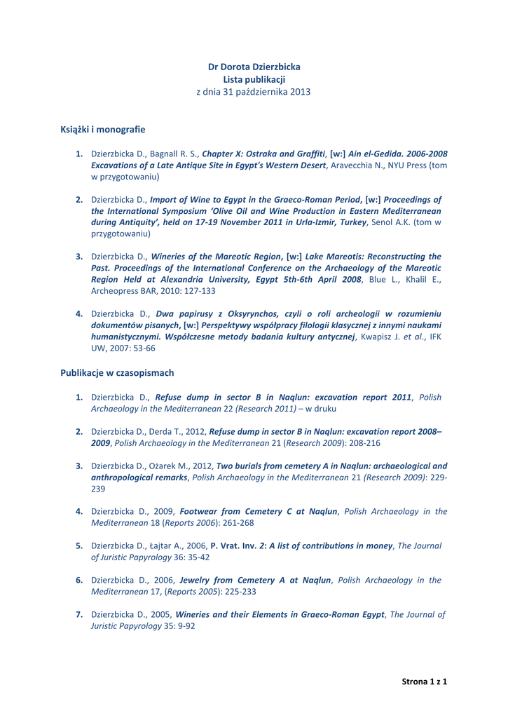 Dr Dorota Dzierzbicka Lista publikacji z dnia 31 października 2013