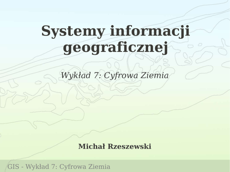 Systemy informacji geograficznej Wykład 7: Cyfrowa Ziemia Michał Rzeszewski GIS - Wykład 7: Cyfrowa Ziemia Od Wielkich Odkryć do Cyfrowej Ziemi Henryk Żeglarz Al Gore źródło: http://wikipedia.pl GIS - Wykład 7: Cyfrowa Ziemia Cyfrowa Ziemia - Digital Earth ● ● Gore, A., 1992: Earth in the balance: Ecology and the human spirit. Boston, Houghton Mifflin Gore, A., 1998: Digital Earth-Understanding our planet in the 21st Century. Referat wygłoszony 31 stycznia 1998 w California Science Center GIS - Wykład 7: Cyfrowa Ziemia Koncepcja Cyfrowej Ziemi (DE) ● ● Postęp technologiczny umożliwia gromadzenie i przechowywanie ogromnej ilości danych; Zgromadzona wiedza jest i pozostaje niewykorzystana; GIS - Wykład 7: Cyfrowa Ziemia zbyt obszerna LANDSAT ● Program LANDSAT – zdjęcia w rozdzielczości przestrzennej 60-15m – rozdzielczość czasowa 16 dni – co 16 dni, od 1984 roku powstaje niemal pełny obraz powierzchni Ziemi w kilku kanałach spektralnych GIS - Wykład 7: Cyfrowa Ziemia Jezioro Carnegie, Australia, Landsat 7 źródło: http://earthobservatory.nasa.gov Koncepcja Cyfrowej Ziemi (DE) ● ● ● ● Postęp technologiczny umożliwia gromadzenie i przechowywanie ogromnej ilości danych; Zgromadzona wiedza jest i pozostaje niewykorzystana; zbyt obszerna Cyfrowa Ziemia (Digital Earth) - jako sposób powiązania i wizualizacji wszystkich informacji w sposób naturalny dla ludzkiego sposobu postrzegania; Realizacja może nastąpić wyłącznie jako inicjatywa oddolna, społeczna (grassroots) GIS - Wykład 7: Cyfrowa Ziemia Cyfrowa Ziemia ● Brak jednoznacznej definicji ● Definicja robocza: Cyfrowa Ziemia - wirtualna reprezentacja planety, pozwalająca na jej zdalną eksplorację oraz interakcję z całym zasobem opisujących ją danych GIS - Wykład 7: Cyfrowa Ziemia Cyfrowa Ziemia - technologie ● ● Dostępne „od ręki” : – Informatyka: moce obliczeniowe i możliwość magazynowania danych; – Obrazowanie: wysokorozdzielcze techniki teledetekcji; – Komunikacja: szerokopasmowy dostęp do internetu. Optymistyczna przyszłość: – Interoperacyjność: dane niezależne od miejsca, systemu i oprogramowania; – Metadane: pełny opis pochodzenia i rodzaju. GIS - Wykład 7: Cyfrowa Ziemia Cyfrowa Ziemia - potencjalne aplikacje ● ● ● ● ● Wirtualna dyplomacja - mniej abstrakcyjne granice, geopolityka Przestępczość - terytoria wpływów, świadomość społeczna Bioróżnorodność - kompilacja i wizualizacja danych Zmiany klimatu - aspekt globalny obserwowanych procesów i zjawisk Rolnictwo precyzyjne - dostęp do informacji przestrzennej GIS - Wykład 7: Cyfrowa Ziemia Cyfrowa Ziemia - potencjalne aplikacje ● ● ● ● ● Wirtualna dyplomacja - mniej abstrakcyjne granice, geopolityka Przestępczość - terytoria wpływów, świadomość społeczna Bioróżnorodność - kompilacja i wizualizacja danych Zmiany klimatu - aspekt globalny obserwowanych procesów i zjawisk Rolnictwo precyzyjne - dostęp do informacji przestrzennej GIS - Wykład 7: Cyfrowa Ziemia Cyfrowa Ziemia - mapy przestępczości GIS - Wykład 7: Cyfrowa Ziemia Cyfrowa Ziemia - potencjalne aplikacje ● ● ● ● ● Wirtualna dyplomacja - mniej abstrakcyjne granice, geopolityka Przestępczość - terytoria wpływów, świadomość społeczna Bioróżnorodność i ochrona środowiska kompilacja i wizualizacja danych Zmiany klimatu - aspekt globalny obserwowanych procesów i zjawisk Rolnictwo precyzyjne - dostęp do informacji przestrzennej GIS - Wykład 7: Cyfrowa Ziemia Cyfrowa Ziemia - monitoring katastrof GIS - Wykład 7: Cyfrowa Ziemia Cyfrowa Ziemia - potencjalne aplikacje ● ● ● ● ● Wirtualna dyplomacja - mniej abstrakcyjne granice, geopolityka Przestępczość - terytoria wpływów, świadomość społeczna Bioróżnorodność - kompilacja i wizualizacja danych Zmiany klimatu - aspekt globalny obserwowanych procesów i zjawisk Rolnictwo precyzyjne - dostęp do informacji przestrzennej GIS - Wykład 7: Cyfrowa Ziemia Cyfrowa Ziemia - potencjalne aplikacje ● ● ● ● ● Wirtualna dyplomacja - mniej abstrakcyjne granice, geopolityka Przestępczość - terytoria wpływów, świadomość społeczna Bioróżnorodność - kompilacja i wizualizacja danych Zmiany klimatu - aspekt globalny obserwowanych procesów i zjawisk Rolnictwo precyzyjne - dostęp do informacji przestrzennej GIS - Wykład 7: Cyfrowa Ziemia Organizacja i rozwój ● US Digital Earth Initiative (do 2001), póżniej: US Government’s Interagency Digital Earth Working Group (IDEW) Alexandria Digital Earth Prototype (ADEPT) - na rycinie obecnie działająca Alexandria Digital Library (ADL) GIS - Wykład 7: Cyfrowa Ziemia Organizacja i rozwój ● International Society for Digital Earth (ISDE) International Journal of Digital Earth GIS - Wykład 7: Cyfrowa Ziemia http://www.digitalearth-isde.org/ Istniejące komponenty ● Infrastruktury Danych Przestrzennych (SDI Spatial Data Infrastructures): zespół środków prawnych, organizacyjnych, ekonomicznych i technicznych, które powszechny dostęp do danych i usług geoinformacyjnych określonego obszaru, przyczyniają się do efektywnego geoinformacji dla zrównoważonego rozwoju tego obszaru, racjonalne gospodarowanie zasobami geoinformacyjnymi 2004) – istnieją od lat 90-tych – nacisk na interoperacyjność – otwarte technologie – w Europie: INSPIRE GIS - Wykład 7: Cyfrowa Ziemia zapewniają dotyczących stosowania umożliwiają (Gaździcki Istniejące komponenty ● Sieci geo-sensorów – istniejące lub nowo-tworzone sieci sensorów wzbogacone o możliwość sieciowej komunikacji, organizacji, zdalnego zarządzania i wymiany informacji z innymi systemami GIS - Wykład 7: Cyfrowa Ziemia Istniejące komponenty ● Sieci geo-sensorów – GEOSS (Global Earth Observation System of System) ma za zadanie łączyć istniejące systemy, zapewniając interoperacyjność i otwartość GIS - Wykład 7: Cyfrowa Ziemia Istniejące komponent