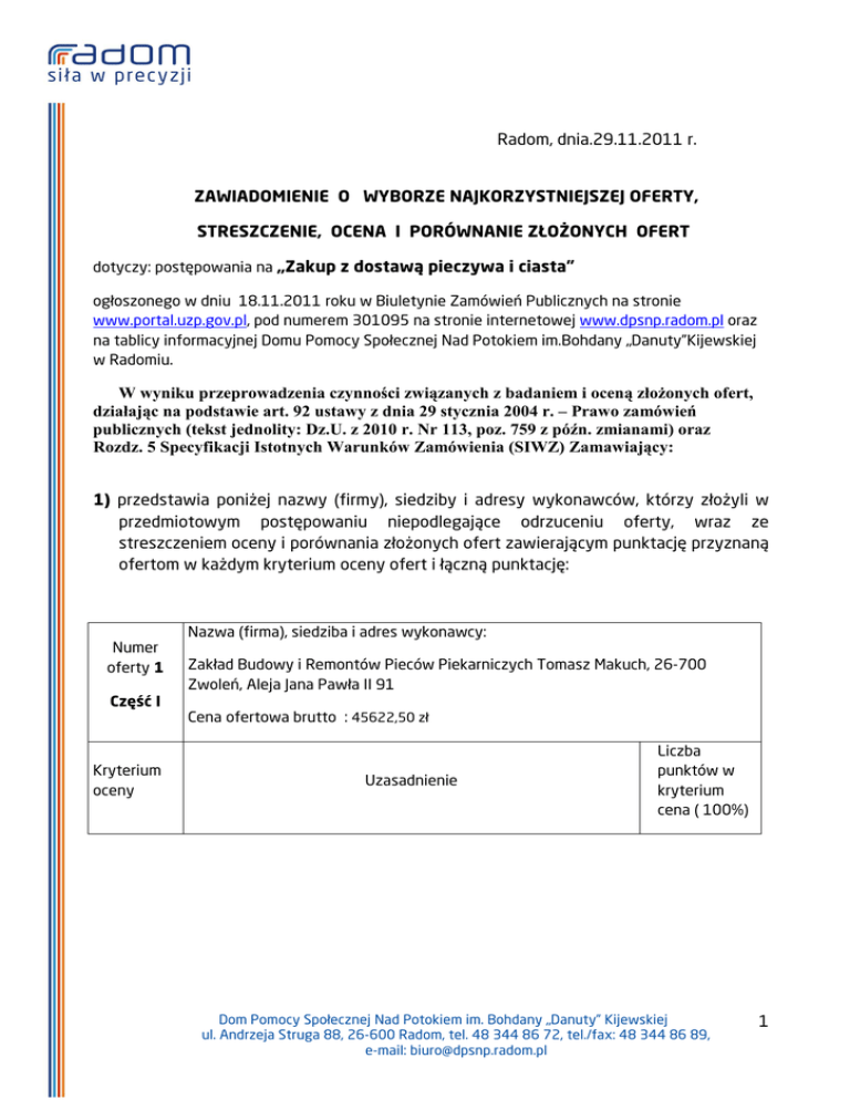 1 Radom, dnia.29.11.2011 r. ZAWIADOMIENIE O WYBORZE