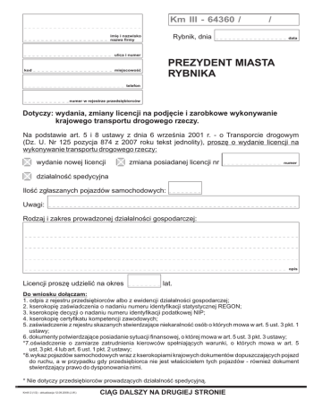 Km III - 64360 / / Rybnik, dnia imiê i nazwisko nazwa firmy data ulica i numer kod PREZYDENT MIASTA RYBNIKA miejscowoœæ telefon numer w rejestrze przedsiêbiorców Dotyczy: wydania, zmiany licencji na podjêcie i zarobkowe wykonywanie krajowego transportu drogowego rzeczy. Na podstawie art. 5 i 8 ustawy z dnia 6 wrzeœnia 2001 r. - o Transporcie drogowym (Dz. U. Nr 125 pozycja 874 z 2007 roku tekst jednolity), proszê o wydanie licencji na wykonywanie transportu drogowego rzeczy: wydanie nowej licencji zmiana posiadanej licencji nr numer dzia³alnoœæ spedycyjna Iloœæ zg³aszanych pojazdów samochodowych: Uwagi: Rodzaj i zakres prowadzonej dzia³alnoœci gospodarczej: opis Licencji proszê udzieliæ na okres lat. Do wniosku do³¹czam: 1. odpis z rejestru przedsiêbiorców albo z ewidencji dzia³alnoœci gospodarczej; 2. kserokopiê zaœwiadczenia o nadaniu numeru identyfikacji statystycznej REGON; 3. kserokopiê decyzji o nadaniu numeru identyfikacji podatkowej NIP; 4. kserokopiê certyfikatu kompetencji zawodowych; 5. zaœwiadczenie z rejestru skazanych stwierdzaj¹ce niekaralnoœæ osób o których mowa w art. 5 ust. 3 pkt. 1 ustawy; 6. dokumenty potwierdzaj¹ce posiadanie sytuacji finansowej, o której mowa w art. 5 ust. 3 pkt. 3 ustawy; *7.oœwiadczenie o zamiarze zatrudnienia kierowców spe³niaj¹cych warunki, o których mowa w art. 5 ust. 3 pkt. 4 lub art. 6 ust. 1 pkt. 2 ustawy; *8.wykaz pojazdów samochodowych wraz z kserokopiami krajowych dokumentów dopuszczaj¹cych pojazd do ruchu, a w przypadku gdy przedsiêbiorca nie jest w³aœcicielem tych pojazdów - równie¿ dokument stwierdzaj¹cy prawo do dysponowania nimi. * Nie dotyczy przedsiêbiorców prowadz¹cych dzia³alnoœæ spedycyjn¹. KK £K KmIII 2 (1/2) - aktualizacja 12.09.2008 (J.W.) CI¥G DALSZY NA DRUGIEJ STRONIE Dodatkowo nale¿y do³¹czyæ formularze: - w przypadku zmian w wydanej licencji: L.p. Rodzaj zmian Numer formularza 1. Zmiana adresu siedziby 2. Zmiana nazwy 3. Wpisania uzyskanego numeru KRS Zmiana sk³adu osobowego przedsiêbiorców dzia³aj¹cych na 4. podstawie umowy spó³ki cywilnej 5. Zmiana liczby pojazdów TDR-2 TDR-3 TDR-4 TDR-5a/5b TDR-9 - w przypadku przeniesienia uprawnieñ licencyjnych: L.p. Rodzaj zmian Numer formularza 1. Przekszta³cenie, podzia³, po³¹czenie Przejêcie dzia³alnoœci w zakresie krajowego transportu 2. drogowego osób od innego przedsiêbiorcy posiadaj¹cego licencjê Przejêcie dzia³alnoœci w zakresie krajowego transportu 3. drogowego osób na skutek œmierci przedsiêbiorcy posiadaj¹cego licencjê TDR-6 TDR-7 TDR-8 w³aœciwe zakreœliæ podpis (-y) wnioskodawcy KK £K WYDANIE LICENCJI NA WYKONYWANIE TRANSPORTU RZECZY - OBJAŒNIENIA 1. Za wydanie licencji pobiera siê op³atê (kwit kasowy): - 800 z³ na okres 2-15 lat; - 900 z³ na okres 16-30 lat; - 1000 z³ na okres 31-50 lat; oraz dodatkowo po 11% z tych kwot za wydanie wypisu z licencji na ka¿dy zg³oszony pojazd. Wp³aty nale¿y dokonaæ na konto Urzêdu Miasta Rybnika ul. B. Chrobrego 2, 44-200 Rybnik, Nr: 40150012141212100526570000 Bank: KREDYT BANK S.A. I O/Rybnik, z dopiskiem “Za wydanie licencji - TDR”. 2. Wniosek wraz z za³¹cznikami nale¿y z³o¿yæ w Kancelarii Urzêdu Miasta (parter, przy wejœciu). 3. Szczegó³owe informacje oraz formularze s¹ do pobrania w Wydziale Komunikacji Urzêdu Miasta Rybnika (parter, pokój 056), tel. 032 439 20 56. Regulacja prawna: 1. Ustawa z dnia 6 wrzeœnia 2001 r. - o Transporcie drogowym (Dz. U. Nr 125 pozycja 874 z 2007 roku tekst jednolity); 2. Rozporz¹dzenie Ministra Infrastruktury z dnia 4 grudnia 2007 r. - W sprawie wysokoœci op³at za czynnoœci administracyjne zwi¹zane z wykonywaniem przewozu drogowego oraz za egzaminowanie i wydanie certyfikatu kompetencji zawodowych (Dz. U. Nr 235, pozycja 1726). KK £K Potwierdzam odbiór licencji * oraz wypisów* w iloœci * nieporzebne skreœliæ KmIII 2 (2/2) - aktualizacja 12.09.2008 (J.W.) sztuk w dniu data czytelny podpis