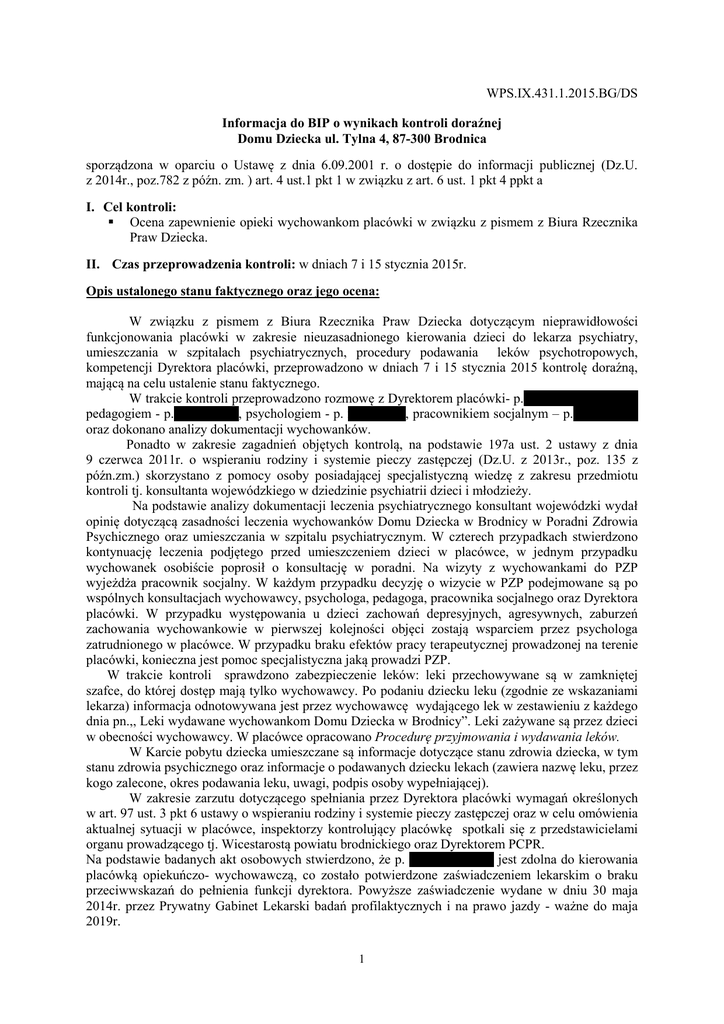 WPS.IX.431.1.2015.BG/DS Informacja do BIP o wynikach kontroli doraźnej Domu Dziecka ul. Tylna 4, 87-300 Brodnica sporządzona w oparciu o Ustawę z dnia 6.09.2001 r. o dostępie do informacji publicznej (Dz.U. z 2014r., poz.782 z późn. zm. ) art. 4 ust.1 pkt 1 w związku z art. 6 ust. 1 pkt 4 ppkt a I. Cel kontroli: Ocena zapewnienie opieki wychowankom placówki w związku z pismem z Biura Rzecznika Praw Dziecka. II. Czas przeprowadzenia kontroli: w dniach 7 i 15 stycznia 2015r. Opis ustalonego stanu faktycznego oraz jego ocena: W związku z pismem z Biura Rzecznika Praw Dziecka dotyczącym nieprawidłowości funkcjonowania placówki w zakresie nieuzasadnionego kierowania dzieci do lekarza psychiatry, umieszczania w szpitalach psychiatrycznych, procedury podawania leków psychotropowych, kompetencji Dyrektora placówki, przeprowadzono w dniach 7 i 15 stycznia 2015 kontrolę doraźną, mającą na celu ustalenie stanu faktycznego. W trakcie kontroli przeprowadzono rozmowę z Dyrektorem placówki- p.xxxxxxx xxxxxxxxx, pedagogiem - p.xxxxxxxx x, psychologiem - p. xxxxxx xx, pracownikiem socjalnym – p.xxxxx xxxx oraz dokonano analizy dokumentacji wychowanków. Ponadto w zakresie zagadnień objętych kontrolą, na podstawie 197a ust. 2 ustawy z dnia 9 czerwca 2011r. o wspieraniu rodziny i systemie pieczy zastępczej (Dz.U. z 2013r., poz. 135 z późn.zm.) skorzystano z pomocy osoby posiadającej specjalistyczną wiedzę z zakresu przedmiotu kontroli tj. konsultanta wojewódzkiego w dziedzinie psychiatrii dzieci i młodzieży. Na podstawie analizy dokumentacji leczenia psychiatrycznego konsultant wojewódzki wydał opinię dotyczącą zasadności leczenia wychowanków Domu Dziecka w Brodnicy w Poradni Zdrowia Psychicznego oraz umieszczania w szpitalu psychiatrycznym. W czterech przypadkach stwierdzono kontynuację leczenia podjętego przed umieszczeniem dzieci w placówce, w jednym przypadku wychowanek osobiście poprosił o konsultację w poradni. Na wizyty z wychowankami do PZP wyjeżdża pracownik socjalny. W każdym przypadku decyzję o wizycie w PZP podejmowane są po wspólnych konsultacjach wychowawcy, psychologa, pedagoga, pracownika socjalnego oraz Dyrektora placówki. W przypadku występowania u dzieci zachowań depresyjnych, agresywnych, zaburzeń zachowania wychowankowie w pierwszej kolejności objęci zostają wsparciem przez psychologa zatrudnionego w placówce. W przypadku braku efektów pracy terapeutycznej prowadzonej na terenie placówki, konieczna jest pomoc specjalistyczna jaką prowadzi PZP. W trakcie kontroli sprawdzono zabezpieczenie leków: leki przechowywane są w zamkniętej szafce, do której dostęp mają tylko wychowawcy. Po podaniu dziecku leku (zgodnie ze wskazaniami lekarza) informacja odnotowywana jest przez wychowawcę wydającego lek w zestawieniu z każdego dnia pn.,, Leki wydawane wychowankom Domu Dziecka w Brodnicy”. Leki zażywane są przez dzieci w obecności wychowawcy. W placówce opracowano Procedurę przyjmowania i wydawania leków. W Karcie pobytu dziecka umieszczane są informacje dotyczące stanu zdrowia dziecka, w tym stanu zdrowia psychicznego oraz informacje o podawanych dziecku lekach (zawiera nazwę leku, przez kogo zalecone, okres podawania leku, uwagi, podpis osoby wypełniającej). W zakresie zarzutu dotyczącego spełniania przez Dyrektora placówki wymagań określonych w art. 97 ust. 3 pkt 6 ustawy o wspieraniu rodziny i systemie pieczy zastępczej oraz w celu omówienia aktualnej sytuacji w placówce, inspektorzy kontrolujący placówkę spotkali się z przedstawicielami organu prowadzącego tj. Wicestarostą powiatu brodnickiego oraz Dyrektorem PCPR. Na podstawie badanych akt osobowych stwierdzono, że p. xxxxxxx xxxxx jest zdolna do kierowania placówką opiekuńczo- wychowawczą, co zostało potwierdzone zaświadczeniem lekarskim o braku przeciwwskazań do pełnienia funkcji dyrektora. Powyższe zaświadczenie wydane w dniu 30 maja 2014r. przez Prywatny Gabinet Lekarski badań profilaktycznych i na prawo jazdy - ważne do maja 2019r. 1 Na podstawie podjętych działań kontrolnych ustalono, co następuje: 1. W zakresie kierowania dzieci do lekarza psychiatry- bez zastrzeżeń. 2. W zakresie procedury podawania i przechowywania leków psychotropowych- bez zastrzeżeń. 3. W zakresie umieszczania w szpitalach psychiatrycznych- bez zastrzeżeń ( zgoda opiekuna prawnego lub na podstawie art.23 ustawy z dnia 19 sierpnia 1994r. o ochronie zdrowia psychicznego- Dz.U.z 2011r., Nr 231, poz. 1375 z późn.zm.). 4. W zakresie wymagań dla osoby kierującej placówką opiekuńczo-wychowawczą określonych w art. 97 ust.3 pkt 6 ustawy o wspieraniu rodziny i systemie pieczy zastępczej – bez zastrzeżeń. Na podstawie ustaleń zawartych w sprawozdaniu skontrolowaną działalność ocenia się pozytywnie . Zespół kontrolny: Samodzielny Zespół ds. Wspierania Rodziny i Systemu Pieczy Zastępczej Wydziału Polityki Społecznej Zatwierdził: Dyrektor Wydziału Polityki Społecznej 2