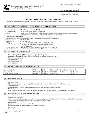 Płyn do ręcznego mycia naczyń „MIŚ” Przedsiębiorstwo Wielobranżowe "ROKO-DAR” 76-150 Darłowo, Rusko 33 tel/fax. 94 3144533 www.rokodar.pl Płyn do mycia naczyń „MIŚ” Data aktualizacji: 21-10-2009 r. KARTA CHARAKTERYSTYKI PREPARATU Podstawa: Rozporządzenie (WE) nr 1907/2006 Parlamentu Europejskiego i Rady z dnia 18 grudnia 2006 ws. REACH 1. IDENTYFIKACJA PREPARATU / IDENTYFIKACJA PRODUCENTA 1.1 Nazwa handlowa: 1.2 Zastosowanie: 1.3 Opis: Płyn do mycia naczyń „MIŚ” Do ręcznego mycia naczyń kuchennych. Wodny roztwór anionowych i niejonowych środków powierzchniowo-czynnych, substancji wspomagających, kompozycji zapachowej, barwnika i konserwanta 1.4 Identyfikacja producenta: Nazwa i adres firmy: P.W. „ROKO-DAR” Piotr Dassuj, 76-150 Darłowo, Rusko 33 Numer telefonu: 48 94 3144533 Numer faksu: 48 94 3144533 1.5 Telefony alarmowe producent: 48 94 3144533 GSM +48 606 345 173 42 631 47 24 (informacja toksykologiczna w Polsce) 998 Straż Pożarna 1.6 Kartę opracował: Piotr Dassuj; e-mail: [email protected] ; tel. 48 94 3144533 2. IDENTYFIKACJA ZAGROŻEŃ Preparat nie jest sklasyfikowany jako preparat niebezpieczny Opakowanie jednostkowe nie wymaga znakowania ostrzegawczego – patrz pkt. 15. Własności niebezpieczne: nie stwierdzono Zagrożenie środowiska: nie stwierdzono 3. SKŁAD I INFORMACJA O SKŁADNIKACH Nazwa składnika Pasta ABS Na Sodium laureth sulfate 4. WE 246-680-4 Polimer CAS 25155-30-0 68585-34-2 Zawartość 5,0-10,0 % 5,0-10,0 % Klasyfikacja Xn; Xi Xi Zwroty R R 22; R 36/38 R 38-41 PIERWSZA POMOC Kontakt ze skórą: Zdjąć natychmiast zanieczyszczoną odzież. Umyć zanieczyszczoną skórę dużą ilością bieżącej wody. Kontakt z oczami: W razie kontaktu z oczami płukać dużą ilością wody oraz zapewnić pomoc lekarską Połknięcie: Podać poszkodowanemu do wypicia szklankę chłodnej wody. Wezwać lekarza. Nie wywoływać wymiotów. 5. POSTĘPOWANIE W PRZYPADKU POŻARU Zalecane środki gaśnicze: Preparat nie jest produktem palnym. Pożar w obecności płynu gasić środkami odpowiednimi dla palących się substancji. Zagrożenie ze strony produktów spalania i wydzielających się gazów: Nie określono Specjalne wyposażenie ochronne strażaków: Aparat izolujący drogi oddechowe i pełne ubranie ochronne Inne uwagi: Nie określono Karta opracowana przez firmę ROKO-DAR 1z4 Strona Płyn do ręcznego mycia naczyń „MIŚ” 6. POSTĘPOWANIE W PRZYPADKU NIEZAMIERZONEGO UWOLNIENIA DO ŚRODOWISKA Środki ostrożności w zakresie ochrony środowiska: Powstrzymać wyciek. Nie dopuścić do przedostania się produktu do kanalizacji, wód powierzchniowych i wód gruntowych. W przypadku uwolnienia dużych ilości lub skażenia środowiska powiadomić władze i służby ratownictwa chemicznego Metody usuwania / oczyszczania: Usuwać mechanicznie. Pozostałość spłukać dużą ilością wody. Małe ilości produktu rozcieńczać dużą ilością wody. 7. POSTĘPOWANIE Z PREPARATEM I JEGO MAGAZYNOWANIE Postępowanie z preparatem: Przestrzegać zasad i przepisów BHP dotyczących pracy z chemikaliami. Magazynowanie: Magazynować w chłodnych i przewiewnych pomieszczeniach. Przechowywać w oryginalnych, szczelnie zamkniętych pojemnikach.. 8. KONTROLA NARAŻENIA I ŚRODKI OCHRONY OSOBISTEJ Stosowane środki ochrony osobistej powinny spełniać wymogi Rozporządzenia Ministra Gospodarki z dnia 21 grudnia 2005 r. w sprawie zasadniczych wymagań dla środków ochrony indywidualnej (Dz. U. nr 259, poz. 2173) Ochrona rąk: Nie jest wymagana Ochrona oczu: Nie jest wymagana Ochrona dróg oddechowych: nie ma specjalnych zaleceń Ochrona ciała: Nie jest wymagana Inne wyposażenie ochronne: nie określono Kontrola zagrożenia: NDS i NDSCh: nie ustalono Zalecenia dotyczące procedury monitoringu zawartości składników niebezpiecznych w powietrzu - metodyka pomiarów: - Rozporządzenie Ministra Zdrowia z dnia 20 kwietnia 2005 r. w sprawie badań i pomiarów czynników szkodliwych dla zdrowia w środowisku pracy ( Dz. U. Nr 73, poz.645) - PN-89/Z-01001/06. Ochrona czystości powietrza. Nazwy, określenia i jednostki. Terminologia dotycząca badań jakości powietrza na stanowiskach pracy. - PN Z-04008-7:2002. Ochrona czystości powietrza. Pobieranie próbek. Zasady pobierania próbek powietrza w środowisku pracy i interpretacja wyników. - PN-EN-689: 2002. Powietrze na stanowiskach pracy - wytyczne oceny narażenia inhalacyjnego na czynniki chemiczne przez porównanie z wartościami dopuszczalnymi i strategia pomiarowa. Uwaga: Gdy stężenie substancji jest ustalone i znane, doboru środków ochrony indywidualnej należy dokonywać z uwzględnieniem stężenia substancji występującego na danym stanowisku pracy, czasu ekspozycji oraz czynności wykonywanych przez pracownika. W sytuacji awaryjnej, jeżeli stężenie substancji na stanowisku pracy nie jest znane, stosować środki ochrony indywidualnej o najwyższej zalecanej klasie ochrony. Pracodawca jest obowiązany zapewnić, aby stosowane środki ochrony indywidualnej oraz odzież i obuwie robocze posiadały właściwości ochronne i użytkowe oraz zapewnić odpowiednie ich pranie, konserwacje, naprawę i odkażanie. Zalecane badania wstępne i okresowe pracowników należy przeprowadzać zgodnie z Rozporządzeniem Ministra Zdrowia i Opieki Społecznej z dnia 30 maja 1996 r. w sprawie przeprowadzania badań lekarskich pracowników, zakresu profilaktycznej opieki zdrowotnej nad pracownikami oraz orzeczeń lekarskich wydanych do celów przewidzianych w Kodeksie Pracy ( Dz. U. Nr 69/1996r. póz. 332, ze zmianami Dz. U. Nr37/2001r. póz. 451) 9. WŁAŚCIWOŚCI FIZYKOCHEMICZNE Postać: Kolor: Zapach: pH (preparat 10 %) temp. wrzenia: temp. top/krzep: klarowny lepki płyn bez zanieczyszczeń mechanicznych w zależności od zastosowanego barwnika: najczęściej żółty lub zielony w zależności od zastosowanej kompozycji: najczęściej cytrynowy lub miętowy 7,0 – 7,6 ok. 100oC ok. 0 oC Karta opra