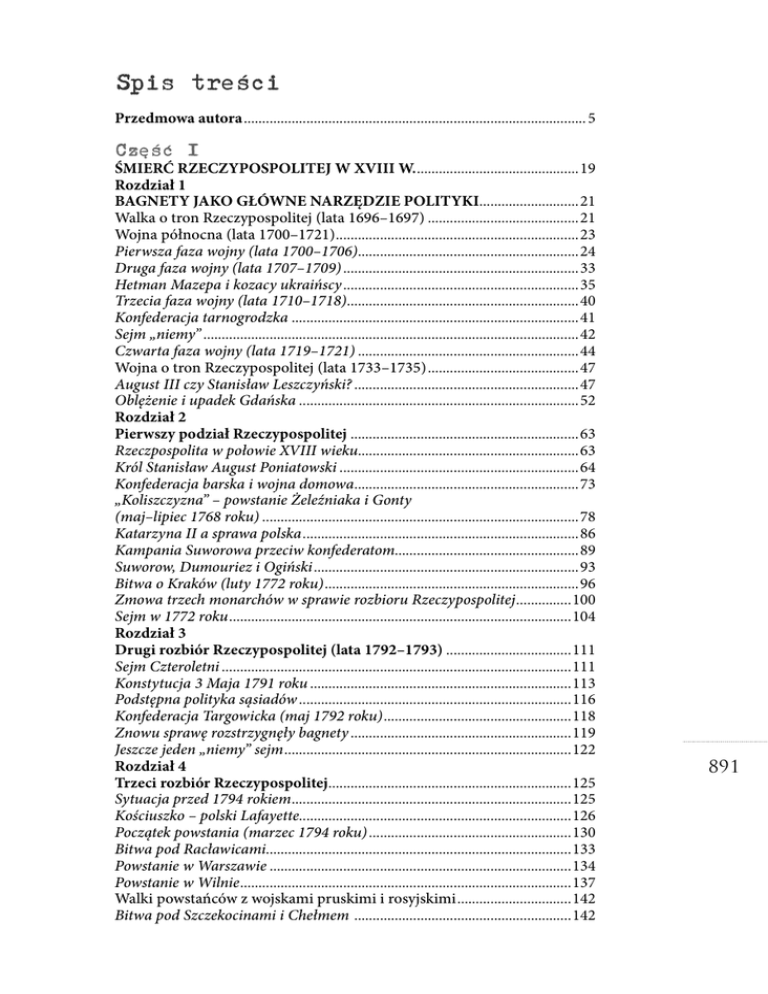 Spis treści Przedmowa autora ............................................................................................. 5 Część I ŚMIERĆ RZECZYPOSPOLITEJ W XVIII W. ............................................19 Rozdział 1 BAGNETY JAKO GŁÓWNE NARZĘDZIE POLITYKI...........................21 Walka o tron Rzeczypospolitej (lata 1696–1697) .........................................21 Wojna północna (lata 1700–1721) ..................................................................23 Pierwsza faza wojny (lata 1700–1706)............................................................24 Druga faza wojny (lata 1707–1709) ................................................................33 Hetman Mazepa i kozacy ukraińscy ................................................................35 Trzecia faza wojny (lata 1710–1718)...............................................................40 Konfederacja tarnogrodzka ..............................................................................41 Sejm „niemy” ......................................................................................................42 Czwarta faza wojny (lata 1719–1721) ............................................................44 Wojna o tron Rzeczypospolitej (lata 1733–1735) .........................................47 August III czy Stanisław Leszczyński? .............................................................47 Oblężenie i upadek Gdańska ............................................................................52 Rozdział 2 Pierwszy podział Rzeczypospolitej ..............................................................63 Rzeczpospolita w połowie XVIII wieku............................................................63 Król Stanisław August Poniatowski .................................................................64 Konfederacja barska i wojna domowa.............................................................73 „Koliszczyzna” – powstanie Żeleźniaka i Gonty (maj–lipiec 1768 roku) ......................................................................................78 Katarzyna II a sprawa polska ...........................................................................86 Kampania Suworowa przeciw konfederatom..................................................89 Suworow, Dumouriez i Ogiński ........................................................................93 Bitwa o Kraków (luty 1772 roku) .....................................................................96 Zmowa trzech monarchów w sprawie rozbioru Rzeczypospolitej ...............100 Sejm w 1772 roku .............................................................................................104 Rozdział 3 Drugi rozbiór Rzeczypospolitej (lata 1792–1793) ..................................111 Sejm Czteroletni ...............................................................................................111 Konstytucja 3 Maja 1791 roku .......................................................................113 Podstępna polityka sąsiadów ..........................................................................116 Konfederacja Targowicka (maj 1792 roku) ...................................................118 Znowu sprawę rozstrzygnęły bagnety ............................................................119 Jeszcze jeden „niemy” sejm ..............................................................................122 Rozdział 4 Trzeci rozbiór Rzeczypospolitej..................................................................125 Sytuacja przed 1794 rokiem ............................................................................125 Kościuszko – polski Lafayette..........................................................................126 Początek powstania (marzec 1794 roku) .......................................................130 Bitwa pod Racławicami...................................................................................133 Powstanie w Warszawie ..................................................................................134 Powstanie w Wilnie ..........................................................................................137 Walki powstańców z wojskami pruskimi i rosyjskimi ...............................142 Bitwa pod Szczekocinami i Chełmem ...........................................................142 891 Obrona Warszawy ...........................................................................................144 Działania na Litwie .........................................................................................145 Klęska Sierakowskiego i Kościuszki .............................................................147 Bitwa pod Krupczycami ..................................................................................147 Bitwa pod Maciejowicami...............................................................................148 Zdobycie Warszawy przez Suworowa ............................................................150 Likwidacja Rzeczypospolitej..........................................................................161 Losy Kościuszki.................................................................................................168 Część II 892 POLSKI RUCH NARODOWOWYZWOLEŃCZY W XIX WIEKU Rozdział 1 Próba odrodzenia Polski i Wielkiego Księstwa Litewskiego ................173 Konsekwencje rozbiorów Rzeczypospolitej ....................................................173 Nadzieja Polaków – Napoleon I .....................................................................176 Księstwo Warszawskie .....................................................................................178 Napoleon I i Aleksander I................................................................................183 Nadzieja Polaków i Litwinów – Aleksander I ...............................................186 Inwazja „Wielkiej Armii”......................