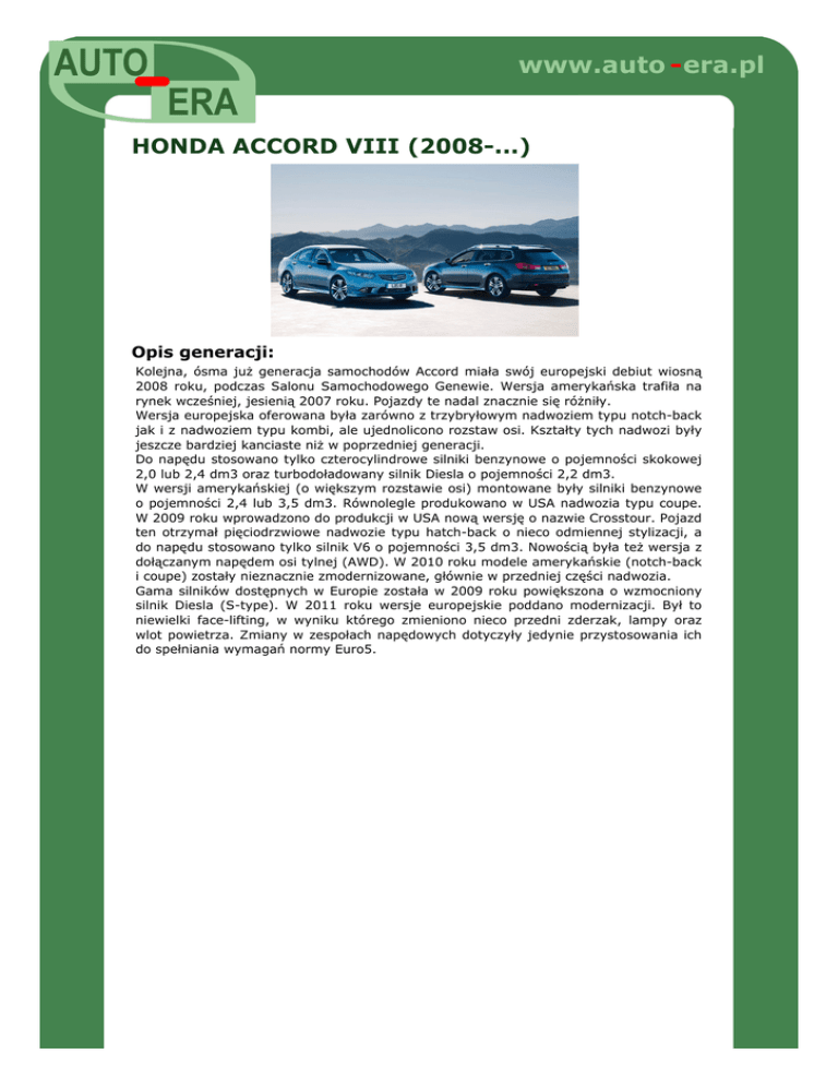 www.auto - era.pl HONDA ACCORD VIII (2008-...) Opis generacji: Kolejna, ósma już generacja samochodów Accord miała swój europejski debiut wiosną 2008 roku, podczas Salonu Samochodowego Genewie. Wersja amerykańska trafiła na rynek wcześniej, jesienią 2007 roku. Pojazdy te nadal znacznie się różniły. Wersja europejska oferowana była zarówno z trzybryłowym nadwoziem typu notch-back jak i z nadwoziem typu kombi, ale ujednolicono rozstaw osi. Kształty tych nadwozi były jeszcze bardziej kanciaste niż w poprzedniej generacji. Do napędu stosowano tylko czterocylindrowe silniki benzynowe o pojemności skokowej 2,0 lub 2,4 dm3 oraz turbodoładowany silnik Diesla o pojemności 2,2 dm3. W wersji amerykańskiej (o większym rozstawie osi) montowane były silniki benzynowe o pojemności 2,4 lub 3,5 dm3. Równolegle produkowano w USA nadwozia typu coupe. W 2009 roku wprowadzono do produkcji w USA nową wersję o nazwie Crosstour. Pojazd ten otrzymał pięciodrzwiowe nadwozie typu hatch-back o nieco odmiennej stylizacji, a do napędu stosowano tylko silnik V6 o pojemności 3,5 dm3. Nowością była też wersja z dołączanym napędem osi tylnej (AWD). W 2010 roku modele amerykańskie (notch-back i coupe) zostały nieznacznie zmodernizowane, głównie w przedniej części nadwozia. Gama silników dostępnych w Europie została w 2009 roku powiększona o wzmocniony silnik Diesla (S-type). W 2011 roku wersje europejskie poddano modernizacji. Był to niewielki face-lifting, w wyniku którego zmieniono nieco przedni zderzak, lampy oraz wlot powietrza. Zmiany w zespołach napędowych dotyczyły jedynie przystosowania ich do spełniania wymagań normy Euro5.
