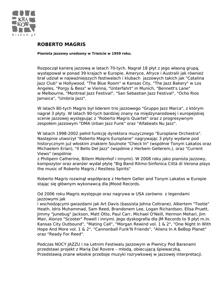ROBERTO MAGRIS Pianista jazzowy urodzony w Trieście w 1959 roku. Rozpoczął karierę jazzową w latach 70-tych. Nagrał 18 płyt z jego własną grupą, występował w ponad 39 krajach w Europie, Ameryce, Afryce i Australii jak również brał udział w najważniejszych festiwalach i klubach jazzowych takich jak "Catalina Jazz Club" w Hollywood, "The Blue Room" w Kansas City, "The Jazz Bakery" w Los Angeles, "Porgy & Bess" w Vienna, "Unterfahrt" in Munich, "Bennett's Lane" w Melbourne, "Montreal Jazz Festival", "San Sebastian Jazz Festival", "Ocho Rios Jamaica", "Umbria Jazz". W latach 80-tych Magris był liderem trio jazzowego "Gruppo Jazz Marca", z którym nagrał 3 płyty. W latach 90-tych bardziej znany na międzynarodowej i europejskiej scenie jazzowej występując z "Roberto Magris Quartet" oraz z progresywnym zespołem jazzowym "DMA Urban Jazz Funk" oraz "Alfabeats Nu Jazz". W latach 1998-2002 pełnił funkcję dyrektora muzycznego "Europlane Orchestra". Następnie utworzył "Roberto Magris Europlane" nagrywając 3 płyty wydane pod historycznym już włoskim znakiem Soulnote "Check In" (współnie Tonym Lakatos oraz Michaelem Erian), "Il Bello Del Jazz" (wspólnie z Herbem Gellerem,), oraz "Current Views" (wspólnie z Philipem Catherine, Billem Molenhof i innymi). W 2008 roku jako pianista jazzowy, kompozytor oraz aranżer wydał płytę "Big Band Ritmo-Sinfonica Città di Verona plays the music of Roberto Magris / Restless Spirits" Roberto Magris rozwinął współpracę z Herbem Geller and Tonym Lakatos w Europie stając się głównym wykonawcą dla JMood Records. Od 2006 roku Magris występuje oraz nagrywa w USA zarówno z legendami jazzowymi jak i wschodzącymi gwiazdami jak Art Davis (bassista Johna Coltrane), Albertem "Tootie" Heath, Idris Muhammad, Sam Reed, Brandonem Lee, Logan Richardson, Elisa Pruett, Jimmy "Junebug" Jackson, Matt Otto, Paul Carr, Michael O'Neill, Hermon Mehari, Jim Mair, Alonzo "Scooter" Powell i innymi. Jego dyskografia dla JM Records to 9 płyt m.in. Kansas City Outbound", "Mating Call", "Morgan Rewind vol. 1 & 2", "One Night In With Hope And More vol. 1 & 2", "Cannonball Funk'N Friends", "Aliens In A BeBop Planet" oraz "Ready For Reed". Podczas NOCY JAZZU i na Letnim Festiwalu Jazzowym w Piwnicy Pod Baranami przedstawi projekt z Marią Dal Rovere – młodą, obiecującą śpiewaczką. Przedstawią znane włoskie przeboje muzyki rozrywkowej w jazzowej interpretacji. Powered by TCPDF (www.tcpdf.org)