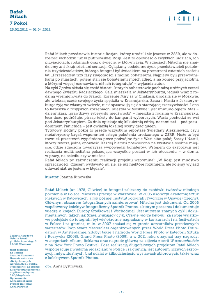 Rafał Milach 7 Pokoi 25.02.2012 — 01.04.2012 Rafał Milach przedstawia historie Rosjan, którzy urodzili się jeszcze w ZSSR, ale w dorosłość wchodzili już w putinowskiej Rosji. Jest to opowieść o zwykłych ludziach, ich przyjaciołach, rodzinach oraz o świecie, w którym żyją. W zdjęciach Milacha nie znajdziemy ani skrajności, ani sensacji. Oglądamy codzienne życie przedstawicieli pokolenia trzydziestolatków, którego fotograf był świadkiem na przestrzeni ostatnich sześciu lat. „Przeszedłem trzy fazy znajomości z moimi bohaterami. Najpierw byli przewodnikami po miastach, potem stali się bohaterami moich zdjęć, a na koniec przyjaciółmi, z którymi więcej rozmawiam, niż ich fotografuję” – wyjaśnia autor. Na cykl 7 pokoi składa się sześć historii, których bohaterowie pochodzą z różnych części dawnego Związku Radzieckiego. Gala mieszkała w Jekaterynburgu, jednak wraz z rodziną wyemigrowała do Francji. Korzenie Miry są w Chakasji, urodziła się w Moskwie, ale większą część swojego życia spędziła w Krasnojarsku. Sasza i Nastia z Jekaterynburga żyją we własnym świecie, nie dopasowują się do otaczającej rzeczywistości. Lena to Kazaszka o rosyjskich korzeniach, mieszka w Moskwie i jest immunologiem. Stas – dziennikarz, „prawdziwy syberyjski niedźwiedź” – mieszka z rodziną w Krasnojarsku, lecz dużo podróżuje, pisząc teksty do kampanii wyborczych. Wasia pochodzi ze wsi pod Jekaterynburgiem. Za dnia opiekuje się kilkuletnią córką, nocami zaś – pod pseudonimem Panichida – jest gwiazdą lokalnej sceny drag queen. Tytułowy siódmy pokój to przede wszystkim reportaże Swietłany Aleksijewicz, czyli metaforyczny bagaż wspomnień całego pokolenia urodzonego w ZSRR. Może to być również przestrzeń wypełniona przez podwójne życie Wasi albo pokój Saszy i Nastii, którzy tworzą jedną opowieść. Każdej historii poświęcono na wystawie osobne miejsce, gdzie zdjęciom towarzyszą wypowiedzi bohaterów. Wstępem do ekspozycji jest realizacja multimedialna pokazująca wszystkie postaci w ich otoczeniu – w domu, w pracy, na osiedlu czy w mieście. Rafał Milach po zakończeniu realizacji projektu wspominał: „W Rosji jest mnóstwo sprzeczności. Czasem wydawało mi się, że już niektóre rozumiem, ale kolejny wyjazd udowadniał, że jestem w błędzie”. kurator Joanna Kinowska Zachęta Narodowa Galeria Sztuki pl. Małachowskiego 3 00-916 Warszawa tekst dostępny na licencji Creative Commons Uznanie autorstwa -Na tych samych warunkach 3.0 Polska. Treść licencji na stronie: http://creativecommons. org/licenses/by-sa/ 3.0/pl/legalcode Opracowanie: Anna Zdzieborska Projekt graficzny: Anna Piwowar Rafał Milach (ur. 1978, Gliwice) to fotograf zaliczany do czołówki twórców młodego pokolenia w Polsce. Mieszka i pracuje w Warszawie. W 2003 ukończył Akademię Sztuk Pięknych w Katowicach, a rok później Instytut Fotografii Twórczej w Opawie (Czechy). Głównym obszarem fotograficznych zainteresowań Milacha jest dokument. Od 2006 współtworzy kolektyw fotograficzny Sputnik Photos, z którym poszerza i dokumentuje wiedzę o krajach Europy Środkowej i Wschodniej. Jest autorem znanych cykli dokumentalnych, takich jak Szare, Znikający cyrk, Czarne morze betonu. Za swoje wyjątkowe podejście do fotografii był wielokrotnie nagradzany w konkursach i na festiwalach w Polsce i za granicą, m.in. w 2007 znalazł się w gronie uczestników prestiżowych warsztatów Joop Swart Masterclass organizowanych przez World Press Photo Foundation w Amsterdamie. Zdobył także I nagrodę World Press Photo w kategorii Sztuka i Rozrywka (2008), Grand Press Photo (2009), a w 2011 roku otrzymał trzy nagrody: w ategoriach Album, Reklama oraz nagrodę główną za zdjęcia z serii W samochodzie z na New York Photo Festival. Poza realizacją długofalowych projektów Rafał Milach współpracuje z wieloma redakcjami w Polsce i za granicą, jest autorem licznych ekspozycji indywidualnych, brał udział w kilkudziesięciu wystawach zbiorowych, także wraz z kolektywem Sputnik Photos. opr. Anna Bystrowska -1- Rafał Milach 7 Pokoi 25.02.2012 — 01.04.2012 Na wystawie Rafał Milach. 7 pokoi prezentowane są portrety fotograficzne rosyjskich trzydziestolatków, uzupełnione o wywiady z bohaterami w formie naklejonych na ściany napisów i filmu wideo. Zastanówcie się, jakich informacji o bohaterach dostarcza nam każda z tych trzech form wypowiedzi. 1 2 Wybierzcie jednego bohatera spośród sfotografowanych przez Milacha i wpiszcie jego imię w tabelę. Na podstawie zdjęć spróbujcie jak najdokładniej opisać tę osobę, jej charakter, usposobienie, styl życia itp. Wszystkie informacje notujcie w tabeli w części „fotografie”. Zwróćcie uwagę na to, że przedstawiając bohatera, Rafał Milach łączy ze sobą portrety fotograficzne, zdjęcia krajobrazów, fragmentów wnętrz. Jakich informacji na temat bohatera dostarcza nam otoczenie, w którym jest fotografowany czy też towarzyszący mu w tle pejzaż? Jak myślicie, czy autor dobrze znał fotografowane osoby? Określcie rodzaj relacji łączącej fotografa z bohaterami (neutralna, pozytywna, negatywna, bliska, oficjalna itp.). Po czym można to poznać? Zwróćcie uwagę na sposób prezentacji zdjęć: jak są powieszone, w jakim układzie, ale także na formaty fotografii, czy wielkość ramy. Zastanówcie się, czemu służy taki rodzaj ekspozycji. 3 4 5 Przeczytajcie tekst zamieszczony na ścianie i wynotujcie kolejne informacje w odpowiednim miejscu w tabeli. Zanim obejrzycie film spróbujcie sobie wyobrazić, jak mówi wasz bohater (ton i barwa głosu, tempo), w jaki sposób się porusza. Czy jego ruchy są nerwowe, spokojne, czy może pełne gracji albo niedbałe? Zastanówcie się, w jakim stopniu można takie informacje odczytać z fotografii. A teraz obejrzyjcie film i sprawdźcie, czy wasze wyobrażenia zgadzają się z rzeczywistością. Jakie je