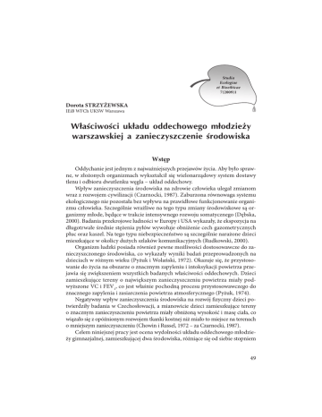 Studia Ecologiae et Bioethicae 7(2009)1 Dorota STRZYŻEWSKA IEiB WFCh UKSW Warszawa Właściwości układu oddechowego młodzieży warszawskiej a zanieczyszczenie środowiska Wstęp Oddychanie jest jednym z najważniejszych przejawów życia. Aby było sprawne, w złożonych organizmach wykształcił się wielonarządowy system dostawy tlenu i odbioru dwutlenku węgla – układ oddechowy. Wpływ zanieczyszczenia środowiska na zdrowie człowieka ulegał zmianom wraz z rozwojem cywilizacji (Czarnocki, 1987). Zaburzona równowaga systemu ekologicznego nie pozostała bez wpływu na prawidłowe funkcjonowanie organizmu człowieka. Szczególnie wrażliwe na tego typu zmiany środowiskowe są organizmy młode, będące w trakcie intensywnego rozwoju somatycznego (Dębska, 2000). Badania przekrojowe ludności w Europy i USA wykazały, że ekspozycja na długotrwałe średnie stężenia pyłów wywołuje obniżenie cech gazometrycznych płuc oraz kaszel. Na tego typu niebezpieczeństwo są szczególnie narażone dzieci mieszkające w okolicy dużych szlaków komunikacyjnych (Rudkowski, 2000). Organizm ludzki posiada również pewne możliwości dostosowawcze do zanieczyszczonego środowiska, co wykazały wyniki badań przeprowadzonych na dzieciach w różnym wieku (Pyżuk i Wolański, 1972). Okazuje się, że przystosowanie do życia na obszarze o znacznym zapyleniu i intoksykacji powietrza przejawia się zwiększeniem wszystkich badanych właściwości oddechowych. Dzieci zamieszkujące tereny o największym zanieczyszczeniu powietrza miały podwyższone VC i FEV1, co jest właśnie pochodną procesu przystosowawczego do znacznego zapylenia i zasiarczenia powietrza atmosferycznego (Pyżuk, 1974). Negatywny wpływ zanieczyszczenia środowiska na rozwój fizyczny dzieci potwierdziły badania w Czechosłowacji, a mianowicie dzieci zamieszkujące tereny o znacznym zanieczyszczeniu powietrza miały obniżoną wysokość i masę ciała, co wiązało się z opóźnionym rozwojem tkanki kostnej niż miało to miejsce na terenach o mniejszym zanieczyszczeniu (Chowin i Russel, 1972 – za Czarnocki, 1987). Celem niniejszej pracy jest ocena wydolności układu oddechowego młodzieży gimnazjalnej, zamieszkującej dwa środowiska, różniące się od siebie stopniem 49 Dorota Strzyżewska zanieczyszczenia powietrza. Hipoteza badawcza pracy zakłada, że wielkości cech oddechowych badanej młodzieży na terenie bardziej zanieczyszczonej dzielnicy Śródmieście będą istotnie różne niż w mniej zanieczyszczonej, bardziej zielonej i willowej dzielnicy Wawer. Materiał i metoda Badania będące podstawą niniejszej pracy przeprowadzono na młodzieży13-16 letniej, uczęszczającej do dwóch gimnazjów na terenie miasta stołecznego Warszawy, zlokalizowanych w Śródmieściu i w Międzylesiu. Wyboru dzielnic dokonano na podstawie danych dotyczących zanieczyszczenia środowiska. O wiele wyższe zanieczyszczenia środowiska ma miejsce w Dzielnicy Śródmieście niż w Dzielnicy Wawer, w której skład wchodzi Międzylesie. Dane dotyczące zanieczyszczenia tych terenów przedstawione zostały w tabeli 1 (GUS, 2007). W Śródmieściu badania przeprowadzono w gimnazjum z oddziałami dwujęzycznymi nr 42, na ulicy Twardej 8/12, natomiast w Międzylesiu wzięto pod uwagę gimnazjum z oddziałami integracyjnymi nr 103, znajdujące się na ulicy Żegańskiej 1a. Ogółem zbadano 219 chłopców i 225 dziewcząt, w tym ze Śródmieścia pochodziło 112 chłopców i 117 dziewcząt, natomiast z Międzylesia – 107 chłopców i 108 dziewcząt (Tab. 2). Badania były przeprowadzone od marca do czerwca 2006 roku. Pod uwagę wzięto cechy somatyczne jaki i oddechowe. Zmierzono wysokość, masę ciała i obwód klatki piersiowej oraz osiem cech oddechowych: VC- pojemność życiowa płuc w litrach (maksymalna objętość powietrza, jaka może znajdować się w płucach badanego), MV – minutowa wentylacja płuc w litrach (ilość wydychanego powietrza w ciągu jednej minuty), FEV1 – wysiłkowa 1 sek. pojemność oddechowa płuc w litrach, RR – częstość oddechów na minutę, zwana też rytmem oddychania, TV – objętość oddechowa (ilość powietrza, jaką człowiek wprowadza do płuc podczas każdego normalnego cyklu oddechowego (wdechu i wydechu)), IRV – rezerwa tlenowa wdechowa (ilość powietrza, którą można jeszcze wprowadzić do płuc, nie licząc normalnego wdechu.), ERV – rezerwa tlenowa wydechowa (jest to możliwy dalszy wydech powietrza, który poprzedzony jest normalnym wydechem – ilość powietrza zalegająca w płucach), Ap – czas bezdechu we wdechu w sekundach (jest to czas, w jakim badany po wzięciu głębokiego wdechu wytrzyma najdłużej do wydechu). Ponadto obliczono trzy wskaźniki: BMI (masę ciała w kg / wysokości ciała w m2), wskaźnik Marty, oceniający rozrost klatki piersiowej (obw. kl pier / wysokość ciała w cm)*100 oraz wskaźnik Ziemssena (VC / wysokość ciała w cm)*100. Pomiarów somatycznych dokonano przy użyciu antropometru, wagi lekarskiej i taśmy antropometrycznej, zgodnie z metodami opisanymi w podręcznikach Wolańskiego (1975) oraz Malinowskiego i Wolańskiego (1988). Badany miał na sobie jedynie strój gimnastyczny oraz był bez obuwia. 50 Właściwości układu oddechowego młodzieży warszawskiej a zanieczyszczenie środowiska Cechy oddechowe zmierzono przy pomocy spirometru Welch Allyn Schiller SP-10 (wyprodukowanego w San Diego, CA, USA), zgodnie z techniką pomiarową, zawartą w instrukcji (IOS, 1998). Badani byli dokładnie przyuczani do poprawnego wykonywania każdego testu, który przeprowadzono trzykrotnie i tylko najlepszy wynik był brany pod uwagę. W czasie badania pacjent oddychał poprzez ustnik połączony specjalną rurką ze spirometrem. Na nosie znajdował się zacisk, który zabezpieczał, aby wydychane powietrze docierało tylko do aparatu pomiarowego. Obliczeń statystycznych dokonano przy użyciu pakietu statystycznego SPSS 8.0, 