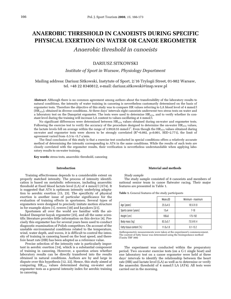 166 Pol. J. Sport Tourism 2008, 15, 166-173 ANAEROBIC THRESHOLD IN CANOEISTS DURING SPECIFIC PHYSICAL EXERTION ON WATER OR CANOE ERGOMETER Anaerobic threshold in canoeists DARIUSZ SITKOWSKI Institute of Sport in Warsaw, Physiology Department Mailing address: Dariusz Sitkowski, Instytute of Sport, 2/16 Trylogii Street, 01-982 Warsaw, tel. +48 22 8340812, e-mail: [email protected] Abstract: Although there is no common agreement among authors about the transferability of the laboratory results to natural conditions, the intensity of water training in canoeing is nevertheless customarily determined on the basis of ergometer tests. Therefore the objective of this study was to compare HR values referring to LA blood level of 4 mmol/l (HRAT4), obtained in diverse conditions. At three days’ intervals eight canoeists underwent two stress tests on water and a laboratory test on the Dansprint ergometer. The tests were used to determine HRAT4, and to verify whether its constant level during the training will increase LA content to values oscillating at 4 mmol/l. No significant differences were determined between HRAT4 values obtained during on-water and ergometer tests. Following the exercise test to verify the accuracy of the procedure designed to determine the on-water HRAT4 values, the lactate levels fell on average within the range of 3.99±0.55 mmol·l-1. Even though the HRAT4 values obtained during on-water and ergometer tests were shown to be strongly correlated (R2=0.892, p<0.001, SEE=2.771), the limit of agreement varied from -5.5 to +5.7 s/min. The final conclusion of this study is that a exercise test conducted in special conditions offers a relatively accurate method of determining the intensity corresponding to AT4 in the same conditions. While the results of such tests are closely correlated with the ergometer results, their verification is nevertheless understandable when applying laboratory results to on-water training. Key words: stress tests, anaerobic threshold, canoeing Introduction Material and methods Training effectiveness depends to a considerable extent on properly matched intensity. The process of intensity identification is based on metabolic references, including anaerobic threshold at fixed blood lactate level (LA) of 4 mmol/l (AT4). It is suggested that AT4 is optimum intensity underlying adaptation to aerobic exertion [15, 23]. The specificity of physical exertion is another issue of particular significance for the evaluation of training effects in sportsmen. Several types of ergometers were designed to precisely imitate motion structure in for example skiers [1], rowers [18] and kayakers [21]. Sportsmen all over the world are familiar with the airbraked Dansprint kayak ergometer [25], and all the same scientific literature provides little information on this device [4]. Precisely this ergometer has for several years been used to conduct diagnostic examination of Polish competitors. On account of the unstable environmental conditions related to the temperature, wind, water depth, and waves, it is difficult to control the intensity of training in canoeing based on the boat speed, and therefore heart rate (HR) has been adopted as a reference value. Precise selection of the intensity rate is particularly important in aerobic exertion [14], which is a substantial component of training in canoeing. However, a question arises whether laboratory results can be directly transfered into the results obtained in natural conditions. Authors are by and large in dispute over this hypothesis [12, 22]. Hence, this study aimed at comparing HRAT4 values determined during on-water and ergometer tests as a general intensity index for aerobic training in canoeing. Study sample The study sample consisted of 8 canoeists and members of national senior team in canoe flatwater racing. Their major features are presented in Table 1. Table 1. General features of the study participants Mean±SD Minimum - maximum 25.5±4.5 18.5-31.8 Sports career [years] 13±4 7-18 Height [cm] 180±6 175-192 Body mass [kg] 83.3±5.7 73.5-91.4 Fatty tissue content [%] 11.0±1.8 8.1-13.2 Age [years] Anthropometric measurements were taken at the experiment’s commencement. The content of fatty tissue was determined using the bioimpedance method (Tanita TBF 300) The experiment was conducted within the preparatory period. Two on-water exercise tests (on a C-1 single boat) and one laboratory test on a canoe ergometer were held at three days’ intervals to identify the relationship between the heart rate (HR) and lactate level (LA) as well as to determine or verify the anaerobic threshold of 4 mmol/l LA (AT4). All tests were carried out in the morning. Sitkowski: ANAEROBIC THRESHOLD IN CANOEISTS Laboratory test The graded exercise test was conducted on the air-braked ergometer Dansprint, I Bergman A/S (version for canoeists). During the test fan resistance was entirely open. It consisted of five 4 minutes’ stages held at 1 minute intervals. Power values to be achieved by competitors in successive subtests were 0.6, 0.9, 1.2, 1.5 and 1.9 kg per body mass. The selection of values was based on the assumption that intensity of the fourth stage exceeds the AT4 level. The first and lightest test corresponded to an on-water warm-up. Indicators under study The HR values were recorded on-line using S610 recorders by Polar Electro. The analysis included mean values of this indicator obtained in the last minute of each stage and within three last minutes of the 2100 m test. Immediately after each stage (on water from a motorboat accompanying the competitors) 10 µl samples of capillary blood were collected to determine the LA level using LKM 140 kits by DR. LANGE. The anaerobic threshold was established by interpolation, identifying the HR values corresponding to 4 mmol/l LA. Statistical analysis The significance of differences between HR values was determined using the ANOVA test with repeated measurements (differences at p<0.