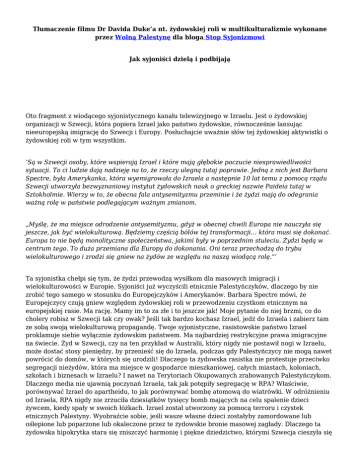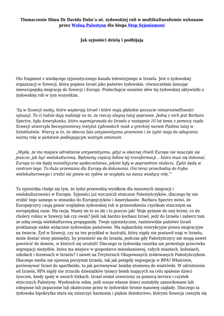 Tłumaczenie filmu Dr Davida Duke’a nt. żydowskiej roli w multikulturalizmie wykonane przez Wolną Palestynę dla bloga Stop Syjonizmowi Jak syjoniści dzielą i podbijają Oto fragment z wiodącego syjonistycznego kanału telewizyjnego w Izraelu. Jest o żydowskiej organizacji w Szwecji, która popiera Izrael jako państwo żydowskie, równocześnie lansując nieeuropejską imigrację do Szwecji i Europy. Posłuchajcie uważnie słów tej żydowskiej aktywistki o żydowskiej roli w tym wszystkim. ‘Są w Szwecji osoby, które wspierają Izrael i które mają głębokie poczucie niesprawiedliwości sytuacji. To ci ludzie dają nadzieję na to, że rzeczy ulegną tutaj poprawie. Jedną z nich jest Barbara Spectre, była Amerykanka, która wyemigrowała do Izraela a następnie 10 lat temu z pomocą rządu Szwecji utworzyła bezwyznaniowy instytut żydowskich nauk o greckiej nazwie Paideia tutaj w Sztokholmie. Wierzy w to, że obecna fala antysemityzmu przeminie i że żydzi mają do odegrania ważną rolę w państwie podlegającym ważnym zmianom. „Myślę, że ma miejsce odrodzenie antysemityzmu, gdyż w obecnej chwili Europa nie nauczyła się jeszcze, jak być wielokulturową. Będziemy częścią bólów tej transformacji… która musi się dokonać. Europa to nie będą monolityczne społeczeństwa, jakimi były w poprzednim stuleciu. Żydzi będą w centrum tego. To duża przemiana dla Europy do dokonania. Oni teraz przechodzą do trybu wielokulturowego i zrodzi się gniew na żydów ze względu na naszą wiodącą rolę.”’ Ta syjonistka chełpi się tym, że żydzi przewodzą wysiłkom dla masowych imigracji i wielokulturowości w Europie. Syjoniści już wyczyścili etnicznie Palestyńczyków, dlaczego by nie zrobić tego samego w stosunku do Europejczyków i Amerykanów. Barbara Spectre mówi, że Europejczycy czują gniew względem żydowskiej roli w przewodzeniu czystkom etnicznym na europejskiej rasie. Ma rację. Mamy im to za złe i to jeszcze jak! Moje pytanie do niej brzmi, co do cholery robisz w Szwecji tak czy owak? Jeśli tak bardzo kochasz Izrael, jedź do Izraela i zabierz tam ze sobą swoją wielokulturową propagandę. Twoje syjonistyczne, rasistowskie państwo Izrael proklamuje siebie wyłącznie żydowskim państwem. Ma najbardziej restrykcyjne prawa imigracyjne na świecie. Żyd w Szwecji, czy na ten przykład w Australii, który nigdy nie postawił nogi w Izraelu, może dostać stosy pieniędzy, by przenieść się do Izraela, podczas gdy Palestyńczycy nie mogą nawet powrócić do domów, w których się urodzili! Dlaczego ta żydowska rasistka nie protestuje przeciwko segregacji nieżydów, która ma miejsce w gospodarce mieszkaniowej, całych miastach, koloniach, szkołach i biznesach w Izraelu? I nawet na Terytoriach Okupowanych zrabowanych Palestyńczykom. Dlaczego media nie ujawnią poczynań Izraela, tak jak potępiły segregację w RPA? Właściwie, porównywać Izrael do apartheidu, to jak porównywać bombę atomową do wiatrówki. W odróżnieniu od Izraela, RPA nigdy nie zrzuciła dziesiątków tysięcy bomb mających na celu spalenie dzieci żywcem, kiedy spały w swoich łóżkach. Izrael został utworzony za pomocą terroru i czystek etnicznych Palestyny. Wyobraźcie sobie, jeśli wasze własne dzieci zostałyby zamordowane lub oślepione lub poparzone lub okaleczone przez te żydowskie bronie masowej zagłady. Dlaczego ta żydowska hipokrytka stara się zniszczyć harmonię i piękne dziedzictwo, którymi Szwecja cieszyła się przez tysiące lat? Jakie są prawdziwe motywy jej i całej reszty tych żydowskich supremacjonistów? Zaraz się tego dowiecie. Faktem jest, że żydowscy rasiści promują różnorodność wśród wszystkich ras i narodów z wyjątkiem własnego. Oto metoda ich szaleństwa. Żadna grupa na ziemi nie walczy bardziej o swoje interesy niż żydzi. Przez dzielenie społeczeństwa mogą je osłabić i kontrolować. Pamiętniki byłego izraelskiego premiera Moshe Sharetta powiedziały, jak Izrael umyślnie działał na rzecz konfliktu, nienawiści i wojny pomiędzy chrześcijanami i muzułmanami w Libanie, by pomniejszyć ich zdolność do obrony przed Izraelem. Izraelski zbrodniarz wojenny Ariel Sharon celowo zaaranżował masowy mord ponad tysiąca muzułmanów w Bejrucie, by zwiększyć nienawiść pomiędzy muzułmanami i chrześcijanami. To samo robią dziś na całym świecie. Europejczycy są słusznie zaniepokojeni masową imigracją do ich ojczystych ziem, tak jak każdy dobry muzułmanin w państwie muzułmańskim sprzeciwiłby się masowej imigracji powiedzmy europejskich chrześcijan w jego kraju do punktu, w którym zostałby wyparty na swojej własnej ziemi. Pozwólcie, że wam powiem, to nie muzułmanie zmienili politykę imigracyjną w Europie i Ameryce, to nie oni są właścicielami mediów, które mówią Szwedom, Niemcom, Brytyjczykom i Amerykanom, że muszą pozwolić sobie na to, by zostać oczyszczeni etnicznie we własnych ojczyznach. Arabowie nie prowadzą koszernych hollywoodzkich mediów, które uczą Europejczyków nienawiści do siebie tak wielkiej, że niektórzy z nich świętują swoje własne wyginięcie! W narodach, które są bardziej jednolite niż Liban, żydowscy ekstremiści promują masowe imigracje zróżnicowanych elementów, by stworzyć sytuację podobną jak w Libanie. W Ameryce mamy nową żydowską klasę rządzącą. Chełpią się tym. Są najbardziej wpływowym pojedynczym elementem w polityce i kontrolują olbrzymią większość pieniędzy na kampanie polityczne. Oto artykuł z żydowskiej gazety Haaretz pokazujący, że trzech największych politycznych kontrybutorów w Ameryce jest żydowskimi syjonistami, a najwyżej postawiony Haim Saban jest obywatelem Izraela! Największym pojedynczym korporacyjnym kontrybutorem prezydenta Baracka Obamy był Goldman Sachs. Właściciele Goldman Sachs nie są muzułmanami ani chrześcijanami. Są żydowskimi supremacjonistyczn