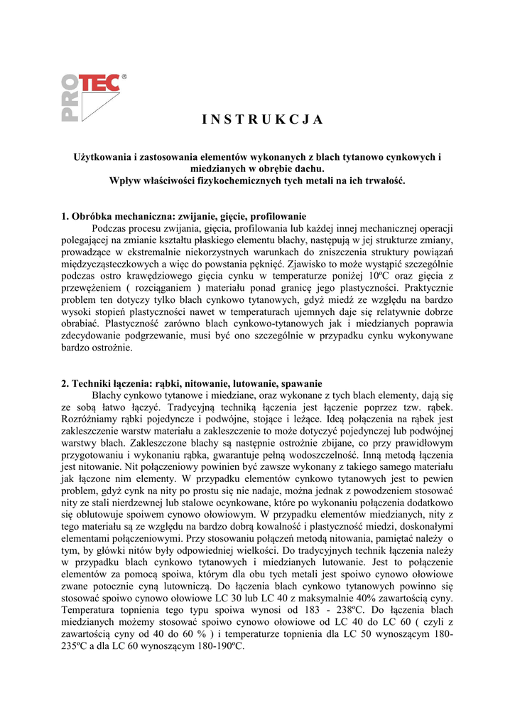 INSTRUKCJA Użytkowania i zastosowania elementów wykonanych z blach tytanowo cynkowych i miedzianych w obrębie dachu. Wpływ właściwości fizykochemicznych tych metali na ich trwałość. 1. Obróbka mechaniczna: zwijanie, gięcie, profilowanie Podczas procesu zwijania, gięcia, profilowania lub każdej innej mechanicznej operacji polegającej na zmianie kształtu płaskiego elementu blachy, następują w jej strukturze zmiany, prowadzące w ekstremalnie niekorzystnych warunkach do zniszczenia struktury powiązań międzycząsteczkowych a więc do powstania pęknięć. Zjawisko to może wystąpić szczególnie podczas ostro krawędziowego gięcia cynku w temperaturze poniżej 10ºC oraz gięcia z przewężeniem ( rozciąganiem ) materiału ponad granicę jego plastyczności. Praktycznie problem ten dotyczy tylko blach cynkowo tytanowych, gdyż miedź ze względu na bardzo wysoki stopień plastyczności nawet w temperaturach ujemnych daje się relatywnie dobrze obrabiać. Plastyczność zarówno blach cynkowo-tytanowych jak i miedzianych poprawia zdecydowanie podgrzewanie, musi być ono szczególnie w przypadku cynku wykonywane bardzo ostrożnie. 2. Techniki łączenia: rąbki, nitowanie, lutowanie, spawanie Blachy cynkowo tytanowe i miedziane, oraz wykonane z tych blach elementy, dają się ze sobą łatwo łączyć. Tradycyjną techniką łączenia jest łączenie poprzez tzw. rąbek. Rozróżniamy rąbki pojedyncze i podwójne, stojące i leżące. Ideą połączenia na rąbek jest zakleszczenie warstw materiału a zakleszczenie to może dotyczyć pojedynczej lub podwójnej warstwy blach. Zakleszczone blachy są następnie ostrożnie zbijane, co przy prawidłowym przygotowaniu i wykonaniu rąbka, gwarantuje pełną wodoszczelność. Inną metodą łączenia jest nitowanie. Nit połączeniowy powinien być zawsze wykonany z takiego samego materiału jak łączone nim elementy. W przypadku elementów cynkowo tytanowych jest to pewien problem, gdyż cynk na nity po prostu się nie nadaje, można jednak z powodzeniem stosować nity ze stali nierdzewnej lub stalowe ocynkowane, które po wykonaniu połączenia dodatkowo się oblutowuje spoiwem cynowo ołowiowym. W przypadku elementów miedzianych, nity z tego materiału są ze względu na bardzo dobrą kowalność i plastyczność miedzi, doskonałymi elementami połączeniowymi. Przy stosowaniu połączeń metodą nitowania, pamiętać należy o tym, by główki nitów były odpowiedniej wielkości. Do tradycyjnych technik łączenia należy w przypadku blach cynkowo tytanowych i miedzianych lutowanie. Jest to połączenie elementów za pomocą spoiwa, którym dla obu tych metali jest spoiwo cynowo ołowiowe zwane potocznie cyną lutowniczą. Do łączenia blach cynkowo tytanowych powinno się stosować spoiwo cynowo ołowiowe LC 30 lub LC 40 z maksymalnie 40% zawartością cyny. Temperatura topnienia tego typu spoiwa wynosi od 183 - 238ºC. Do łączenia blach miedzianych możemy stosować spoiwo cynowo ołowiowe od LC 40 do LC 60 ( czyli z zawartością cyny od 40 do 60 % ) i temperaturze topnienia dla LC 50 wynoszącym 180235ºC a dla LC 60 wynoszącym 180-190ºC. Połączenia miedzi możemy wykonać także metodą spawania gazowego przy pomocy palnika propan/tlen lub acetylen/tlen z zastosowaniem specjalnego lutowia miedziano-fosforowego lub miedziano- srebrnego . W warunkach warsztatowych coraz częściej spotyka się sposoby spawania zarówno miedzi jak i cynku przy pomocy plazmy lub w technologii TIG. 3. Mocowanie: elementy mocujące ( kołki, śruby, haftki). Mocowanie elementów blacharskich z blach miedzianych i cynkowo-tytanowych odbywa się najczęściej za pomocą różnego rodzaju kołków i śrub. Zarówno dla miedzi jak i cynku nie beż znaczenia pozostaje materiał, z którego te elementy mocujące są wykonane. Kołki wykonane z odpowiednio trwałego plastiku nie stanowią dla metalu żadnego zagrożenia. Element mocujący jakim najczęściej jest śruba, wkręt, czasami gwóźdź lub inny element złączny, powinny być w przypadku zastosowania miedzi i cynku, z tego samego materiału lub z materiału o tzw. dozwolonym kontakcie, co dla tych metali oznacza, że miedź powinna być mocowana tylko elementami z miedzi lub ewentualnie ze stali nierdzewnej, a cynk elementami ocynkowanymi ( najlepiej ogniowo ) lub też nierdzewnymi. Inne metale w kontakcie z miedzią lub cynkiem mogą inicjować i przyspieszać korozję. Mocowanie elementów z cienkich blach cynkowych czy miedzianych powinno przewidzieć ich narażenie na siły wiatru i obciążenie mechaniczne. Nie bez znaczenia pozostaje w takim przypadku średnica główki śruby, wkrętu czy gwoździa i powierzchnia nacisku tego elementu na mocowaną blachę. 4. Zabezpieczenie przed korozją. Warstwa oddzielająca Mimo iż blachy cynkowe i miedziane uważane są za blachy szlachetne, ich stosowanie w obrębie dachu podlega rygorystycznym zasadom. Zasady te eliminują lub ograniczają do minimum możliwość inicjowania i przyspieszania naturalnej korozji tych metali, gdyż w innym przypadku ich zastosowanie, trwałość i ponoszone z tego tytułu koszty nie mają sensu. Zarówno cynk jak i miedź ulegają naturalnym procesom korozji a proces ten przyspieszają zdecydowanie warunki zastosowania; metale te niszczą związki siarki ( wszelkie spaliny a szczególnie z węgla i koksu ) i azotu ( opary z toalet, obiektów hodowli zwierząt ). Szkodliwy wpływ ma zalegająca wilgoć i związki soli ( w tym i te zawarte w środkach konserwacji drewna ). Niszczące działanie mają związki wapienne i cementowe a szczególnie substancje wchodzące w skład klejów, zapraw i mas szpachlowych i tynkarskich. Nie obojętne dla trwałości miedzi i cynku są związki bitumów a szczególnie ksylenu. Dlatego też tam gdzie istnieje duże ryzyko stałego kontaktu ze środowiskiem zawierającym którykolwiek szkodliwy czynnik, metali tych nie należy stosować. Tam gdzie kontakt ten jes