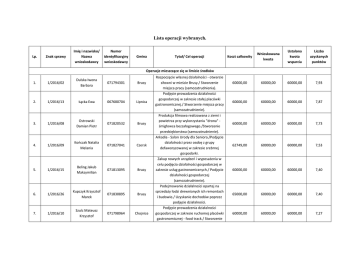 Lista operacji wybranych. Lp. Znak sprawy Imię i nazwisko/ Nazwa wnioskodawcy Numer identyfikacyjny wnioskodawcy Gmina Tytuł/ Cel operacji Koszt całkowity Wnioskowana kwota Ustalona kwota wsparcia Liczba uzyskanych punktów 60000,00 60000,00 60000,00 7,93 60000,00 60000,00 60000,00 7,87 60000,00 60000,00 60000,00 7,73 62749,00 60000,00 60000,00 7,53 60000,00 60000,00 60000,00 7,40 65000,00 60000,00 60000,00 7,40 60000,00 60000,00 60000,00 7,27 Operacje mieszczące się w limicie środków 1. 1/2016/02 Dulska Iwona Barbara 071794301 Brusy 2. 1/2016/13 Łącka Ewa 067680704 Lipnica 3. 1/2016/08 Ostrowski Damian Piotr 071820532 Brusy 4. 1/2016/09 Kończak Natalia Melania 071827041 Czersk 5. 1/2016/15 Beling Jakub Maksymilian 071813095 Brusy 6. 1/2016/26 Kupczyk Krzysztof Marek 071830895 Brusy 7. 1/2016/10 Szulc Mateusz Krzysztof 071798964 Chojnice Rozpoczęcie własnej działalności - otwarcie siłowni w mieście Brusy./ Stworzenie miejsca pracy (samozatrudnienia). Podjęcie prowadzenia działalności gospodarczej w zakresie stałej placówki gastronomicznej./ Stworzenie miejsca pracy (samozatrudnienie). Produkcja filmowa realizowana z ziemi i powietrza przy wykorzystaniu "drona" śmigłowca bezzałogowego./Stworzenie przedsiębiorstwa (samozatrudnienie). Arkadia - Salon Urody dla Seniora./Podjęcie działalności przez osobę z grupy defaworyzowanej w zakresie srebrnej gospodarki. Zakup nowych urządzeń i wyposażenia w celu podjęcia działalności gospodarczej w zakresie usług gastronomicznych./ Podjęcie działalności gospodarczej (samozatrudnienie). Podejmowanie działalności opartej na sprzedaży łodzi drewnianych ich remontach i budowie./ Uzyskanie dochodów poprzez podjęcie działalności. Podjęcie prowadzenia działalności gospodarczej w zakresie ruchomej placówki gastronomicznej - food track./ Stworzenie miejsca pracy (samozatrudnienie). 8. 1/2016/14 Plak Klaudiusz Piotr 071801945 Chojnice 9. 1/2016/06 Pestka Sebastian Andrzej 071801851 Chojnice 10. 1/2016/25 Michalska Agnieszka 071765400 Chojnice 11. 1/2016/27 Kontek Damian 071820724 Chojnice 12. 1/2016/11 Zblewski Łukasz Stanisław 071825712 Brusy Podjęcie działalności w branży gastronomicznej - wykorzystanie lokalnych produktów rolnych i walorów obszaru./ Stworzenie innowacyjnego mobilnego punktu gastronomicznego (samozatrudnienie). Podjęcie działalności gospodarczej w zakresie świadczenia usług instalacji odnawialnych źródeł energii./Uzyskanie dochodów własnej działalności gospodarczej przez osobę z grupy defaworyzowanej. Mobilna działalność gastronomiczna./ Uzyskanie dochodów z własnej działalności gospodarczej. Efektywne wykorzystanie energii elektrycznej oraz serwis i montaż OZE./ Otwarcie działalności usługowej (samozatrudnienie). Podjęcie działalności gospodarczej w oparciu o potencjał turystyczny Kaszubskiej Marszruty - stacjonarna i mobilna wypożyczalnia rowerów./ Samozatrudnienie w branży preferowanej w LSR. 60120,00 60000,00 60000,00 7,27 60075,00 60000,00 60000,00 7,27 60000,00 60000,00 60000,00 7,13 61000,00 60000,00 60000,00 7,07 63797,00 60000,00 60000,00 6,80 60000,00 60000,00 60000,00 6,33 60000,00 60000,00 60000,00 6,33 Operacje niemieszczące się w limicie środków 13. 1/2016/23 Zimnicka Anna 071852103 Chojnice 14. 1/2016/29 Stolp Błażej Marian 071850175 Chojnice "W trosce o seniora" - mobilny gabinet masaży./ Jednoosobowa działalność gospodarcza (samozatrudnienie). Podjęcie działalności gospodarczej w zakresie usług fotograficznych./ Uzyskanie dochodów z własnej działalności gospodarczej. 15. 1/2016/01 Rostankowska Daria 071768964 Chojnice 16. 1/2016/22 Just Hanna Małgorzata 071795412 Chojnice 17. 1/2016/04 SzupkePorożyńska Justyna 071813133 Chojnice 18. 1/2016/30 Węsierska Iwona Jadwiga 071853574 Chojnice 19. 1/2016/19 Drewek Violetta Teresa 071842533 Czersk 20. 1/2016/24 Lahn Mikołaj Piotr 071825083 Chojnice 21. 1/2016/20 Muszyński Wojciech 071849515 Czersk Usługi rekreacyjne i sportowe - podjęcie działalności przez osobę z grupy defaworyzowanej w zakresie turystyki./Osiągnięcie dochodów z działalności turystycznej poprzez otwarcie działalności gospodarczej. Rozpoczęcie działalności gospodarczej pod nazwą "Mobilny podolg kosmetolog dla seniora"./ Uzyskanie dochodów z własnej działalności gospodarczej. Podjęcie działalności gospodarczej w zakresie mobilnych usług kosmetycznych dla seniorów./ Uzyskanie dochodu i niezależności finansowej poprzez otwarcie działalności gospodarczej przez osobę z grupy defaworyzowanej. Podjęcie działalności gospodarczej świadczenie usług wypoczynkowych i turystycznych./ Dochód z działalności gospodarczej w zakresie usług wypoczynkowo - turystycznych. Organizacja spływów kajakowych. Wynajem kajaków i wynajem rowerów oraz innego sprzętu turystyczno-rekreacyjnego./ Samozatrudnienie - aktywizacja zawodowa. Działalność usługowa LAHNPOL w zakresie turystyki i rekreacji w oparciu o wykorzystanie potencjału dziedzictwa kulturowego miejscowości Charzykowy kolebki żeglarstwa./ Osiągnięcie dochodów z własnej działalności gospodarczej. Podjęcie działalności gospodarczej - usługi instalacyjne odnawialnych źródeł energii./ Uzyskanie źródła dochodu z własnej działalności gospodarczej. 60270,00 60000,00 60000,00 6,27 60000,00 60000,00 60000,00 6,27 62000,00 60000,00 60000,00 6,27 80000,00 60000,00 60000,00 6,20 60000,00 60000,00 60000,00 6,13 60000,00 60000,00 60000,00 6,13 60178,00 60000,00 60000,00 5,80 22. 1/2016/03 Brunka Jarosław 071813292 Chojnice 23. 1/2016/16 Gliszczyńska Dominika Anna 071843075 Brusy 24. 1/2016/12 Lepak Marcin Piotr 071831050 Chojnice 25. 1/2016/05 Barwina Edyta 071813413 Chojnice 26. 1/2016/21 Jączkowski Kamil Adam 071830284 Chojnice 27. 1/2016/07 Wojcieszczyk Dawid Roman 071830284 Czersk 28. 1/2016/17 Kowalik Piotr 071843261 Chojnice Podjęcie działalności gospodarczej związanej z innowacjami usługowymi na obszarach wiej