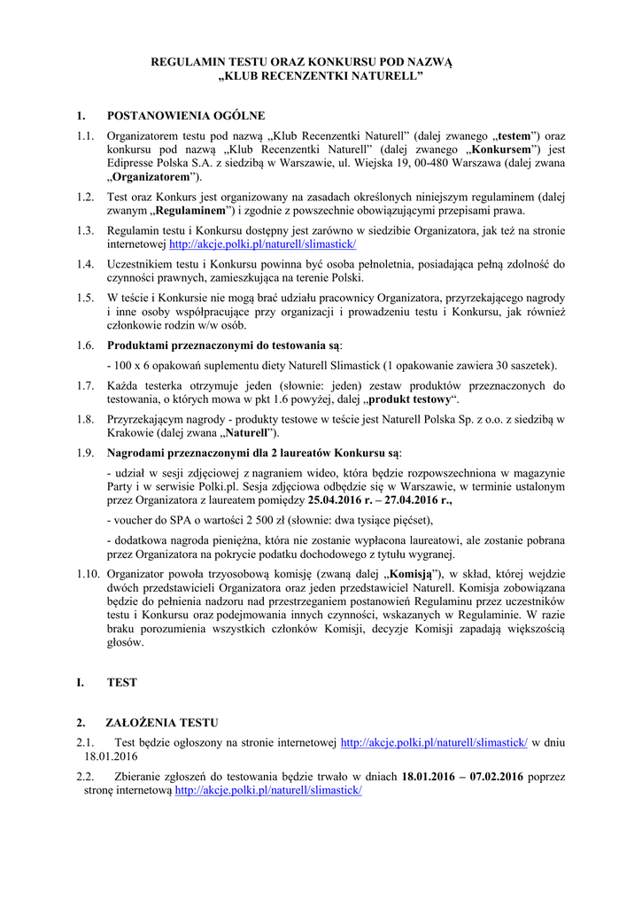 REGULAMIN TESTU ORAZ KONKURSU POD NAZWĄ „KLUB RECENZENTKI NATURELL” 1. POSTANOWIENIA OGÓLNE 1.1. Organizatorem testu pod nazwą „Klub Recenzentki Naturell” (dalej zwanego „testem”) oraz konkursu pod nazwą „Klub Recenzentki Naturell” (dalej zwanego „Konkursem”) jest Edipresse Polska S.A. z siedzibą w Warszawie, ul. Wiejska 19, 00-480 Warszawa (dalej zwana „Organizatorem”). 1.2. Test oraz Konkurs jest organizowany na zasadach określonych niniejszym regulaminem (dalej zwanym „Regulaminem”) i zgodnie z powszechnie obowiązującymi przepisami prawa. 1.3. Regulamin testu i Konkursu dostępny jest zarówno w siedzibie Organizatora, jak też na stronie internetowej http://akcje.polki.pl/naturell/slimastick/ 1.4. Uczestnikiem testu i Konkursu powinna być osoba pełnoletnia, posiadająca pełną zdolność do czynności prawnych, zamieszkująca na terenie Polski. 1.5. W teście i Konkursie nie mogą brać udziału pracownicy Organizatora, przyrzekającego nagrody i inne osoby współpracujące przy organizacji i prowadzeniu testu i Konkursu, jak również członkowie rodzin w/w osób. 1.6. Produktami przeznaczonymi do testowania są: - 100 x 6 opakowań suplementu diety Naturell Slimastick (1 opakowanie zawiera 30 saszetek). 1.7. Każda testerka otrzymuje jeden (słownie: jeden) zestaw produktów przeznaczonych do testowania, o których mowa w pkt 1.6 powyżej, dalej „produkt testowy“. 1.8. Przyrzekającym nagrody - produkty testowe w teście jest Naturell Polska Sp. z o.o. z siedzibą w Krakowie (dalej zwana „Naturell”). 1.9. Nagrodami przeznaczonymi dla 2 laureatów Konkursu są: - udział w sesji zdjęciowej z nagraniem wideo, która będzie rozpowszechniona w magazynie Party i w serwisie Polki.pl. Sesja zdjęciowa odbędzie się w Warszawie, w terminie ustalonym przez Organizatora z laureatem pomiędzy 25.04.2016 r. – 27.04.2016 r., - voucher do SPA o wartości 2 500 zł (słownie: dwa tysiące pięćset), - dodatkowa nagroda pieniężna, która nie zostanie wypłacona laureatowi, ale zostanie pobrana przez Organizatora na pokrycie podatku dochodowego z tytułu wygranej. 1.10. Organizator powoła trzyosobową komisję (zwaną dalej „Komisją”), w skład, której wejdzie dwóch przedstawicieli Organizatora oraz jeden przedstawiciel Naturell. Komisja zobowiązana będzie do pełnienia nadzoru nad przestrzeganiem postanowień Regulaminu przez uczestników testu i Konkursu oraz podejmowania innych czynności, wskazanych w Regulaminie. W razie braku porozumienia wszystkich członków Komisji, decyzje Komisji zapadają większością głosów. I. TEST 2. ZAŁOŻENIA TESTU 2.1. Test będzie ogłoszony na stronie internetowej http://akcje.polki.pl/naturell/slimastick/ w dniu 18.01.2016 2.2. Zbieranie zgłoszeń do testowania będzie trwało w dniach 18.01.2016 – 07.02.2016 poprzez stronę internetową http://akcje.polki.pl/naturell/slimastick/ 2.3. Lista 100 osób zakwalifikowanych do testowania produktu (dalej „testerek”) zawierająca nick użytkownika zostanie ogłoszona na stronie internetowej http://akcje.polki.pl/naturell/slimastick/ w terminie nie później niż do dnia 12.02.2016 r. 3. ZASADY PROWADZENIA TESTU 3.1. Organizator zamieści w ogłoszeniu o teście, o którym mowa w pkt 2.1 powyżej, informacje o zasadach testu, produktach testowych i ramach czasowych testu, jak również wskaże adres strony internetowej Organizatora, na której zamieszczony jest Regulamin. 3.2. Uczestnicy testu są identyfikowani przez Organizatora na podstawie nicku w serwisie polki.pl. 3.3. Aby wziąć udział w teście, należy w terminie od 18.01.2016 – 07.02.2016 r. dokonać rejestracji na stronie internetowej http://akcje.polki.pl/naturell/slimastick/ (jeżeli uczestnik nie jest jeszcze zarejestrowany) oraz poprawnie wypełnić formularz rejestracyjny do testu zamieszczony na stronie http://akcje.polki.pl/naturell/slimastick/, w tym: - udzielić odpowiedzi na pytania zamknięte zawarte w ankiecie, - udzielić odpowiedzi na pytanie otwarte zawarte w ankiecie, które brzmi „Napisz dlaczego chciałabyś schudnąć i wystąpić w profesjonalnej sesji w Party, która będzie zamieszczona również w serwisie Polki.pl”, - dodać swoje aktualne zdjęcie spełniające następujące warunki: (I) na zdjęciu będzie widoczna twarz oraz sylwetka uczestnika testu, (II) plik zawierający zdjęcie nie może być uszkodzony, (III) plik zawierający zdjęcie nie może przekroczyć pojemności 2 MB (IV) plik zawierający zdjęcie musi być zapisany w następującym formacie pliku: jpg, (V) zdjęcie nie może naruszać praw osób trzecich, w tym praw autorskich osób trzecich, lub dóbr osobistych osób trzecich, ani przepisów bezwzględnie obowiązującego prawa, - podać dane osobowe niezbędne do wysyłki produktu testowego, - wyrazić zgodę na przetwarzanie danych osobowych, - przesłać zgłoszenie bezpośrednio za pośrednictwem serwisu http://akcje.polki.pl/naturell/slimastick/ poprzez kliknięcie pola „wyślij”, po uprzednim wypełnieniu wszystkich wymaganych pól ankiety (dalej: „zgłoszenie”). 3.4. Uczestnik niniejszym oświadcza, że odpowiedź na pytanie otwarte udzielona przez niego w ramach zgłoszenia do testu, o którym mowa w pkt 3.3 powyżej, nie narusza praw osób trzecich, w tym autorskich praw osobistych i majątkowych osób trzecich, lub dóbr osobistych osób trzecich, jak również, że, w przypadku, jeżeli odpowiedź na pytanie otwarte stanowi utwór, w rozumieniu ustawy z dnia 4 lutego 1994 r. o prawie autorskim i prawach pokrewnych, przysługują mu autorskie prawa majątkowe lub licencje do takiej odpowiedzi, w zakresie niezbędnym do udzielenia licencji, zgodnie z pkt 3.11 poniżej. 3.5. Spośród wszystkich zgłoszeń Komisja wybierze w terminie do 12.02.2016 r. 100 najlepszych zgłoszeń, których autorzy zostaną testerami i otrzymają nagrodę w postaci produktu testowego. Przy wyborze najlepszych zgłoszeń, Komisja będzi