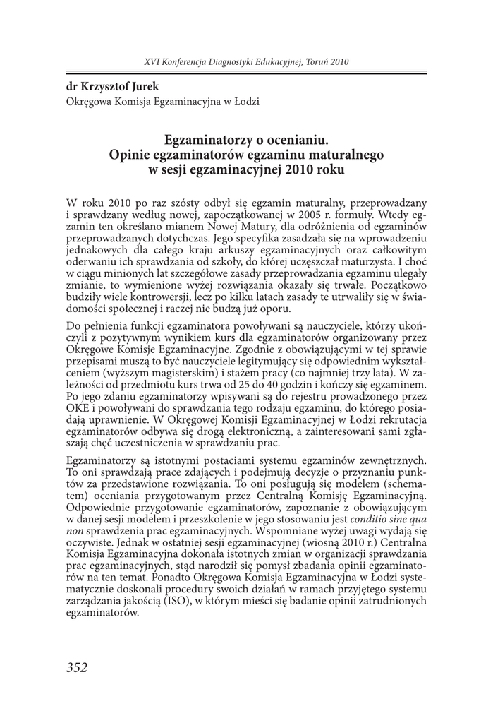 XVI Konferencja Diagnostyki Edukacyjnej, Toruń 2010 dr Krzysztof Jurek Okręgowa Komisja Egzaminacyjna w Łodzi Egzaminatorzy o ocenianiu. Opinie egzaminatorów egzaminu maturalnego w sesji egzaminacyjnej 2010 roku W roku 2010 po raz szósty odbył się egzamin maturalny, przeprowadzany i sprawdzany według nowej, zapoczątkowanej w 2005 r. formuły. Wtedy egzamin ten określano mianem Nowej Matury, dla odróżnienia od egzaminów przeprowadzanych dotychczas. Jego specyfika zasadzała się na wprowadzeniu jednakowych dla całego kraju arkuszy egzaminacyjnych oraz całkowitym oderwaniu ich sprawdzania od szkoły, do której uczęszczał maturzysta. I choć w ciągu minionych lat szczegółowe zasady przeprowadzania egzaminu ulegały zmianie, to wymienione wyżej rozwiązania okazały się trwałe. Początkowo budziły wiele kontrowersji, lecz po kilku latach zasady te utrwaliły się w świadomości społecznej i raczej nie budzą już oporu. Do pełnienia funkcji egzaminatora powoływani są nauczyciele, którzy ukończyli z pozytywnym wynikiem kurs dla egzaminatorów organizowany przez Okręgowe Komisje Egzaminacyjne. Zgodnie z obowiązującymi w tej sprawie przepisami muszą to być nauczyciele legitymujący się odpowiednim wykształceniem (wyższym magisterskim) i stażem pracy (co najmniej trzy lata). W zależności od przedmiotu kurs trwa od 25 do 40 godzin i kończy się egzaminem. Po jego zdaniu egzaminatorzy wpisywani są do rejestru prowadzonego przez OKE i powoływani do sprawdzania tego rodzaju egzaminu, do którego posiadają uprawnienie. W Okręgowej Komisji Egzaminacyjnej w Łodzi rekrutacja egzaminatorów odbywa się drogą elektroniczną, a zainteresowani sami zgłaszają chęć uczestniczenia w sprawdzaniu prac. Egzaminatorzy są istotnymi postaciami systemu egzaminów zewnętrznych. To oni sprawdzają prace zdających i podejmują decyzje o przyznaniu punktów za przedstawione rozwiązania. To oni posługują się modelem (schematem) oceniania przygotowanym przez Centralną Komisję Egzaminacyjną. Odpowiednie przygotowanie egzaminatorów, zapoznanie z obowiązującym w danej sesji modelem i przeszkolenie w jego stosowaniu jest conditio sine qua non sprawdzenia prac egzaminacyjnych. Wspomniane wyżej uwagi wydają się oczywiste. Jednak w ostatniej sesji egzaminacyjnej (wiosną 2010 r.) Centralna Komisja Egzaminacyjna dokonała istotnych zmian w organizacji sprawdzania prac egzaminacyjnych, stąd narodził się pomysł zbadania opinii egzaminatorów na ten temat. Ponadto Okręgowa Komisja Egzaminacyjna w Łodzi systematycznie doskonali procedury swoich działań w ramach przyjętego systemu zarządzania jakością (ISO), w którym mieści się badanie opinii zatrudnionych egzaminatorów. 352 Teraźniejszość i przyszłość oceniania szkolnego Co roku dyrektor CKE w porozumieniu z dyrektorami Okręgowych Komisji Egzaminacyjnych wydaje Procedury organizowania i przeprowadzania egzaminu maturalnego oraz Procedury oceniania przez egzaminatorów prac sprawdzianu, egzaminu gimnazjalnego i maturalnego. Są one uszczegółowieniem obowiązujących przepisów Ministerstwa Edukacji Narodowej, w tym najważniejszego dla przebiegu egzaminu Rozporządzenia Ministra Edukacji Narodowej z dnia 30 kwietnia 2007 r. w sprawie warunków i sposobu oceniania, klasyfikowania i promowania uczniów i słuchaczy oraz przeprowadzania sprawdzianów i egzaminów w szkołach publicznych (DzU nr 83, poz. 562, z późniejszymi zmianami). Regulują one najistotniejsze kwestie związane ze sprawdzaniem egzaminów zewnętrznych, w tym kwestię z punktu widzenia niniejszego tekstu najistotniejszą – organizację pracy egzaminatorów. Egzaminatorzy przedmiotowi sprawdzają prace maturalne podzieleni na zespoły egzaminacyjne. W skład każdego zespołu wchodzi przewodniczący oraz osiemnastu egzaminatorów. W minionych latach ukształtowała się praktyka powoływania dodatkowych osób funkcyjnych. Należy do nich asystent techniczny, który kontroluje poprawność przenoszenia punktacji na kartę odpowiedzi. Ponadto powoływano egzaminatorów drugiego sprawdzania, potocznie nazywanych weryfikatorami. Było ich dwóch lub trzech w każdej grupie. Ich rola nie była jednoznacznie określona lub też bardziej precyzyjnie – wypełniali dotychczas funkcje nieprzewidziane Rozporządzeniem. Do tego problemu przyjdzie jeszcze powrócić, bowiem wydaje się on kluczowy dla organizacji sprawdzania prac egzaminacyjnych. Chcąc poznać opinię egzaminatorów o organizacji sprawdzania egzaminu maturalnego w sesji wiosennej roku 2010, Wydział Badań i Analiz Okręgowej Komisji Egzaminacyjnej w Łodzi przeprowadził wśród nich ankietę. Jej dystrybucja odbyła się drogą elektroniczną już po zakończeniu sprawdzania. 22 czerwca 2010 r. kwestionariusz wysłano do 2297 (na 2610) egzaminatorów biorących udział w sprawdzaniu prac maturalnych ze wszystkich przedmiotów. Zawierał on osiem pytań dotyczących oceny pracy zespołu egzaminatorów, przewodniczącego, weryfikatorów, konstrukcji modelu oceniania, jego użyteczności przy ocenianiu oraz warunków sprawdzania. Ponadto kwestionariusz przewidywał możliwość wypowiedzenia się na inne tematy („Podziel się swoimi spostrzeżeniami”). Oprócz tego zawierał standardową dla tego rodzaju badań metryczkę egzaminatora (nauczany przedmiot, płeć, rodzaj szkoły, ogólny staż pracy zawodowej i staż egzaminatorski). Odpowiedzi udzieliło 477 egzaminatorów. Stanowi to 18,28% wszystkich egzaminatorów biorących udział w sprawdzaniu prac egzaminu maturalnego w OKE w Łodzi. Wśród nich najliczniejszą grupę stanowili egzaminatorzy sprawdzający przedmioty obowiązkowe – język polski, matematykę i język obcy (w zdecydowanej większości język angielski). Jest to oczywiste, bowiem oni właśnie stanowili największą grupę osób sprawdzających prace maturalne. Dość powiedzieć, że wśród wszystkich egzaminatorów samych polonistów by