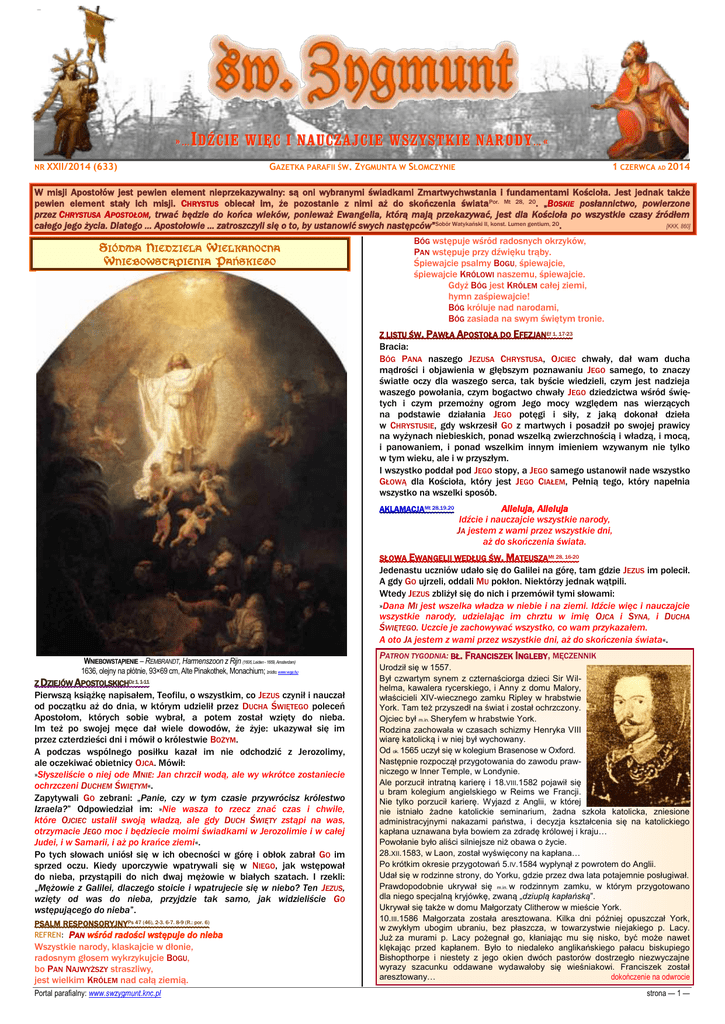 »… IDŹCIE WIĘC I NAUCZAJCIE WSZYSTKIE NARODY…« NR XXII/2014 (633) GAZETKA PARAFII ŚW. ZYGMUNTA W SŁOMCZYNIE 1 CZERWCA AD 2014 W misji Apostołów jest pewien element nieprzekazywalny: są oni wybranymi świadkami Zmartwychwstania i fundamentami Kościoła. Jest jednak także pewien element stały ich misji. CHRYSTUS obiecał im, że pozostanie z nimi aż do skończenia świata Por. Mt 28, 20. „BOSKIE posłannictwo, powierzone przez CHRYSTUSA APOSTOŁOM, trwać będzie do końca wieków, ponieważ Ewangelia, którą mają przekazywać, jest dla Kościoła po wszystkie czasy źródłem całego jego życia. Dlatego … Apostołowie … zatroszczyli się o to, by ustanowić swych następców”Sobór Watykański II, konst. Lumen gentium, 20. [KKK, 860] SIÓDMA NIEDZIELA WIELKANOCNA WNIEBOWSTĄPIENIA PAŃSKIEGO BÓG wstępuje wśród radosnych okrzyków, PAN wstępuje przy dźwięku trąby. Śpiewajcie psalmy BOGU, śpiewajcie, śpiewajcie KRÓLOWI naszemu, śpiewajcie. Gdyż BÓG jest KRÓLEM całej ziemi, hymn zaśpiewajcie! BÓG króluje nad narodami, BÓG zasiada na swym świętym tronie. Z LISTU ŚW. PAWŁA APOSTOŁA DO EFEZJANEf 1, 17-23 Bracia: BÓG PANA naszego JEZUSA CHRYSTUSA, OJCIEC chwały, dał wam ducha mądrości i objawienia w głębszym poznawaniu JEGO samego, to znaczy światłe oczy dla waszego serca, tak byście wiedzieli, czym jest nadzieja waszego powołania, czym bogactwo chwały JEGO dziedzictwa wśród świętych i czym przemożny ogrom Jego mocy względem nas wierzących na podstawie działania JEGO potęgi i siły, z jaką dokonał dzieła w CHRYSTUSIE, gdy wskrzesił GO z martwych i posadził po swojej prawicy na wyżynach niebieskich, ponad wszelką zwierzchnością i władzą, i mocą, i panowaniem, i ponad wszelkim innym imieniem wzywanym nie tylko w tym wieku, ale i w przyszłym. I wszystko poddał pod JEGO stopy, a JEGO samego ustanowił nade wszystko GŁOWĄ dla Kościoła, który jest JEGO CIAŁEM, Pełnią tego, który napełnia wszystko na wszelki sposób. AKLAMACJAMt 28,19.20 Alleluja, Alleluja Idźcie i nauczajcie wszystkie narody, JA jestem z wami przez wszystkie dni, aż do skończenia świata. SŁOWA EWANGELII WEDŁUG ŚW. MATEUSZAMt 28, 16-20 Jedenastu uczniów udało się do Galilei na górę, tam gdzie JEZUS im polecił. A gdy GO ujrzeli, oddali MU pokłon. Niektórzy jednak wątpili. Wtedy JEZUS zbliżył się do nich i przemówił tymi słowami: »Dana MI jest wszelka władza w niebie i na ziemi. Idźcie więc i nauczajcie wszystkie narody, udzielając im chrztu w imię OJCA i SYNA, i DUCHA ŚWIĘTEGO. Uczcie je zachowywać wszystko, co wam przykazałem. A oto JA jestem z wami przez wszystkie dni, aż do skończenia świata«. WNIEBOWSTĄPIENIE – REMBRANDT, Harmenszoon z Rijn (1606, Leiden - 1669, Amsterdam) 1636, olejny na płótnie, 93×69 cm, Alte Pinakothek, Monachium; źródło: www.wga.hu Z DZIEJÓW APOSTOLSKICHDz 1, 1-11 Pierwszą książkę napisałem, Teofilu, o wszystkim, co JEZUS czynił i nauczał od początku aż do dnia, w którym udzielił przez DUCHA ŚWIĘTEGO poleceń Apostołom, których sobie wybrał, a potem został wzięty do nieba. Im też po swojej męce dał wiele dowodów, że żyje: ukazywał się im przez czterdzieści dni i mówił o królestwie BOŻYM. A podczas wspólnego posiłku kazał im nie odchodzić z Jerozolimy, ale oczekiwać obietnicy OJCA. Mówił: »Słyszeliście o niej ode MNIE: Jan chrzcił wodą, ale wy wkrótce zostaniecie ochrzczeni DUCHEM ŚWIĘTYM«. Zapytywali GO zebrani: „Panie, czy w tym czasie przywrócisz królestwo Izraela?” Odpowiedział im: »Nie wasza to rzecz znać czas i chwile, które OJCIEC ustalił swoją władzą, ale gdy DUCH ŚWIĘTY zstąpi na was, otrzymacie JEGO moc i będziecie moimi świadkami w Jerozolimie i w całej Judei, i w Samarii, i aż po krańce ziemi«. Po tych słowach uniósł się w ich obecności w górę i obłok zabrał GO im sprzed oczu. Kiedy uporczywie wpatrywali się w NIEGO, jak wstępował do nieba, przystąpili do nich dwaj mężowie w białych szatach. I rzekli: „Mężowie z Galilei, dlaczego stoicie i wpatrujecie się w niebo? Ten JEZUS, wzięty od was do nieba, przyjdzie tak samo, jak widzieliście GO wstępującego do nieba”. PSALM RESPONSORYJNYPs 47 (46), 2-3. 6-7. 8-9 (R.: por. 6) PAN wśród radości wstępuje do nieba Wszystkie narody, klaskajcie w dłonie, radosnym głosem wykrzykujcie BOGU, bo PAN NAJWYŻSZY straszliwy, jest wielkim KRÓLEM nad całą ziemią. REFREN: Portal parafialny: www.swzygmunt.knc.pl PATRON TYGODNIA: BŁ. FRANCISZEK INGLEBY, MĘCZENNIK Urodził się w 1557. Był czwartym synem z czternaściorga dzieci Sir Wilhelma, kawalera rycerskiego, i Anny z domu Malory, właścicieli XIV-wiecznego zamku Ripley w hrabstwie York. Tam też przyszedł na świat i został ochrzczony. Ojciec był m.in. Sheryfem w hrabstwie York. Rodzina zachowała w czasach schizmy Henryka VIII wiarę katolicką i w niej był wychowany. Od ok. 1565 uczył się w kolegium Brasenose w Oxford. Następnie rozpoczął przygotowania do zawodu prawniczego w Inner Temple, w Londynie. Ale porzucił intratną karierę i 18.VIII.1582 pojawił się u bram kolegium angielskiego w Reims we Francji. Nie tylko porzucił karierę. Wyjazd z Anglii, w której nie istniało żadne katolickie seminarium, żadna szkoła katolicka, zniesione administracyjnymi nakazami państwa, i decyzja kształcenia się na katolickiego kapłana uznawana była bowiem za zdradę królowej i kraju… Powołanie było aliści silniejsze niż obawa o życie. 28.XII.1583, w Laon, został wyświęcony na kapłana… Po krótkim okresie przygotowań 5.IV.1584 wypłynął z powrotem do Anglii. Udał się w rodzinne strony, do Yorku, gdzie przez dwa lata potajemnie posługiwał. Prawdopodobnie ukrywał się m.in. w rodzinnym zamku, w którym przygotowano dla niego specjalną kryjówkę, zwaną „dziuplą kapłańską”. Ukrywał się także w domu Małgorzaty Clitherow w mieśc