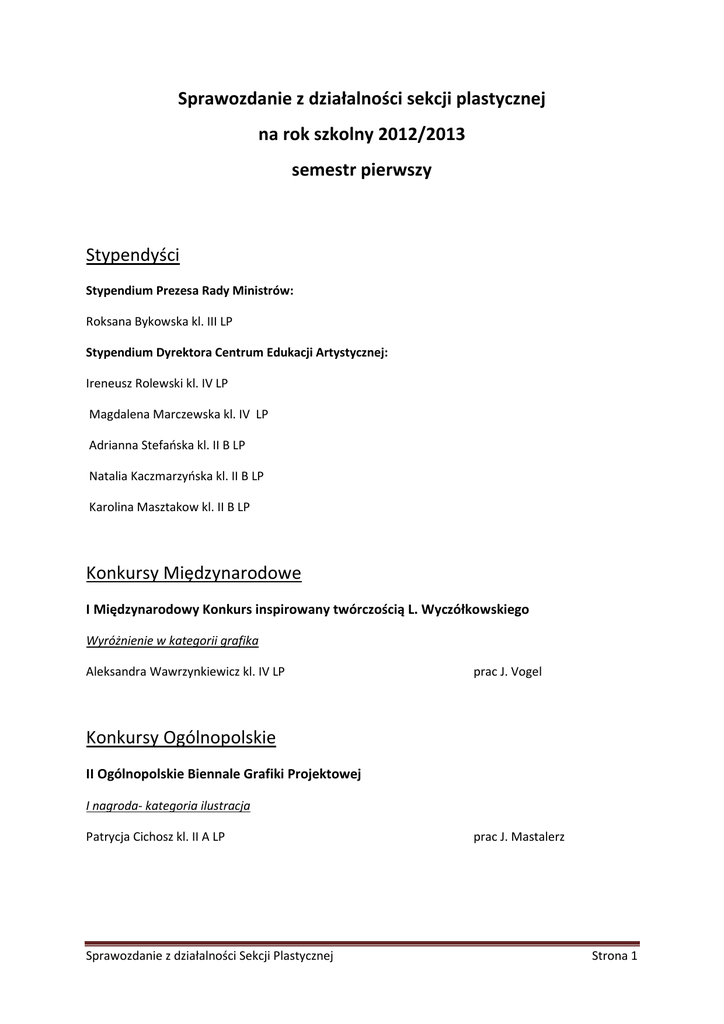 Sprawozdanie z działalności sekcji plastycznej 2012 2013