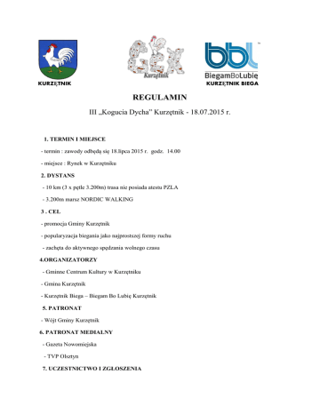 KURZĘTNIK KURZĘTNIK BIEGA REGULAMIN III „Kogucia Dycha” Kurzętnik - 18.07.2015 r. 1. TERMIN I MIEJSCE - termin : zawody odbędą się 18.lipca 2015 r. godz. 14.00 - miejsce : Rynek w Kurzętniku 2. DYSTANS - 10 km (3 x pętle 3.200m) trasa nie posiada atestu PZLA - 3.200m marsz NORDIC WALKING 3 . CEL - promocja Gminy Kurzętnik - popularyzacja biegania jako najprostszej formy ruchu - zachęta do aktywnego spędzania wolnego czasu 4.ORGANIZATORZY - Gminne Centrum Kultury w Kurzętniku - Gmina Kurzętnik - Kurzętnik Biega – Biegam Bo Lubię Kurzętnik 5. PATRONAT - Wójt Gminy Kurzętnik 6. PATRONAT MEDIALNY - Gazeta Nowomiejska - TVP Olsztyn 7. UCZESTNICTWO I ZGŁOSZENIA -W biegu mogą uczestniczyć zawodnicy którzy: dokonają zgłoszenia za pośrednictwem internetowego systemu zgłoszeń (formularz zgłoszeniowy dostępny na stronie www.elektronicznezapisy.pl) do dnia 13.07.2015r Wpisowe w kwocie - 30 zł Zapisu będzie można dokonać również w dniu biegu w biurze zawodów w godz. 10.00-13.30 w kwocie 50zł biuro zawodów znajdować się będzie w Przedszkolu przy ul. Jagiełły 15 ukończyli 16 lat (osoby nieletnie przedstawiają pisemną zgodę rodzica lub opiekuna prawnego na start w zawodach) podpiszą oświadczenie o takiej zdolności i starcie na własną odpowiedzialność. - do marszu Nordic Walking zapisy w dniu zawodów (bez opłat) 8 .KATEGORIE WIEKOWE kategoria OPEN kobiet i mężczyzn I-III m Kategorie wiekowe : KOBIETY MĘŻCZYŹNI K1-16-19 lat M1- 16-19 lat K2- 20-29 lat M2 – 20-29 lat K3-30-39 lat M3- 30 -39 lat K4 – 40-49 lat M4- 40-49 lat K5 – 50 i powyżej M5 – 50-59 lat M6- 60- i powyżej 9. NAGRODY - dla każdego zawodnika , który ukończy bieg pamiątkowy medal na mecie - zwycięzcy w kategorii „OPEN” kobiet i mężczyzn otrzymają nagrody finansowe lub rzeczowe - dla zwycięzców kat. open kobiet i mężczyzn puchar - nagrody rzeczowe dla najlepszych trzech zawodników/czek w kategoriach - wśród uczestników marszu -losowanie nagród niespodzianek po dekoracji biegu - wręczanie nagród odbędzie się w Amfiteatrze na Górze Zamkowej około godz. 16:00 - organizator zastrzega sobie wprowadzenie dodatkowych kategorii 10. SPRAWY ORGANIZACYJNE - Każdy z uczestników biegu odpowiada za swój stan zdrowia , akceptuje regulamin i wyraża zgodę na przetwarzanie i publikacje wyników ,zdjęć materiałów promocyjnych związanych z promocją zawodów. - Zawody będą przeprowadzone zgodnie z przepisami PZLA, - Zawody odbędą się bez względu na warunki atmosferyczne - Pomiar czasu za pomocą chipów -zwrot chipów na mecie. - Zapewniamy posiłek regeneracyjny po biegu ,wodę podczas biegu , - zapewniamy ,opiekę medyczną, szatnie ,WC. - Kontakt: koordynator biegu Dorota Pawłowska tel. 694326995, [email protected] Andrzej Kowalczyk tel. 504 203 104