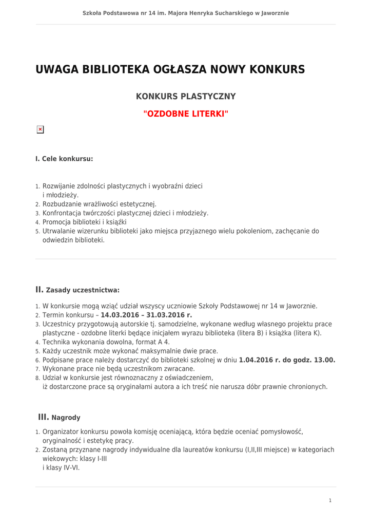Szkoła Podstawowa nr 14 im. Majora Henryka Sucharskiego w Jaworznie UWAGA BIBLIOTEKA OGŁASZA NOWY KONKURS KONKURS PLASTYCZNY "OZDOBNE LITERKI" I. Cele konkursu: 1. 2. 3. 4. 5. Rozwijanie zdolności plastycznych i wyobraźni dzieci i młodzieży. Rozbudzanie wrażliwości estetycznej. Konfrontacja twórczości plastycznej dzieci i młodzieży. Promocja biblioteki i ksiąźki Utrwalanie wizerunku biblioteki jako miejsca przyjaznego wielu pokoleniom, zachęcanie do odwiedzin biblioteki. II. Zasady uczestnictwa: 1. 2. 3. 4. 5. 6. 7. 8. W konkursie mogą wziąć udział wszyscy uczniowie Szkoły Podstawowej nr 14 w Jaworznie. Termin konkursu – 14.03.2016 – 31.03.2016 r. Uczestnicy przygotowują autorskie tj. samodzielne, wykonane według własnego projektu prace plastyczne - ozdobne literki będące inicjałem wyrazu biblioteka (litera B) i książka (litera K). Technika wykonania dowolna, format A 4. Każdy uczestnik może wykonać maksymalnie dwie prace. Podpisane prace należy dostarczyć do biblioteki szkolnej w dniu 1.04.2016 r. do godz. 13.00. Wykonane prace nie będą uczestnikom zwracane. Udział w konkursie jest równoznaczny z oświadczeniem, iż dostarczone prace są oryginałami autora a ich treść nie narusza dóbr prawnie chronionych. III. Nagrody Organizator konkursu powoła komisję oceniającą, która będzie oceniać pomysłowość, oryginalność i estetykę pracy. 2. Zostaną przyznane nagrody indywidualne dla laureatów konkursu (I,II,III miejsce) w kategoriach wiekowych: klasy I-III i klasy IV-VI. 1. 1 Szkoła Podstawowa nr 14 im. Majora Henryka Sucharskiego w Jaworznie Ogłoszenie wyników nastąpi 7.04.2016 r. 4. Informacja w wynikach konkursu umieszczona zostanie na tablicy ogłoszeń biblioteki oraz na stronie internetowej szkoły w zakładce – biblioteka. 5. Nagrody wręczone zostaną na apelu szkolnym. 3. IV. Organizator Biblioteka szkolna. 2. Szczegółowych informacji o konkursie udziela nauczyciel – bibliotekarz. 1. 2