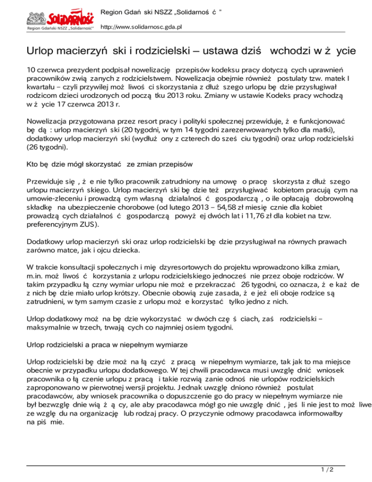 Region Gda ski NSZZ „Solidarno http://www.solidarnosc.gda.pl Urlop macierzy ski i rodzicielski ‒ ustawa dzi wchodzi w ycie 10 czerwca prezydent podpisał nowelizacj przepisów kodeksu pracy dotycz cych uprawnie pracowników zwi zanych z rodzicielstwem. Nowelizacja obejmie równie postulaty tzw. matek I kwartału ‒ czyli przywilej mo liwo ci skorzystania z dłu szego urlopu b dzie przysługiwał rodzicom dzieci urodzonych od pocz tku 2013 roku. Zmiany w ustawie Kodeks pracy wchodz w ycie 17 czerwca 2013 r. Nowelizacja przygotowana przez resort pracy i polityki społecznej przewiduje, e funkcjonowa b d : urlop macierzy ski (20 tygodni, w tym 14 tygodni zarezerwowanych tylko dla matki), dodatkowy urlop macierzy ski (wydłu ony z czterech do sze ciu tygodni) oraz urlop rodzicielski (26 tygodni). Kto b dzie mógł skorzysta ze zmian przepisów Przewiduje si , e nie tylko pracownik zatrudniony na umow o prac skorzysta z dłu szego urlopu macierzy skiego. Urlop macierzy ski b dzie te przysługiwa kobietom pracuj cym na umowie-zleceniu i prowadz cym własn działalno gospodarcz , o ile opłacaj dobrowoln składk na ubezpieczenie chorobowe (od lutego 2013 ‒ 54,58 zł miesi cznie dla kobiet prowadz cych działalno gospodarcz powy ej dwóch lat i 11,76 zł dla kobiet na tzw. preferencyjnym ZUS). Dodatkowy urlop macierzy ski oraz urlop rodzicielski b zarówno matce, jak i ojcu dziecka. dzie przysługiwał na równych prawach W trakcie konsultacji społecznych i mi dzyresortowych do projektu wprowadzono kilka zmian, m.in. mo liwo korzystania z urlopu rodzicielskiego jednocze nie przez oboje rodziców. W takim przypadku ł czny wymiar urlopu nie mo e przekracza 26 tygodni, co oznacza, e ka de z nich b dzie miało urlop krótszy. Obecnie obowi zuje zasada, e je eli oboje rodzice s zatrudnieni, w tym samym czasie z urlopu mo e korzysta tylko jedno z nich. Urlop dodatkowy mo na b dzie wykorzysta w dwóch cz ciach, za maksymalnie w trzech, trwaj cych co najmniej osiem tygodni. rodzicielski ‒ Urlop rodzicielski a praca w niepełnym wymiarze Urlop rodzicielski b dzie mo na ł czy z prac w niepełnym wymiarze, tak jak to ma miejsce obecnie w przypadku urlopu dodatkowego. W tej chwili pracodawca musi uwzgl dni wniosek pracownika o ł czenie urlopu z prac i takie rozwi zanie odno nie urlopów rodzicielskich zaproponowano w pierwotnej wersji projektu. Jednak uwzgl dniono równie postulat pracodawców, aby wniosek pracownika o dopuszczenie go do pracy w niepełnym wymiarze nie był bezwzgl dnie wi cy, ale aby pracodawca mógł go nie uwzgl dni , je li nie jest to mo ze wzgl du na organizacj lub rodzaj pracy. O przyczynie odmowy pracodawca informowałby na pi mie. 1/2 liwe Region Gda ski NSZZ „Solidarno http://www.solidarnosc.gda.pl Nowy wymiar urlopu, który pracownica mo e wykorzysta przed porodem Ze wzgl du na do powszechn krytyk obecnego rozwi zania w tym zakresie, proponuje si aby w przepisach okre li maksymalny (a nie minimalny) wymiar tego urlopu mo liwy do wykorzystania przed porodem. Proponuje si zatem, aby nie wi cej ni przed przewidywan dat porodu. Wysoko zasiłku macierzy 6 tygodni urlopu macierzy skiego mogło przypada skiego Zgodnie z nowelizacj , zasiłek macierzy ski b dzie przysługiwał przez okres urlopu macierzy skiego, okres dodatkowego urlopu macierzy skiego (w wysoko ci jak dotychczas 100 proc. podstawy wymiaru), jak równie przez okres okre lony przepisami kodeksu pracy jako okres urlopu rodzicielskiego w wysoko ci 60 proc. podstawy wymiaru. W sytuacji, gdy ubezpieczona w trybie art. 1791 kodeksu pracy ‒ czyli w terminie 14 dni od dnia porodu, zło y pracodawcy pisemny wniosek o udzielenie jej, bezpo rednio po urlopie macierzy skim dodatkowego urlopu macierzy skiego w pełnym wymiarze, a bezpo rednio po takim urlopie urlopu rodzicielskiego w pełnym wymiarze, przysługiwa jej b dzie zasiłek w wysoko ci 80 proc. podstawy wymiaru przez cały okres trwania urlopów zwi zanych z rodzicielstwem. Maria Szwajkiewicz Dział Prawny RG NSZZ „Solidarno stan prawny na 17.05.2013 r. 2/2 Powered by TCPDF (www.tcpdf.org) ,