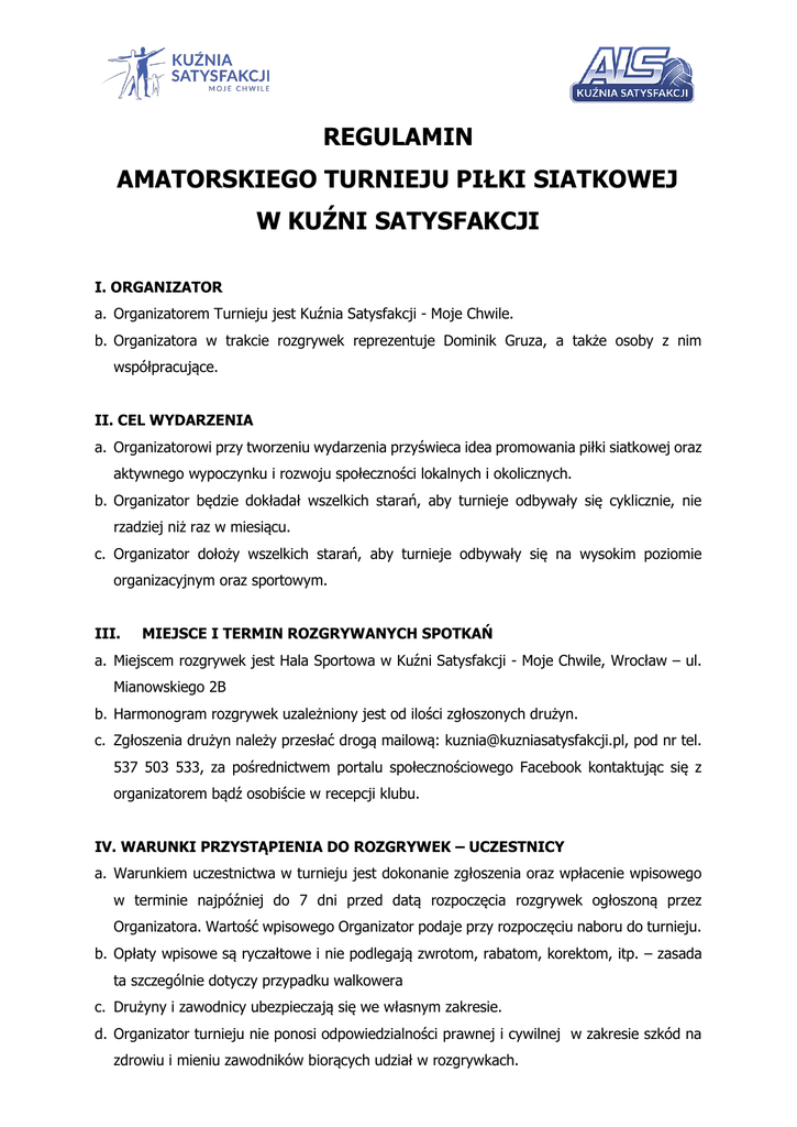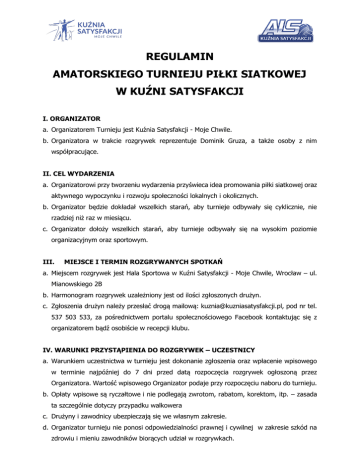 REGULAMIN AMATORSKIEGO TURNIEJU PIŁKI SIATKOWEJ W KUŹNI SATYSFAKCJI I. ORGANIZATOR a. Organizatorem Turnieju jest Kuźnia Satysfakcji - Moje Chwile. b. Organizatora w trakcie rozgrywek reprezentuje Dominik Gruza, a także osoby z nim współpracujące. II. CEL WYDARZENIA a. Organizatorowi przy tworzeniu wydarzenia przyświeca idea promowania piłki siatkowej oraz aktywnego wypoczynku i rozwoju społeczności lokalnych i okolicznych. b. Organizator będzie dokładał wszelkich starań, aby turnieje odbywały się cyklicznie, nie rzadziej niż raz w miesiącu. c. Organizator dołoży wszelkich starań, aby turnieje odbywały się na wysokim poziomie organizacyjnym oraz sportowym. III. MIEJSCE I TERMIN ROZGRYWANYCH SPOTKAŃ a. Miejscem rozgrywek jest Hala Sportowa w Kuźni Satysfakcji - Moje Chwile, Wrocław – ul. Mianowskiego 2B b. Harmonogram rozgrywek uzależniony jest od ilości zgłoszonych drużyn. c. Zgłoszenia drużyn należy przesłać drogą mailową: [email protected], pod nr tel. 537 503 533, za pośrednictwem portalu społecznościowego Facebook kontaktując się z organizatorem bądź osobiście w recepcji klubu. IV. WARUNKI PRZYSTĄPIENIA DO ROZGRYWEK – UCZESTNICY a. Warunkiem uczestnictwa w turnieju jest dokonanie zgłoszenia oraz wpłacenie wpisowego w terminie najpóźniej do 7 dni przed datą rozpoczęcia rozgrywek ogłoszoną przez Organizatora. Wartość wpisowego Organizator podaje przy rozpoczęciu naboru do turnieju. b. Opłaty wpisowe są ryczałtowe i nie podlegają zwrotom, rabatom, korektom, itp. – zasada ta szczególnie dotyczy przypadku walkowera c. Drużyny i zawodnicy ubezpieczają się we własnym zakresie. d. Organizator turnieju nie ponosi odpowiedzialności prawnej i cywilnej w zakresie szkód na zdrowiu i mieniu zawodników biorących udział w rozgrywkach. V. USTALENIA ORGANIZACYJNE a. Wszyscy zawodnicy zobowiązani są do przestrzegania niniejszego regulaminu b. Organizator jest odpowiedzialny za: - udostępnienie boiska wraz z osprzętem - udostępnienie piłek do rozgrywania meczów - zapewnienie obsługi sędziowskiej - zapewnienie szatni drużynom startującym w turnieju c. Organizator zwraca się z prośbą o pozostawienie szatni i natrysków w stanie należytego porządku. d. Organizator nie odpowiada za rzeczy pozostawione w szatni. e. Organizator zastrzega sobie prawo ostatecznej interpretacji wszelkich kwestii spornych. f. Podczas turnieju obowiązuje całkowity zakaz palenia i spożywania alkoholu na terenie obiektu sportowego. g. W przypadku przekroczenia niniejszego regulaminu w stopniu nieprzewidzianym przez Organizatora decyzję w sprawie podejmuje Organizator a uczestnik dostosuje się do decyzji bez prawa odwołania. VI. OBOWIĄZKI DRUŻUN a. Drużyna może liczyć max 12 osób b. Drużyna wypełnia kartę zawodników (dalej - Lista zgłoszenia) c. Lista zgłoszenia obowiązuje do końca trwania rozgrywek d. Lista zgłoszenia może być zmodyfikowana w trakcie rozgrywek (można dopisać zawodnika z zastrzeżeniem pkt e poniżej) e. Zawodnik może występować tylko w jednym zespole w trakcie turnieju. f. Zawodnicy zobowiązani są do posiadania stroju sportowego oraz obuwia sportowego. VII. ZASADY PRZEPROWADZANIA ZAWODÓW a. Każde spotkanie w ramach turnieju sędziować będzie sędzia główny. b. Sędziego głównego mogą wspierać sędziowie pomocniczy. c. Przerwę na żądanie zgłasza trener, kierownik lub kapitan drużyny sędziemu głównemu odpowiednim gestem lub słowem. d. W sytuacjach spornych tylko kapitan ma prawo interpretacji decyzji sędziego. VIII. PRZEPISY GRY a. Spotkania będą rozgrywane zgodnie z przepisami gry w siatkówkę zatwierdzonymi przez PZPS ze zmianami organizatora zawartymi w Regulaminie Amatorskiego Turnieju w Kuźni Satysfakcji. b. Mecze rozgrywane będą do dwóch wygranych setów, każdy do 25pkt (z przewagą 2 pkt). c. Set trzeci w przypadku remisu rozgrywany będzie do 15 punktów (z przewagą 2 pkt). d. Każdej drużynie przysługuje 2 przerwy na żądanie w każdym secie (nie ma żadnych innych przerw w setach). e. Przerwa między setami trwa max 3 minuty. f. Zmiany zgodnie z przepisami PZPS (6 zmian powrotnych w jednym secie). g. Dopuszcza się do gry drużyny zdekompletowane, jednak liczba zawodników nie może być mniejsza niż czterech. h. W trakcie trwania rozgrywek obowiązuje zasada fair – play i. Niestawienie się drużyny na boisku w ciągu 10 minut od wyznaczonego terminu rozpoczęcia gry, skutkuje uznaniem walkowera. Uzasadnione spóźnienie (siła wyższa, zdarzenia losowe) zgłoszone przed upływem czasu, o którym mowa powyżej, może skutkować przywróceniem rozgrywki. Decyzję podejmuje Organizator. j. W przypadku walkowera, drużyna która stawiła się na boisku zostaje uznana za zwycięzcę rozgrywki w układzie 2:0 (I set 25:0, II set 25:0). IX. PUNKTACJA a. Punktacja: - Za wygrany mecz w stosunku 2 : 0 drużyna otrzymuje 3 punkty - Za wygrany mecz w stosunku 2 : 1 drużyna otrzymuje 2 punkty - Za przegrany mecz w stosunku 1 : 2 drużyna otrzymuje 1 punkt - Za przegrany mecz w stosunku 0 : 2 drużyna otrzymuje 0 punktów - Oddanie meczu przez walkower skutkuje odjęciem jednego punktu, a drużyna przeciwna otrzymuje 3 pkt według reguły zawartej w pkt. VIII/j b. O kolejności miejsc w turnieju decyduje kolejno: - Łączna ilość zdobytych punktów - Lepszy (wyższy) stosunek setów zdobytych do straconych - Wynik meczu grupowego bezpośrednio zainteresowanych drużyn W SYTUACJACH NIE OBJĘTYCH REGULAMINEM DECYZJE PODEMUJE ORGANIZATOR TURNIEJU. ……..…………………… podpis Organizatora