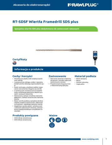 Akcesoria do elektronarzędzi RT-SDSF Wiertła Framedrill SDS plus Specjalne wiertła SDS plus dedykowane do zamocowań ramowych Certyfikaty Informacja o produkcie Cechy i korzyści Zastosowanie Materiał podłoża • Monolityczna płytka widii zwiększa żywot ność wiertła • 3 powierzchnie odciągu urobku i specjalny kształt wiertła ułatwiają wyprowadzenie py łu • Punkt centrujący umożliwia szybkie rozpo czecie wiercenia bez ślizgania się wiertła • 3 symetrycznie rozmieszczone krawędzie tnące umożliwiają dokonanie idealnie pro stych i osiowych odwiertów • Wzmocniony uchwyt umożliwia wiercenie głębokich i cieńkich otworów bez złamania wiertła • Rdzeń wiertła poddany specjalnej obróbce cieplnej zwiększa elastyczność, odporność na skręcenie i zapobiega złamaniu wiertła • Wyjątkowo wysoka jakość, cylindryczność i osiowość wykonanych otworów, potwier dzona międzynarodowym certyfikatem Si cherSafe • Wiercenie otworów w betonie zbrojonym i twardej cegle pod zamocowania ramowe • Przystosowane do pracy wraz z młotowiertarką SDS plus • • • • Produkty powiązane Ważne Beton zbrojony Beton Kamień naturalny Cegła pełna • WHO Wkręt ościeżnicowy • WHS Wkręt ościeżnicowy www.rawlplug.com 1 Akcesoria do elektronarzędzi Dane Techniczne Średnica wierce nia Długość Długość robocza Ilość [mm] [mm] [mm] [szt] kg kg RT-SDSF-6/260 6 260 200 1 0.07 0.07 5906675046389 RT-SDSF-65/260 6.5 260 200 1 0.08 0.08 5906675046372 Indeks Waga opakowania Waga opakowania jednostkowego zbiorczego EAN www.rawlplug.com 2