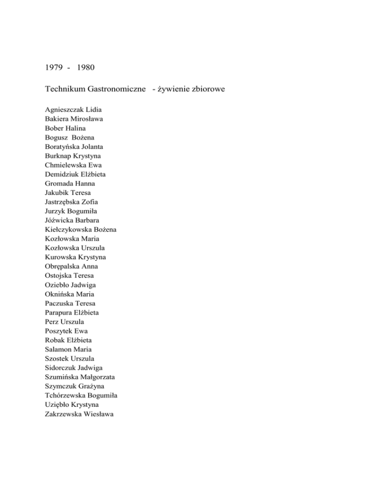 1979 - 1980 Technikum Gastronomiczne - żywienie zbiorowe Agnieszczak Lidia Bakiera Mirosława Bober Halina Bogusz Bożena Boratyńska Jolanta Burknap Krystyna Chmielewska Ewa Demidziuk Elżbieta Gromada Hanna Jakubik Teresa Jastrzębska Zofia Jurzyk Bogumiła Jóźwicka Barbara Kiełczykowska Bożena Kozłowska Maria Kozłowska Urszula Kurowska Krystyna Obrępalska Anna Ostojska Teresa Oziebło Jadwiga Oknińska Maria Paczuska Teresa Parapura Elżbieta Perz Urszula Poszytek Ewa Robak Elżbieta Salamon Maria Szostek Urszula Sidorczuk Jadwiga Szumińska Małgorzata Szymczuk Grażyna Tchórzewska Bogumiła Uziębło Krystyna Zakrzewska Wiesława Technikum Gastronomiczne dla Pracujących - żywienie zbiorowe Bielak Agnieszka Celińska Barbara Ciołek Jolanta Czarnocka Anna Czarnocka Bożena Danielak Renata Duchewicz Danuta Domańska Barbara Gajowniczek-Onisk Hanna Głowacka Janina Jagielak Elżbieta Jasińska Bożena Juszczuk Marianna Kaczkiewicz Zofia Kozak Barbara Kożuchowska Lidia Kukla Mirosława Łaszczych Teresa Łęczycka Maria Maciejewska Celina Nasiłowska Maria Niedziółka Bogusława Skwierczyńska Helena Stefaniuk Danuta Stepnik Joanna Świnarska Danuta Siwko Agnieszka Oknińska Ewa Olejniczak Anna Orzyłowska Teresa Rycielska Barbara Sawicka Danuta Sitarz Jadwiga Suchożebska Anna Szczecińska Halina Tymoszuk Krystyna Wedziuk Lidia Wyszomirska Danuta Zubek Elżbieta po zasadniczej szkole zawodowej Liceum Zawodowe wych. P. Miler Bareja Bożena Goszczyńska Emilia Endzelm Andrzej Graczyk Ewa Gotowicka Maria Garucka Stefania Jakubik Jolanta Kania Cecylia Kania Ewa Kania Elżbieta Kurowska Bożena Kiryluk Elżbieta Kulik Mirosława Kruk Hanna Mioduska Urszula Świderska Urszula Powichrowska Hanna Olopiak Anna Perz Irena Pikulska Bożena Stefaniuk Henryka Serafin Barbara Skolimowska Barbara Stefaniuk Wiesława Solnica Elżbieta Wyrębska Grażyna Wyszomirska Maria Zielonka Jolanta Skorupka Agnieszka Zagajewska Agnieszka - kelner bufetowy ( IV ) Technikum Samochodowe po zasadniczej szkole zawodowej - naprawa i eksploatacja pojazdów samochodowych ( III ts ) wych. M. Konstantynowicz Brzezik Jacenty Czarnocki Dariusz Gil Lech Jobczyk Daniel Krasuski Andrzej Klewek Henryk Księżopolski Michał Lange Tadeusz Łazowski Franciszek Ługowski Jan Sobiecki Mirosław Śnieżko Jerzy Szostek Marian Pawlak Dariusz Pastor Andrzej Porzeziński Stanisław Pykało Jan Walecki Zdzisław Winek Zbigniew Zatorski Mieczysław Zawada Aleksander Zdanowicz Włodzimierz Technikum Budowlane wych. B. Gajowniczek Basek Jolanta Chacińska Wiesława Czapski Ryszard Czarny Janusz Dobosz Andrzej Czerska Anna Gałecka Elżbieta Gomółka Adam Izdebski Waldemar Jaworski Adam Kamecki Adam Karpiniuk Alina Kępkowski Zbigniew Kozak Joanna Lewczuk Grażyna Łęczycka Anna Łukasiuk Apoloniusz Mąka Barbara Parobczy Anna Płudowski Waldemar Redosz Agnieszka Rucki Waldemar Toczyski Sławomir Wereszczuk Jarosław Wereszczyński Jarosław Więckowska Barbara - prefabrykacja materiałów budowlanych ( V Pa ) Technikum Budowlane - prefabrykacja budowlana ( V Pb ) wych. J. Kosmalska Bareja Marek Bartosiak Andrzej Berny Krzysztof Borkowski Zbigniew Chomka Zbigniew Czapski Leszek Czerko Teresa Dziedziula Marzenna Giereło Hanna Górnicki Andrzej Jarosz Beata Kacprzak Bogumił Kisiel Józef Książek Kazimierz Łukasiuk Janusz Pieńkowski Zbigniew Pykało Krzysztof Rozbicki Wiesław Skaruz Małgorzata Staręga Zofia Szymczuk Leszek Wereda Leszek Wielądek Marek Wymiatał Janusz Wysocki Krzysztof Zawadzki Adam Zawadzki Jerzy Żakiewicz Krystyna Technikum Budowlane po zasadniczej szkole zawodowej -budownictwo wiejskie ( I aw ) wych. T. Jakubowski Biarda Roman Bielecki Bogumił Boguszewski Jan Bulik Teresa Borkowska Danuta Groszek Danuta Lipiński Edward Modzelewski Jan Okseniuk Mirosław Podgórski Ryszard Solka Bogusław Szydlik Grzegorz Tymosiak Kazimierz Wysokiński Karol Policealne Studium Zawodowe po - budownictwo wiejskie ( II PSZ ) wych. J. Dobrzański Babicz Marek Bakiera Hanna Bednarczyk Ewa Chwedoruk Irena Czyżewska Marianna Czyżewski Dariusz Frankowska Anna Gawrońska Halina Giess Maria Gołaszewski Edward Jarczewska Ewa Joszt Jadwiga Klepacki Władysław Komar Tadeusz Kościesza Ewa Kowalczyk Grzegorz Kowalczyk Krystyna Królikowska Ewa Kulesz Mirosława Kulikowska Ewa Latus Andrzej Lewczuk Anna Łukaszuk Anna Michalak Danuta Michalczuk Joanna Nowosielska Barbara Pernach Krzysztof Sadowa Anna Suchodolska Iwona Szkopek Bożena Świnarska Teresa Terlikowska Elżbieta Trochimiak Elżbieta Wyczółkowska Elżbieta Zwolińska Elżbieta Żukowska Hanna Liceum Ogólnokształcącym Zasadnicza Szkoła Zawodowa nr 2 Brauła Elżbieta Bogun Stanisława Bulak Halina Dmowska Jolanta Danuta Dmowska Jolanta Małgorzata Dmowska Teresa Głuchowska Krystyna Filip Jolanta Jaczewska Małgorzata Jastrzębska Ewa Kielak Grażyna Komorowska Grażyna Kordaczuk Beata Kowalczyk Teresa Kozak Józefa Kozakiewicz Jolanta Kudlak Urszula Księżopolska Barbara Kisiel Barbara Korneć Hanna Król Mirosława Lipińska Krystyna Leszczuk Celina Mamcarz Danuta Marciniak Bożena Michalak Grażyna Miłkowska Danuta Owsianko Elżbieta Smyk Teresa Sobiczewska Ewa Szafrańska Hanna Szewczuk Ewa Pawlak Anna Piotrak Lidia Prus Elżbieta Rykowska Ewa Uziębło Elżbieta Wareluk Maria Wereda Elżbieta Wojtczuk Mieczysława Wyrębiak Krystyna Zawolska Bożena Zegardło Ewa Zemła Bożena - kucharz – garmażer ( III g ) Zasadnicza Szkoła Zawodowa wych. M. Taraszkiewicz Bany Elżbieta Bierówka Małgorzata Ciura Janina Chodowiec Krystyna Dadacz Hanna Dąbrowska Alicja Dabrowa Małgorzata Głogowska Renata Kaniewska Bożena Karczewska Bogumiła Komuda Krystyna Konopka Teresa Kowalczyk Wiesława Koziestańska Krystyna Marczak Joanna Michalak Elżbieta Mróz Marianna Niewęgłowska Barbara Patoleta Maria Radczuk Elżbieta Sidorczuk Janina Trebicka Małgorzata Trześniewska Elżbieta Szwogżlis Marzena Woźniak Elżbieta Wymiatał Małgorzata Zemło Teresa Zacharczu