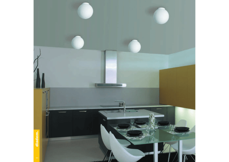 044 diadem. diadem. design LUCIS Typ: stropní svítidlo Stínítko: sklo bílé, ručně foukané, trojvrstvé, satén opál mat Kovové části: bílý lak matný (1), chrom (2) Type: ceiling lamp Diffuser: white, hand-blown, three-plied, satin opal matt glass Metal parts: white paint matt (1), chrome (2) Тип: потолочный светильник Абажур: стекло белoe, вручную выдувное, трёхслойное, сатин опаловое матовое Металлические части: белый лак матовый (1), хром (2) Leuchtentyp: Deckenleuchte Schirm: weißes, mundgeblasenes, dreischichtiges, Opalglas seidenmatt Metallteile: weißer Lack matt (1), verchromt (2) Type: luminaire plafonnier Abat-jour: verre blanc, soufflé de manière artisanale, à trois couches, satin opale mat Éléments métalliques: blanc laque mat (1), chromé (2) X- 1 S12.1X1.200 1 x max 60(46)W E27 1 x max 10W E27 IP 20 S12.1X1.250 1 x max 75(57)W E27 1 x max 12W E27 IP 20 S12.1X1.300 1 x max 100(77)W E27 1 x max 16W E27 IP 20 S12.2X1.250 EVG 1 x max 18W G24q-2 IP 20 EMC S12.2X1.300 EVG 1 x max 26W G24q-3 IP 20 EMC X- 2 diadem. Typ: lampa sufitowa Dyfuzor: szkło białe, ręcznie produkowane, trzy-warstwowe, satyn opal mat Części metalowe: biały lakier matowy (1), chrom (2) 045