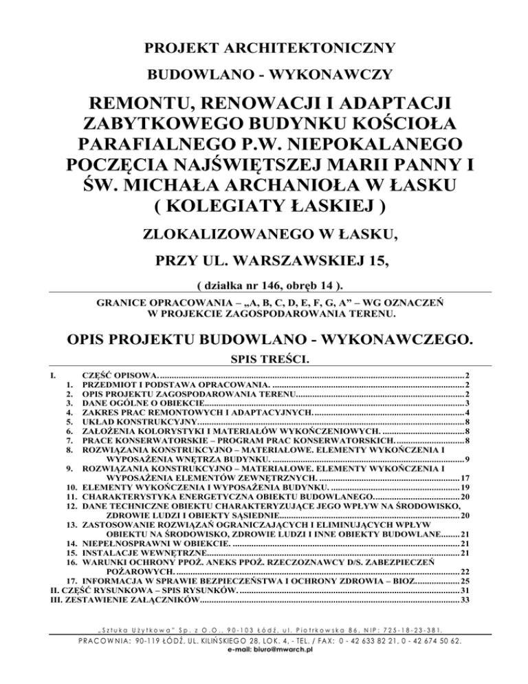 PROJEKT ARCHITEKTONICZNY BUDOWLANO - WYKONAWCZY REMONTU, RENOWACJI I ADAPTACJI ZABYTKOWEGO BUDYNKU KOŚCIOŁA PARAFIALNEGO P.W. NIEPOKALANEGO POCZĘCIA NAJŚWIĘTSZEJ MARII PANNY I ŚW. MICHAŁA ARCHANIOŁA W ŁASKU ( KOLEGIATY ŁASKIEJ ) ZLOKALIZOWANEGO W ŁASKU, PRZY UL. WARSZAWSKIEJ 15, ( działka nr 146, obręb 14 ). GRANICE OPRACOWANIA – „A, B, C, D, E, F, G, A” – WG OZNACZEŃ W PROJEKCIE ZAGOSPODAROWANIA TERENU. OPIS PROJEKTU BUDOWLANO - WYKONAWCZEGO. SPIS TREŚCI. I. CZĘŚĆ OPISOWA. ..................................................................................................................................2 PRZEDMIOT I PODSTAWA OPRACOWANIA. ..................................................................................2 OPIS PROJEKTU ZAGOSPODAROWANIA TERENU........................................................................2 DANE OGÓLNE O OBIEKCIE...............................................................................................................3 ZAKRES PRAC REMONTOWYCH I ADAPTACYJNYCH. ................................................................4 UKŁAD KONSTRUKCYJNY..................................................................................................................8 ZAŁOŻENIA KOLORYSTYKI I MATERIAŁÓW WYKOŃCZENIOWYCH. ...................................8 PRACE KONSERWATORSKIE – PROGRAM PRAC KONSERWATORSKICH. .............................8 ROZWIĄZANIA KONSTRUKCYJNO – MATERIAŁOWE. ELEMENTY WYKOŃCZENIA I WYPOSAŻENIA WNĘTRZA BUDYNKU. ..................................................................................9 9. ROZWIĄZANIA KONSTRUKCYJNO – MATERIAŁOWE. ELEMENTY WYKOŃCZENIA I WYPOSAŻENIA ELEMENTÓW ZEWNĘTRZNYCH. ............................................................ 17 10. ELEMENTY WYKOŃCZENIA I WYPOSAŻENIA BUDYNKU. ....................................................... 19 11. CHARAKTERYSTYKA ENERGETYCZNA OBIEKTU BUDOWLANEGO..................................... 20 12. DANE TECHNICZNE OBIEKTU CHARAKTERYZUJĄCE JEGO WPŁYW NA ŚRODOWISKO, ZDROWIE LUDZI I OBIEKTY SĄSIEDNIE............................................................................. 20 13. ZASTOSOWANIE ROZWIĄZAŃ OGRANICZAJĄCYCH I ELIMINUJĄCYCH WPŁYW OBIEKTU NA ŚRODOWISKO, ZDROWIE LUDZI I INNE OBIEKTY BUDOWLANE........ 21 14. NIEPEŁNOSPRAWNI W OBIEKCIE. ................................................................................................. 21 15. INSTALACJE WEWNĘTRZNE............................................................................................................ 21 16. WARUNKI OCHRONY PPOŻ. ANEKS PPOŻ. RZECZOZNAWCY D/S. ZABEZPIECZEŃ POŻAROWYCH. ......................................................................................................................... 22 17. INFORMACJA W SPRAWIE BEZPIECZEŃSTWA I OCHRONY ZDROWIA – BIOZ................... 25 II. CZĘŚĆ RYSUNKOWA – SPIS RYSUNKÓW. .............................................................................................. 31 III. ZESTAWIENIE ZAŁĄCZNIKÓW............................................................................................................... 33 1. 2. 3. 4. 5. 6. 7. 8. „ S z t u k a U ż y t k o w a ” S p . z O . O . , 9 0 - 1 0 3 Ł ó d ź , u l . P i o t r k o w s k a 8 6 , N I P : 7 2 5 - 1 8 - 2 3 - 3 8 1. PRACOWNIA: 90-119 ŁÓDŹ, UL. KILIŃSKIEGO 28, LOK. 4, - TEL. / FAX: 0 - 42 633 82 21, 0 - 42 674 50 62. e-mail: [email protected] I. 1. CZĘŚĆ OPISOWA. PRZEDMIOT I PODSTAWA OPRACOWANIA. Przedmiotem opracowania jest: - projekt architektoniczny, budowlano – wykonawczy remontu, renowacji i adaptacji zabytkowego budynku kościoła parafialnego p.w. Niepokalanego Poczęcia Najświętszej Marii Panny i Św. Michała Archanioła w Łasku ( KOLEGIATY ŁASKIEJ ), zlokalizowanego w Łasku, przy ul. Warszawskiej 15 ( działka nr 146, obręb 14 ), oraz - projekt budowlano – wykonawczy rozbudowy i przebudowy infrastruktury technicznej związanej z ww. remontem i przebudową. INWESTOR: RZYMSKOKATOLICKA PARAFIA NIEPOKALANEGO POCZĘCIA NAJŚWIĘTSZEJ MARII PANNY I ŚWIĘTEGO MICHAŁA ARCHANIOŁA, adres: UL. WARSZAWSKA 15, 98-100 ŁASK. Podstawą wykonania projektu architektonicznego budowlano - wykonawczego są: • Mapa do celów projektowych. • Wytyczne programowe Inwestora. • Umowa z Inwestorem. • Aneks ochrony p.poż. 2. OPIS PROJEKTU ZAGOSPODAROWANIA TERENU. 2.1. ISTNIEJĄCE ZAGOSPODAROWANIE. 2.1.1. Lokalizacja. Teren, na którym projektuje się remont, renowację i adaptację zabytkowego budynku kościoła parafialnego ( KOLEGIATY ŁASKIEJ ), zlokalizowany jest na działce przy ul. Warszawskiej 15 w Łasku. Działka KOLEGIATY znajduje się w centrum miejscowości Łask, obok placu J. Dąbrowskiego, zlokalizowanego w bliskim sąsiedztwie dawnego Rynu w Łasku. 2.1.1. Przyłącza, sieci i instalacje zewnętrzne. Na terenie planowanej inwestycji ( teren działki KOLEGIATY ŁASKIEJ ) znajdują się następujące przyłącza, sieci i instalacje zewnętrzne: • przyłącza i instalacje zewnętrzne wodociągowe, • przyłącza i instalacje zewnętrzne energetyczne i teletechniczne. W bezpośrednim sąsiedztwie działki przebiega kanalizacja deszczowa i sanitarna. UWAGA: szczegółowe opisy przyłączy i instalacji zewnętrznych znajdują się w projektach instalacyjnych branżowych. 2.1.2. Zieleń wysoka. Na terenie działki Kolegiaty Łaskiej znajdują się drzewa, oznaczone w projekcie zagospodarowania terenu. 2.1.3. Układ komunikacyjny. Dojazd do działki, na której zlokalizowana jest Kolegiata Łaska, prowadzi poprzez ul. Warszawską, oraz poprzez ul. T. Kościuszki. 2.2. PROJEKTOWANE ZAGOSPODAROWANIE. 2.2.1. Obiekty budowlane. Projekt remontu, renowacji i adaptacji zabytkowego budynku kościoła parafialnego ( KOLEGIATY ŁASKIEJ ), nie przewiduje budowy nowych obiektów kubaturowych ani zmiany bryły istniejącego budynku. Zaprojektowano renowację i częściowe odtworzenie istniejącego muru o