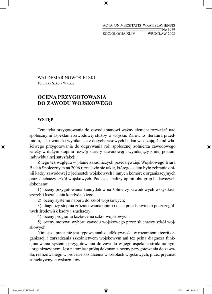 ACTA UNIVERSITATIS WRATISLAVIENSIS No 3079 SOCJOLOGIA XLIV WROCŁAW 2008 WALDEMAR NOWOSIELSKI Toruńska Szkoła Wyższa OCENA PRZYGOTOWANIA DO ZAWODU WOJSKOWEGO WSTĘP Tematyka przygotowania do zawodu stanowi ważny element rozważań nad społecznymi aspektami zawodowej służby w wojsku. Zarówno literatura przedmiotu, jak i wnioski wynikające z dotychczasowych badań wskazują, że od właściwego przygotowania do odgrywania roli społecznej żołnierza zawodowego zależy w dużym stopniu rozwój kariery zawodowej i wynikający z niej poziom indywidualnej satysfakcji. Z tego też względu w planie zasadniczych przedsięwzięć Wojskowego Biura Badań Społecznych na 2006 r. znalazło się takie, którego celem było zebranie opinii kadry zawodowej z jednostek wojskowych i innych komórek organizacyjnych oraz słuchaczy szkół wojskowych. Podczas analizy opinii obu grup badawczych dokonano: 1) oceny przygotowania kandydatów na żołnierzy zawodowych wszystkich szczebli kształcenia kandydackiego; 2) oceny systemu naboru do szkół wojskowych; 3) diagnozy stopnia zróżnicowania opinii i ocen przedstawicieli poszczególnych środowisk kadry i słuchaczy; 4) oceny programu kształcenia szkół wojskowych; 5) oceny motywu wyboru zawodu wojskowego przez słuchaczy szkół wojskowych. Niniejsza praca nie jest typową analizą efektywności w rozumieniu teorii organizacji i zarządzania szkolnictwem wojskowym ani też pełną diagnozą funkcjonowania systemu przygotowania do zawodu w jego aspekcie strukturalnym i organizacyjnym. Jest natomiast próbą dokonania oceny przygotowania do zawodu, realizowanego w procesie kształcenia w szkołach wojskowych, przez pryzmat subiektywnych wskaźników. druk_soc_XLIV.indd 247 2008-11-03 14:13:31 248 WALDEMAR NOWOSIELSKI Ważnym elementem procesu badawczego była analiza stopnia zróżnicowania opinii między reprezentantami różnych środowisk, co pozwoliło na wyodrębnienie elementów wspólnych dla całego szkolnictwa wojskowego oraz tych, które są specyficzne dla określonych typów szkół. Dane empiryczne, na podstawie których prowadzono analizy, zebrane w formie kwestionariusza ankiety realizowanej metodą audytoryjną. Analizie poddano N1 = 474 ankiety wypełnione przez słuchaczy akademii, wyższych szkół oficerskich, studium oficerskiego i szkół podoficerskich oraz N2 = 529 ankiet wypełnionych przez żołnierzy zawodowych z jednostek wojskowych. W analizach statystycznych używano pakietu SPSS. Próba do realizacji badań ankietowych została dobrana na zasadzie doboru warstwowego. Badania zrealizowano w maju i czerwcu 2006 r. MOTYWY WYBORU ZAWODU WOJSKOWEGO Pierwsze pytanie w ankiecie skierowanej do słuchaczy szkół wojskowych i kadry zawodowej odnosiło się do motywów, które decydują o wyborze zawodu wojskowego. Respondentom zaproponowano czternaście motywów i poproszono o wskazanie maksymalnie pięciu ich zdaniem najistotniejszych, mających kluczowe znaczenie przy decyzji o wyborze zawodowej służby wojskowej. Słuchacze, wybierając zawód wojskowego, kierowali się najczęściej następującymi motywami: zainteresowanie wojskiem (62,7%), względy materialne (59,5%), rozwój sportowy (58,0%) oraz prestiż zawodu wojskowego (53,0%). Kadra zawodowa eksponowała głównie względy materialne (68,1%), dodając do tej listy również zjawisko bezrobocia na cywilnym rynku pracy (59,4%). Słuchacze szkół wojskowych twierdzili, że całkowicie samodzielnie podjęli decyzję o wyborze zawodu wojskowego (56,9%). Mniej odnotowano osób, które uważały, że ta decyzja w dużym stopniu była samodzielna, choć uwzględniała również opinie innych osób (40,0%). Najmniej było tych respondentów, którzy uważali, iż tę decyzję podjęli tylko częściowo samodzielnie, kierowali się opinią innych osób (1,9%) lub powyższa decyzja była wynikiem namowy (nacisku) ze strony innych osób (0,8%). Nieliczne osoby nie wiedziały, jakiej odpowiedzi udzielić, i wskazały na kategorię „trudno powiedzieć” (0,4%). Na pytanie: „Czy jest Pan(i) zadowolony(a) z wyboru zawodu wojskowego?”, większość słuchaczy odpowiedziała pozytywnie (85,4%). Niewielu z tej grupy badanych było niezadowolonych (4,0%), a 10,6% spośród ankietowanych wskazało na kategorię odpowiedzi „trudno powiedzieć”. Kolejne pytanie (otwarte) skierowane również do słuchaczy brzmiało: „Co zmieniło się w Pana(i) życiu osobistym po wstąpieniu do służby zawodowej?”. Odpowiedzi na tak sformułowane pytanie zaprezentowano w tabeli 1. druk_soc_XLIV.indd 248 2008-11-03 14:13:31 249 Ocena przygotowania do zawodu wojskowego Tabela 1. Zmiany w życiu osobistym słuchaczy Kategorie odpowiedzi % Zmiany pozytywne Stałem(am) się bardziej odpowiedzialny(a) 18,9 Zmienił się mój tryb życia (mam pozytywne nastawienie do życia) 12,6 Zmieniła się na plus moja motywacja do osobistego rozwoju 3,9 Zmiany negatywne Jestem zniechęcony(a), ponieważ odczuwam ograniczenie wolności osobistej Mniej czasu spędzam z rodziną i dziewczyną (chłopakiem) Pogorszyła się moja sytuacja finansowa 6,9 42,6 0,6 Uwaga: dane nie sumują się do 100, ponieważ nie uwzględniono braku odpowiedzi. Większość słuchaczy ocenia negatywnie (50,1%) zmiany jakie nastąpiły w ich życiu po wstąpieniu do zawodowej służby wojskowej. Pomimo to większość chce wytrwać i zdobyć zawód wojskowego. Pozytywnym zjawiskiem jest, iż słuchacze uważają, że stali się bardziej odpowiedzialni, mają pozytywne, optymistyczne nastawienie do życia oraz motywację do osobistego rozwoju. Zdecydowana większość badanych słuchaczy (78,4%) uważa, że z perspektywy ich doświadczeń i znajomości realiów życia wojskowego zdecydowałaby się na ponowny wybór zawodu wojskowego. Przeciwne zdanie na ten temat miało 9,2% ankietowanych, a 12,4% nie miało zdania. Podsumowując, należy stwierdzić, iż głównymi motywami wyboru zawodu wojskowego przez słuchaczy szkół 