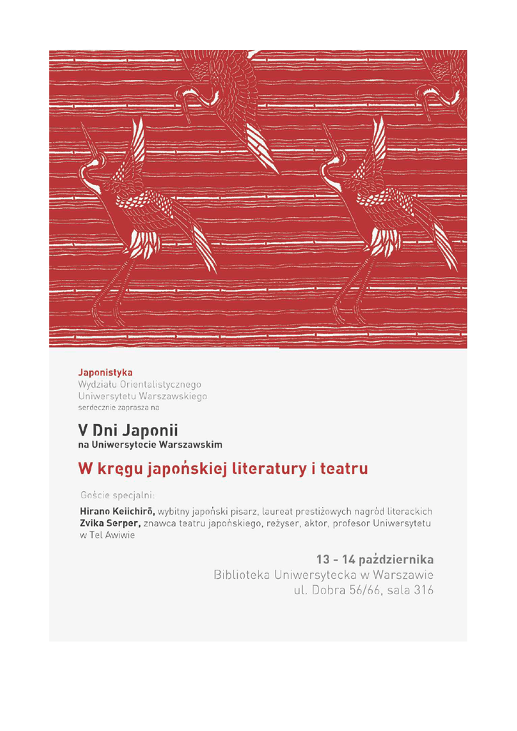 13 X, czwartek: W kręgu teatru 10.00-10.30 Uroczyste otwarcie 10.30-13.00 Gość specjalny: Zvika Serper, wybitny znawca teatru japońskiego, reżyser, aktor, profesor Uniwersytetu w Tel Awiwie 10.30-11.30 Zvika Serper, Crossing Boundaries: e Use of Japanese Traditional eatre Aesthetics and Techniques in Contemporary Acting and Directing - wykład w języku angielskim 11.30-11.45 Przerwa 11.45-12.45 Zvika Serper (dalsza część wykładu) 12.45-13.00 Dyskusja 13.00-14.00 Wernisaż wystawy Ciche trwanie, Stowarzyszenie „Ścieżka” 14.00-15.00 Przerwa obiadowa 15.00-18.30 Teatr japoński i zachodni. Przenikanie tradycji 15.00-15.20 Estera Żeromska, O przenikaniu tradycji, czyli od japońskości do japońskości 15.20-15.40 Katarzyna Osińska, Inspiracje japońskie w teatrze rosyjskim na przełomie XIX i XX w. 15.40-16.00 Jakub Karpoluk, Teatr nō w środku Europy 16.00-16.20 Dyskusja 16.20-16.40 Przerwa 16.40-17.00 Aleksandra Capiga,Tańcząc w głąb siebie - od tańca butō do terapii tańcem i ruchem 17.00-17.20 Yoko Fujii-Karpoluk, Okinawa Zangetsuki by Tessenkai. How Noh Deals with the II World War`s Trauma 17.20-17.40 Urszula Mach, Teatr nō i cha no yu 17.40-18.00 O. Hieronim Kreiss, Założenia ikebany tynieckiej 18.00-18.30 Dyskusja 14 X, piątek: W kręgu literatury 10.00 - 11.00 Hirano Keiichirō i współczesna literatura japońska 10.00-10.30 Mikołaj Melanowicz, Hirano Keiichirō i jego twórczość 10.30-11.00 Beata Kubiak Ho-Chi, Panorama najnowszej literatury japońskiej 11.00 - 11.15 Przerwa 11.15 - 13.15 Gość specjalny: Hirano Keiichirō, wybitny japoński pisarz, laureat prestiżowych nagród literackich 11.15 – 13.00 Hirano Keiichirō, Sangatsu jūichinichi igo no Nihon bungaku (Literatura japońska po 11 marca) – wykład w języku japońskim, sponsorowany przez firmę Mitsui & Co., Ltd. 13.15 - 14.00 Przerwa obiadowa 14.00 - 16.00 Literatura japońska i jej tłumaczenia 14.00-14.20 Agnieszka Kozyra, Kryzys tradycyjnego modelu rodziny w „Kōkotsu no hito” (Demencja) Ariyoshi Sawako 14.20-14.40 Iwona Kordzińska-Nawrocka, Wzorzec żony i kochanki w powieści „Onnazaka”, czyli „Droga kobiety”, Enchi Fumiko 14.40-15.00 Aleksandra Szczechla, Ideologia w kuchni – znaczenie scen posiłków w "Aru onna" Arishimy Takeo 15.00-15.20 Barbara Słomka, Kilka słów o problemie „nieobecności” w literaturze japońskiej na przykładzie twórczości Tsushimy Yūko i Kawakami Hiromi 15.20-15.35 Dyskusja 15.35-15.45 Przerwa 15.45-16.05 Agnieszka Żuławska-Umeda, Ustny charakter literatury japońskiej 16.05-16.20 Anna Zalewska, O kobiecie, która zamieniła się w diabła - interpretacje motywu Hashihime w literaturze japońskiej 16.25-16.45 Anastasiia Kharchenko, Japońskie legendy miejskie 16.45-17.00 Dyskusja 17.00 - 17.30 Spektakl: Taniec buyō w wykonaniu Hany Umedy Zapraszamy również na: - Wystawę Stowarzyszenia „Ścieżka”, (III piętro Biblioteka Uniwersytecka w Warszawie, foyer wystawowe za Biblioteką Austriacką) - Zwiedzanie pawilonu herbacianego „Kaian”, w godz. 13.30-16.00 (wejścia co 30 minut), Urszula Mach-Bryson i Warszawskie Stowarzyszenie Urasenke Patronat honorowy Ambasada Japonii w Polsce