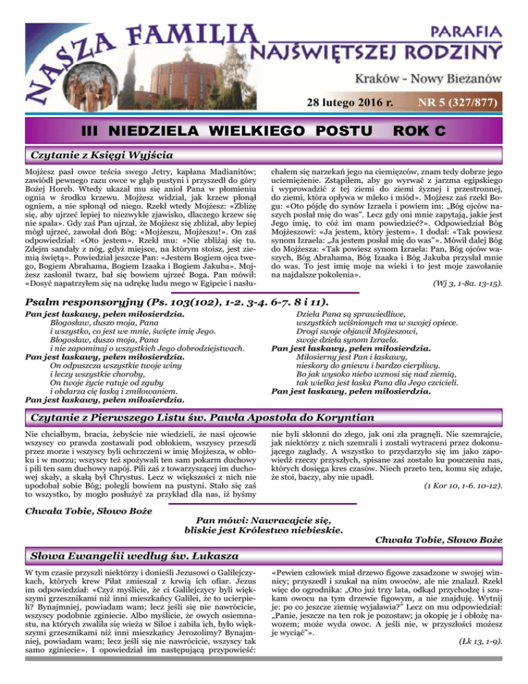 28 lutego 2016 r. III NIEDZIELA WIELKIEGO POSTU NR 5 (327/877) ROK C Czytanie z Księgi Wyjścia Mojżesz pasł owce teścia swego Jetry, kapłana Madianitów; zawiódł pewnego razu owce w głąb pustyni i przyszedł do góry Bożej Horeb. Wtedy ukazał mu się anioł Pana w płomieniu ognia w środku krzewu. Mojżesz widział, jak krzew płonął ogniem, a nie spłonął od niego. Rzekł wtedy Mojżesz: «Zbliżę się, aby ujrzeć lepiej to niezwykłe zjawisko, dlaczego krzew się nie spala». Gdy zaś Pan ujrzał, że Mojżesz się zbliżał, aby lepiej mógł ujrzeć, zawołał doń Bóg: «Mojżeszu, Mojżeszu!». On zaś odpowiedział: «Oto jestem». Rzekł mu: «Nie zbliżaj się tu. Zdejm sandały z nóg, gdyż miejsce, na którym stoisz, jest ziemią świętą». Powiedział jeszcze Pan: «Jestem Bogiem ojca twego, Bogiem Abrahama, Bogiem Izaaka i Bogiem Jakuba». Mojżesz zasłonił twarz, bał się bowiem ujrzeć Boga. Pan mówił: «Dosyć napatrzyłem się na udrękę ludu mego w Egipcie i nasłu- chałem się narzekań jego na ciemięzców, znam tedy dobrze jego uciemiężenie. Zstąpiłem, aby go wyrwać z jarzma egipskiego i wyprowadzić z tej ziemi do ziemi żyznej i przestronnej, do ziemi, która opływa w mleko i miód». Mojżesz zaś rzekł Bogu: «Oto pójdę do synów Izraela i powiem im: „Bóg ojców naszych posłał mię do was”. Lecz gdy oni mnie zapytają, jakie jest Jego imię, to cóż im mam powiedzieć?». Odpowiedział Bóg Mojżeszowi: «Ja jestem, który jestem». I dodał: «Tak powiesz synom Izraela: „Ja jestem posłał mię do was”». Mówił dalej Bóg do Mojżesza: «Tak powiesz synom Izraela: Pan, Bóg ojców waszych, Bóg Abrahama, Bóg Izaaka i Bóg Jakuba przysłał mnie do was. To jest imię moje na wieki i to jest moje zawołanie na najdalsze pokolenia». (Wj 3, 1-8a. 13-15). Psalm responsoryjny (Ps. 103(102), 1-2. 3-4. 6-7. 8 i 11). Pan jest łaskawy, pełen miłosierdzia. Błogosław, duszo moja, Pana i wszystko, co jest we mnie, święte imię Jego. Błogosław, duszo moja, Pana i nie zapominaj o wszystkich Jego dobrodziejstwach. Pan jest łaskawy, pełen miłosierdzia. On odpuszcza wszystkie twoje winy i leczy wszystkie choroby, On twoje życie ratuje od zguby i obdarza cię łaską i zmiłowaniem. Pan jest łaskawy, pełen miłosierdzia. Dzieła Pana są sprawiedliwe, wszystkich uciśnionych ma w swojej opiece. Drogi swoje objawił Mojżeszowi, swoje dzieła synom Izraela. Pan jest łaskawy, pełen miłosierdzia. Miłosierny jest Pan i łaskawy, nieskory do gniewu i bardzo cierpliwy. Bo jak wysoko niebo wznosi się nad ziemią, tak wielka jest łaska Pana dla Jego czcicieli. Pan jest łaskawy, pełen miłosierdzia. Czytanie z Pierwszego Listu św. Pawła Apostoła do Koryntian Nie chciałbym, bracia, żebyście nie wiedzieli, że nasi ojcowie wszyscy co prawda zostawali pod obłokiem, wszyscy przeszli przez morze i wszyscy byli ochrzczeni w imię Mojżesza, w obłoku i w morzu; wszyscy też spożywali ten sam pokarm duchowy i pili ten sam duchowy napój. Pili zaś z towarzyszącej im duchowej skały, a skałą był Chrystus. Lecz w większości z nich nie upodobał sobie Bóg; polegli bowiem na pustyni. Stało się zaś to wszystko, by mogło posłużyć za przykład dla nas, iż byśmy nie byli skłonni do złego, jak oni zła pragnęli. Nie szemrajcie, jak niektórzy z nich szemrali i zostali wytraceni przez dokonującego zagłady. A wszystko to przydarzyło się im jako zapowiedź rzeczy przyszłych, spisane zaś zostało ku pouczeniu nas, których dosięga kres czasów. Niech przeto ten, komu się zdaje, że stoi, baczy, aby nie upadł. (1 Kor 10, 1-6. 10-12). Chwała Tobie, Słowo Boże Pan mówi: Nawracajcie się, bliskie jest Królestwo niebieskie. Chwała Tobie, Słowo Boże Słowa Ewangelii według św. Łukasza W tym czasie przyszli niektórzy i donieśli Jezusowi o Galilejczykach, których krew Piłat zmieszał z krwią ich ofiar. Jezus im odpowiedział: «Czyż myślicie, że ci Galilejczycy byli większymi grzesznikami niż inni mieszkańcy Galilei, że to ucierpieli? Bynajmniej, powiadam wam; lecz jeśli się nie nawrócicie, wszyscy podobnie zginiecie. Albo myślicie, że owych osiemnastu, na których zwaliła się wieża w Siloe i zabiła ich, było większymi grzesznikami niż inni mieszkańcy Jerozolimy? Bynajmniej, powiadam wam; lecz jeśli się nie nawrócicie, wszyscy tak samo zginiecie». I opowiedział im następującą przypowieść: «Pewien człowiek miał drzewo figowe zasadzone w swojej winnicy; przyszedł i szukał na nim owoców, ale nie znalazł. Rzekł więc do ogrodnika: „Oto już trzy lata, odkąd przychodzę i szukam owocu na tym drzewie figowym, a nie znajduję. Wytnij je: po co jeszcze ziemię wyjaławia?” Lecz on mu odpowiedział: „Panie, jeszcze na ten rok je pozostaw; ja okopię je i obłożę nawozem; może wyda owoc. A jeśli nie, w przyszłości możesz je wyciąć”». (Łk 13, 1-9). 2 NASZA FAMILIA, 28 lutego 2016 r., Nr 5 20. URODZINY „KLU W sobotę 6 lutego, 20. urodziny świętował „Klub Aktywności” przy ul. Aleksandry 1 – najstarszy Środowiskowy Dom Samopomocy prowadzony przez Chrześcijańskie Stowarzyszenie Osób Niepełnosprawnych, Ich Rodzin i Przyjaciół „Ognisko”. Mieszczący się przy Sanktuarium Najświętszej Rodziny ośrodek już trwale wpisał się w życie Nowego Bieżanowa i okolic. „Klub Aktywności”, początkowo dla 10 osób z niepełnosprawnością sprzężoną, absolwentów szkoły specjalnej przy al. Dygasińskiego, powstał w tym miejscu w wyniku starań p. Marii Orkisz, a dzięki uprzejmości księdza Józefa Jakubca, który dla niepełnosprawnych młodych ludzi szeroko otworzył drzwi Domu Parafialnego w 1996 roku. Lokalizacja na terenie kościoła przy ul. Aleksandry miała być tymczasowa, ale jak życie pokazało, chwila ta trwa już dwie dekady. Mijał czas i powiększało się grono uczestników przychodzących codziennie do oś