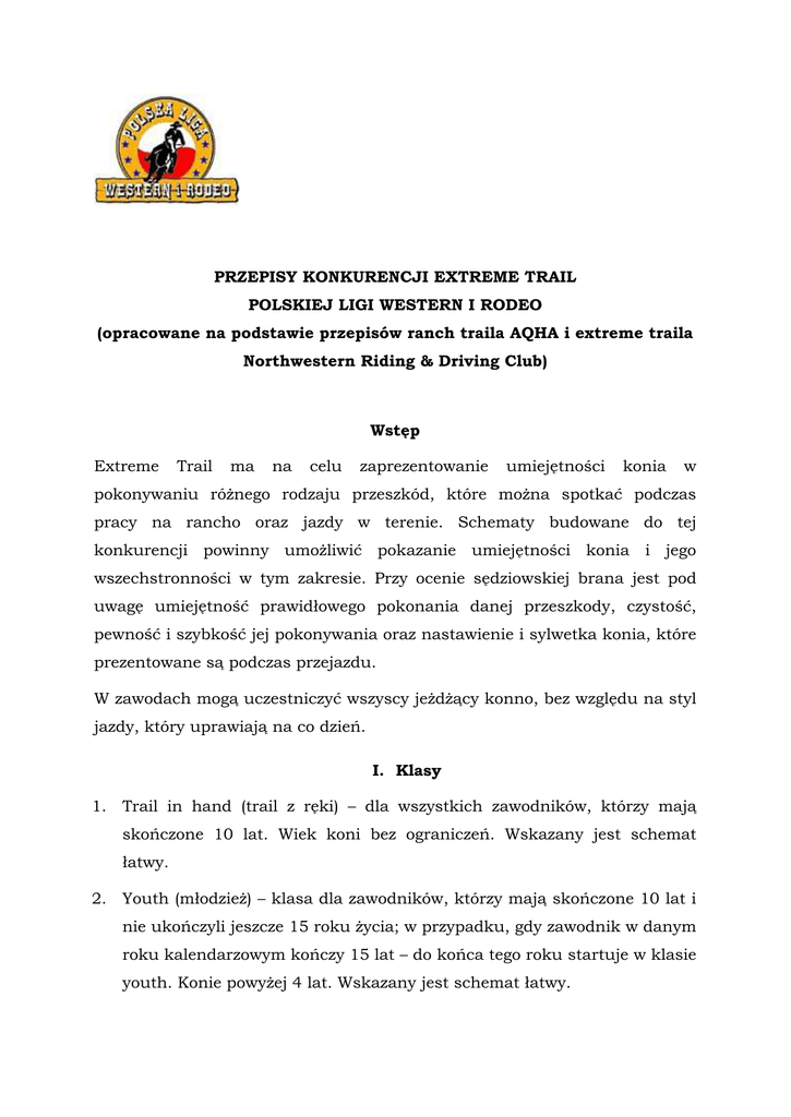 PRZEPISY KONKURENCJI EXTREME TRAIL POLSKIEJ LIGI WESTERN I RODEO (opracowane na podstawie przepisów ranch traila AQHA i extreme traila Northwestern Riding & Driving Club) Wstęp Extreme Trail ma na celu zaprezentowanie umiejętności konia w pokonywaniu różnego rodzaju przeszkód, które można spotkać podczas pracy na rancho oraz jazdy w terenie. Schematy budowane do tej konkurencji powinny umożliwić pokazanie umiejętności konia i jego wszechstronności w tym zakresie. Przy ocenie sędziowskiej brana jest pod uwagę umiejętność prawidłowego pokonania danej przeszkody, czystość, pewność i szybkość jej pokonywania oraz nastawienie i sylwetka konia, które prezentowane są podczas przejazdu. W zawodach mogą uczestniczyć wszyscy jeżdżący konno, bez względu na styl jazdy, który uprawiają na co dzień. I. Klasy 1. Trail in hand (trail z ręki) – dla wszystkich zawodników, którzy mają skończone 10 lat. Wiek koni bez ograniczeń. Wskazany jest schemat łatwy. 2. Youth (młodzież) – klasa dla zawodników, którzy mają skończone 10 lat i nie ukończyli jeszcze 15 roku życia; w przypadku, gdy zawodnik w danym roku kalendarzowym kończy 15 lat – do końca tego roku startuje w klasie youth. Konie powyżej 4 lat. Wskazany jest schemat łatwy. 3. Amateur (amator) – klasa dla zawodników, którzy mają skończone 15 lat (nie spełniających już założeń klasy youth), nie zajmujących się zawodowo jazdą konną, treningiem, itp. i nie czerpiącym z tego tytułu korzyści finansowych. Konie powyżej 4 lat. Wskazany jest schemat łatwy i średni. 4. Open – klasa otwarta dla wszystkich zawodników. Konie powyżej 4 lat. Wskazany jest schemat średni i trudny. II. Przepisy ogólne 1. Przed rozpoczęciem zawodów powinno odbyć się spotkanie dla zawodników, podczas którego mogą oni zadawać pytania dotyczące schematu i przepisów konkurencji extreme trail. Na spotkaniu takim obecni są sędziowie oraz osoba/osoby odpowiedzialne za schemat. Obowiązkiem zawodników jest wyjaśnienie wszystkich problemowych kwestii na tym spotkaniu, nie mogą natomiast tego robić w trakcie trwania zawodów. 2. Przed rozpoczęciem każdego konkursu w zawodach, zawodnicy biorący w nim udział muszą mieć możliwość obejścia toru, na którym ułożony jest schemat (podczas obchodzenia toru mogą oni zadawać pytania dotyczące schematu sędziom oraz osobie/osobom odpowiedzialnym za tor). 3. Sędziowie i/lub powołana komisja mogą zdyskwalifikować zawodnika za jakikolwiek przejaw zachowania w stosunku do konia, który uznany zostanie za niewłaściwy, w tym np. za: a. nadmierne używanie ostróg, b. nadmierne używanie wodzy, c. nadmierne używanie bata, d. nieprzestrzeganie zasad zawartych w niniejszych przepisach. 4. Jeżeli koń nabawi się kontuzji podczas trwania konkursu, zawodnik ma obowiązek przerwania przejazdu i wycofania się na tym koniu z zawodów. Jeżeli zawodnik nie zauważy takiej kontuzji konia przejazd przerywa sędzia. 5. Podczas pokonywania toru koń może być prowadzony jedną ręką lub oburącz niezależnie od używanego kiełzna – w czasie przejazdu możliwa jest zmiana ręki (rąk) prowadzącej. 6. Podczas pokonywania schematu jeździec może anglezować, stać w strzemionach lub trzymać się hornu, tak jak to może mieć miejsce podczas jazdy w terenie. 7. Publiczność jest uznawana za “element trasy” i zawodnicy startujący w zawodach akceptują fakt, że może ona rozpraszać ich konia podczas pokonywania trasy. Jednocześnie organizator/osoba odpowiedzialna za tor ma obowiązek zapewnienia bezpiecznego miejsca, w którym ma przebywać publiczność podczas trwania zawodów. III. 1. Ubiór jeźdźca Zawodników obowiązuje strój odświętny, schludny i jednorodny westernowy lub angielski. 2. Jeźdźcy prezentujący styl angielski obowiązkowo startują w kaskach ochronnych. 3. Jeźdźcy prezentujący styl westernowy obowiązkowo startują w kapeluszach lub kaskach ochronnych. 4. Wszyscy zawodnicy niepełnoletni (niezależnie od stylu jazdy, który reprezentują) zobowiązani są do startowania w kaskach i kamizelkach ochronnych. 5. Wszystkich zawodników startujących w extreme trailu zachęca się do używania kasków ochronnych oraz kamizelek ochronnych. 6. Obowiązkowe dla wszystkich zawodników jest obuwie przystosowane do jazdy konnej, zakrywające kostkę. 7. W klasie trail in hand (trail z ręki) obowiązkowe są rękawiczki. IV. 1. Rząd koński Dopuszczalny jest rząd klasyczny lub westernowy. 2. Zawodnicy zobowiązani są do użytkowania sprzętu (ogłowie, siodło, wodze) uznanego za bezpieczny i humanitarny dla konia. Sędzia ma prawo nie dopuścić do startu zawodnika, jeżeli sprzęt, którego używa zostanie uznany przez niego za niebezpieczny lub niehumanitarny dla konia. 3. Wszelkie wypinacze oraz pomoce sztuczne ograniczające ruchy głowy konia (oprócz wodzy, romala, mecate itp.) są niedozwolone. 4. Dozwolone i wskazane są wszelkiego typu ochraniacze na nogi dla koni. V. Przepisy dotyczące toru 1. Organizator musi dostosować poziom trudności schematu do klasy konkursów (tor zatwierdza sędzia zawodów). 2. Jeżeli to jest możliwe, do budowy schematu powinny zostać wykorzystane przeszkody naturalne lub realistycznie imitujące naturalne. 3. Schemat powinien być budowany z wykorzystaniem naturalnego ukształtowania terenu, może być jednak w łatwiejszych wariantach budowany także wewnątrz areny. 4. Schemat powinien składać się z 8 do 14 przeszkód. 5. Przykładowe przeszkody: a. most wiszący, b. pomost, c. pnie, d. skały, e. stopnie, f. przeszkoda wodna, g. tunel, h. bramka (nie musi być to bramka linowa), i. wleczenie na linie drąga, pnia, gałęzi, belki – lina może być trzymana w ręku lub przywiązana do hornu (zgodnie z zapisem w schemacie) i powinna być solidnie umocowana na wleczonym przedmiocie, j. zarzucanie lassa na stojącą przeszkodę – lasso może być przewożone w ręku l