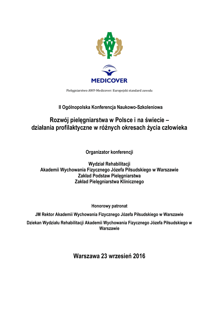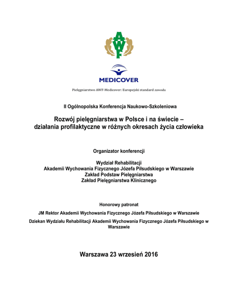 Pielęgniarstwo AWF-Medicover: Europejski standard zawodu II Ogólnopolska Konferencja Naukowo-Szkoleniowa Rozwój pielęgniarstwa w Polsce i na świecie – działania profilaktyczne w różnych okresach życia człowieka Organizator konferencji Wydział Rehabilitacji Akademii Wychowania Fizycznego Józefa Piłsudskiego w Warszawie Zakład Podstaw Pielęgniarstwa Zakład Pielęgniarstwa Klinicznego Honorowy patronat JM Rektor Akademii Wychowania Fizycznego Józefa Piłsudskiego w Warszawie Dziekan Wydziału Rehabilitacji Akademii Wychowania Fizycznego Józefa Piłsudskiego w Warszawie Warszawa 23 wrzesień 2016 Proponowane sesje: 1. Profilaktyka i edukacja w pediatrii 2. Znaczenie edukacji zdrowotnej w życiu dorosłym 3. Prewencja chorób przewlekłych 4. Działania profilaktyczne w okresie starości Czas trwania konferencji: 09.00- 17.00 miejsce Akademia Wychowania Fizycznego Józefa Piłsudskiego w Warszawie, ul. Marymoncka 34, Wydział Rehabilitacji. Prace, które zostaną zatwierdzone do prezentacji (doniesienia 10 minutowe) po pozytywnej recenzji mogą się ukazać w monografii. Termin nadsyłania zgłoszeń uczestnictwa w konferencji: - udział czynny – 15 lipiec 2016 (informacja o przyjęciu referatu do 30 lipca 2016) - udział bierny – 10 wrzesień 2016 Przesłanie całego artykułu do publikacji po przyjęciu streszczenia należy wysłać do 31 października 2016r. Koszt uczestnictwa w konferencji - uczestnik czynny - 60,00 zł - uczestnik bierny - 40,00 zł - uczestnik czynny z publikacją w monografii – 120,00 zł - student z uczestnictwem czynnym – bezpłatnie - student z uczestnictwem biernym - 20,00 zł - student kierunku pielęgniarstwo AWF – udział bezpłatny - możliwa publikacja w monografii bez udziału w konferencji – 100,00 zł W opłacie konferencyjnej zawarte jest: udział w obradach, przerwa kawowa, obiad, certyfikat uczestnictwa, książeczka streszczeń Opłaty należy dokonać na konto: 36 1090 1014 0000 0001 3091 6693 z dopiskiem Konferencja pielęgniarska 2016 Osoby, które będą miały potwierdzony udział czynny - opłata do 15 sierpnia 2016 roku, osoby z udziałem biernym do 15 września 2016 roku. Zgłoszenia uczestnictwa czynnego i biernego oraz streszczenia prac i całe prace prosimy wysyłać na adres mailowy: [email protected] z dopiskiem Konferencja pielęgniarska 2016 KARTA CZYNNEGO UCZESTNICTWA W II Ogólnopolskiej Konferencji Naukowo-Szkoleniowej Rozwój pielęgniarstwa w Polsce i na świecie – działania profilaktyczne w różnych okresach życia człowieka Zgłoszenie udziału czynnego i dokonanie opłaty (60,00 zł lub z monografią 120,00 zł) – do 15.08.2016 r. Imię i nazwisko: ………………………………………………………………………………... Tytuł/stopień naukowy/zawodowy: ……………………………………………………………. miejsce pracy: ………………………………………………………………………………...... stanowisko: ……………………………………………………………………………….......... adres do korespondencji : ulica, nr domu, mieszkania: …………………………………………………………………… kod pocztowy, miejscowość: ………………………………………………………………….. nr telefonu / nr tel. kom.: ……………………………………………………………………… e-mail: ………………………………………………………………………………................ Dane do faktury : nazwa zakładu pracy / instytucji: ……………………………………………………………… ………………………………………………………………………………............................. adres: ………………………………………………………………………………................... NIP: ………………………………………………………………………………..................... KARTA ZGŁOSZENA PREZENTACJI PRACY Imię i nazwisko: ……………………………………………………………………………….. Tytuł/stopień naukowy/zawodowy: ……………………………………………………………. miejsce pracy: ………………………………………………………………………………...... ……………………………………………………………………………….............................. stanowisko: ………………………………………………………………………………........... tytuł pracy: ………………………………………………………………………………........... ……………………………………………………………………………….............................. autor / autorzy: ………………………………………………………………………………..... ……………………………………………………………………………….............................. Afiliacja autorów pracy: ……………………………………………………………………….. ……………………………………………………………………………….............................. Prosimy o nadesłanie streszczeń w języku polskim w terminie do 15.07.2016 r. Streszczenie (maksimum 250 słów, czcionka Times New Roman, wielkość 12) prosimy przesyłać pocztą elektroniczną w formacie Word 97-2003 na adres mailowy: [email protected] Streszczenie pracy wg następującego układu : Imiona i nazwiska (w pełnym brzmieniu) autora / autorów pracy Miejsce pracy autora / autorów Tytuł pracy Wstęp Cel pracy Materiał i metody Wyniki Wnioski Słowa kluczowe (3-5 słów) O zakwalifikowaniu pracy do prezentacji, po decyzji Komitetu Naukowego Konferencji, poinformujemy Państwa w terminie do 30.07.2016. Proponujem