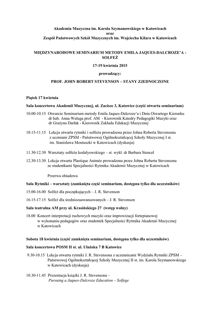 Akademia Muzyczna im. Karola Szymanowskiego w Katowicach oraz Zespół Państwowych Szkół Muzycznych im. Wojciecha Kilara w Katowicach MIĘDZYNARODOWE SEMINARIUM METODY EMILA JAQUES-DALCROZE’A SOLFEŻ 17-19 kwietnia 2015 prowadzący: PROF. JOHN ROBERT STEVENSON – STANY ZJEDNOCZONE Piątek 17 kwietnia Sala koncertowa Akademii Muzycznej, ul. Zacisze 3, Katowice (część otwarta seminarium) 10.00-10.15 Otwarcie Seminarium metody Emila Jaques-Dalcroze’a i Dnia Otwartego Kierunku dr hab. Anna Waluga prof. AM - Kierownik Katedry Pedagogiki Muzyki oraz dr Grażyna Darłak - Kierownik Zakładu Edukacji Muzycznej 10.15-11.15 Lekcja otwarta rytmiki i solfeżu prowadzona przez Johna Roberta Stevensona z uczniami ZPSM - Państwowej Ogólnokształcącej Szkoły Muzycznej I st. im. Stanisława Moniuszki w Katowicach (dyskusja) 11.30-12.30 Warsztaty solfeżu kodalyowskiego – st. wykł. dr Barbara Stencel 12.30-13.30 Lekcja otwarta Plastique Animée prowadzona przez Johna Roberta Stevensona ze studentkami Specjalności Rytmika Akademii Muzycznej w Katowicach Przerwa obiadowa Sala Rytmiki – warsztaty (zamknięta część seminarium, dostępna tylko dla uczestników) 15.00-16.00 Solfeż dla początkujących – J. R. Stevenson 16.15-17.15 Solfeż dla średniozaawansowanych – J. R. Stevenson Sala teatralna AM przy ul. Krasińskiego 27 (wstęp wolny) 18.00 Koncert interpretacji ruchowych muzyki oraz improwizacji fortepianowej w wykonaniu pedagogów oraz studentek Specjalności Rytmika Akademii Muzycznej w Katowicach Sobota 18 kwietnia (część zamknięta seminarium, dostępna tylko dla uczestników) Sala koncertowa POSM II st. ul. Ułańska 7 B Katowice 9.30-10.15 Lekcja otwarta rytmiki J. R. Stevensona z uczennicami Wydziału Rytmiki ZPSM – Państwowej Ogólnokształcącej Szkoły Muzycznej II st. im. Karola Szymanowskiego w Katowicach (dyskusja) 10.30-11.45 Prezentacja książki J. R. Stevensona – Pursuing a Jaques-Dalcroze Education – Solfege Przerwa na kawę i herbatę 12.15-13.15 Lekcja pokazowa rytmiki i improwizacji fortepianowej z uczennicami Wydziału Rytmiki ZPSM – Państwowej Ogólnokształcącej Szkoły Muzycznej II st. im. Karola Szymanowskiego w Katowicach - dr Anna Lipiec (dyskusja) Obiad Sala koncertowa POSM II st. - warsztaty 14.45-15.45 Rytmika i solfeż dla początkujących – J. R. Stevenson 16.00-17.00 Rytmika i solfeż dla średniozaawansowanych – J. R. Stevenson 17.15-17.45 Koncert interpretacji ruchowych muzyki oraz improwizacji fortepianowej w wykonaniu uczennic Wydziału Rytmiki POSM II st. (wstęp wolny) Niedziela 19 kwietnia (zamknięta część seminarium, dostępna tylko dla uczestników) Sala koncertowa POSM II st. ul. Ułańska 7 B Katowice - warsztaty 9.15-10.15 Solfeż dla początkujących – J. R. Stevenson 10.30-11.30 Solfeż dla średniozaawansowanych – J. R. Stevenson Przerwa na kawę i herbatę 12.00-13.00 Lekcja pokazowa rytmiki ze studentkami Specjalności Rytmika dr hab. Anetta Pasternak prof. AM Obiad 14.30-15.45 Rytmika i solfeż dla początkujących – J. R. Stevenson 16.00-17.00 Rytmika i solfeż dla średniozaawansowanych – J. R. Stevenson 17.00 Zakończenie Seminarium