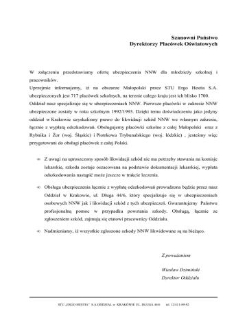 Szanowni Państwo Dyrektorzy Placówek Oświatowych W załączeniu przedstawiamy ofertę ubezpieczenia NNW dla młodzieży szkolnej i pracowników. Uprzejmie informujemy, iż na obszarze Małopolski przez STU Ergo Hestia S.A. ubezpieczonych jest 717 placówek szkolnych, na terenie całego kraju jest ich blisko 1700. Oddział nasz specjalizuje się w ubezpieczeniach NNW. Pierwsze placówki w zakresie NNW ubezpieczone zostały w roku szkolnym 1992/1993. Dzięki temu doświadczeniu jako jedyny oddział w Krakowie uzyskalismy prawo do likwidacji szkód NNW we własnym zakresie, łącznie z wypłatą odszkodowań. Obsługujemy placówki szkolne z całej Małopolski oraz z Rybnika i Żor (woj. Śląskie) i Piotrkowa Trybunalskiego (woj. łódzkie) , jesteśmy więc przygotowani do obsługi placówek z całej Polski. • Z uwagi na uproszczony sposób likwidacji szkód nie ma potrzeby stawania na komisje lekarskie, szkoda zostaje oszacowana na podstawie dokumentacji lekarskiej, wypłata odszkodowania nastąpić może jeszcze w trakcie leczenia. • Obsługa ubezpieczenia łącznie z wypłatą odszkodowań prowadzona będzie przez nasz Oddział w Krakowie, ul. Długa 44/6, który specjalizuje się w ubezpieczeniach osobowych NNW jak i likwidacji szkód z tych ubezpieczeń. Gwarantujemy Państwu profesjonalną pomoc w przypadku powstania szkody. Obsługą, łącznie ze zgłoszeniem szkód, zajmują się etatowi pracownicy Oddziału. • Nadmieniamy, iż wszystkie zgłoszone szkody NNW likwidowane są na bieżąco. Z poważaniem Wiesław Dzimiński Dyrektor Oddziału STU „ERGO HESTIA” S.A.ODDZIAŁ w KRAKÓWIE UL. DŁUGA 44/6 tel. 12/411-89-92 SKŁADKA Suma Ubezpieczenia (zł) 37,00 14.000,00 Wypłata w razie 100% trwałego uszczerbku na zdrowiu 14.000,00 Wypłata w razie śmierci wskutek NNW oraz sepsy 14.000,00 Wypłata w razie śmierci wskutek NNW na terenie szkoły Wypłata za 1% trwałego uszczerbku na zdrowiu 28.000,00 140,00 Zwrot kosztów leczenia powypadkowego do 30% s.u. - zakup leków i środków opatrunkowych Zwrot kosztów przeszkolenia zawodowego inwalidów do 30% sumy ubezpieczenia Zwrot kosztów zakupu protez itp. do 30% sumy ubezpieczenia 4.200,00 4.200,00 4.200,00 Ryczałt za wizytę u lekarza – świadczenie wypłacane, gdy trwały uszczerbek na zdrowiu wynosi 0 %, jednakże leczenie trwało przynajmniej 14 dni Ryczałt 3 % za pobyt w szpitalu – świadczenie wypłacane, gdy trwały uszczerbek na zdrowiu wynosi 0%, jednakże leczenie szpitalne NNW trwa min. 7 dni Pogryzienie przez zwierzęta (w tym psy) w zależności od następstw do 100 % sumy ubezpieczenia Poparzenia lub odmrożenia w zależności od następstw do 100 % sumy ubezpieczenia Zranienia w zależności od następstw do 100 % sumy ubezpieczenia Wstrząśnienie mózgu, urazy głowy w zależności od następstw do 100 % sumy ubezpieczenia Złamania w zależności od następstw do 100 % sumy ubezpieczenia Uszkodzenia narządu wzroku w zależności od następstw do 100 % sumy ubezpieczenia Uszkodzenia narządu słuchu w zależności od następstw do 100 % sumy ubezpieczenia Utrata całkowita lub częściowa zębów stałych w zależności od następstw do 100 % sumy ubezpieczenia Odbudowa pourazowa zębów stałych wg rachunków Urazy skrętne, zwichnięcia, stłuczenia w zależności od następstw do 100 % sumy ubezpieczenia Następstwa powstałe w wyniku zawału mięśnia sercowego lub udaru mózgu do 100 % sumy ubezpieczenia Następstwa NNW powstałe w wyniku padaczki o nieustalonej przyczynie do 100 % sumy ubezpieczenia Świadczenie z tytułu poważnego zachorowania (nowotwór złośliwy, przeszczep 140,00 420,00 Do 14.000,00 Do 14.000,00 Do 14.000,00 Do 14.000,00 Do 14.000,00 Do 14.000,00 Do 14.000,00 Do 14.000,00 200 zł/ząb Do 14.000,00 Do 14.000,00 Do 14.000,00 narządu, paraliż, utrata kończyn, zakażenie wirusem HIV w wyniku transfuzji krwi, zapalenie mózgu) 1.000,00 Śmierć rodzica lub prawnego opiekuna wskutek NNW 1.000,00 Assistance Powypadkowe – dodatkowa pomoc po wypadku S.U. 2000,00 Liczba uczniów ubezpieczonych bezskładkowo Do 10 % Dzienne świadczenie szpitalne związane z NNW od 3 do 180 dnia pobytu STU „ERGO HESTIA” S.A.ODDZIAŁ w KRAKÓWIE UL. DŁUGA 44/6 tel. 12/411-89-92 30,00 zł / dzień Zalety naszej oferty: - ubezpieczenie NNW całodobowe, zarówno w kraju jak i za granicą , obejmujące również okres wakacji i ferii, wycieczki, praktyki szkolne, zielone szkoły itp., - suma ubezpieczenia, optymalna w stosunku do składki, gwarantuje maksymalne zadośćuczynienie w przypadku powstania szkody, - do 30 % sumy ubezpieczenia zwrot udokumentowanych podstawowych kosztów leczenia, - do 30 % sumy ubezpieczenia zwrot udokumentowanych kosztów nabycia środków pomocniczych, protez i innych przedmiotów ortopedycznych oraz koszty obudowy stomatologicznej zębów, - do 30 % zwrot udokumentowanych kosztów przeszkolenia zawodowego inwalidów, - ryczałt za wizytę u lekarza – świadczenie wypłacane, gdy trwały uszczerbek na zdrowiu wynosi 0 %, a leczenie trwało minimum 14 dni – w wysokości 1 % sumy ubezpieczenia, - ryczałt za pobyt w szpitalu – świadczenie wypłacane, gdy trwały uszczerbek na zdrowiu wynosi 0 %, jednakże leczenie szpitalne NNW trwa min. 7 dni - 3 % sumy ubezpieczenia, - ryczałtowe świadczenie w stałej wysokości 1.000,00 złotych za poważne zachorowania: nowotwór złośliwy, przeszczep narządu, paraliż, utrata kończyn, zakażenie wirusem HIV w wyniku transfuzji krwi, zapalenie mózgu - wypłata za następstwa częściowe oraz śmierć na skutek zawału i wylewu krwi do mózgu - wypłata za śmierć na skutek sepsy, - świadczenie za śmierć rodzica lub prawnego opiekuna na skutek nieszczęśliwego wypadku w stałej wysokości 1.000,00 złotych - dzienne świadczenie szpitalne (związane z NNW) - płatne od 3 dnia pobytu, max. 180 dni - dodatkowe ubezpieczenie Assistance Powypadkowe bez dodatkowej opłaty składki. - ubezpieczenie bezpłatne NNW 