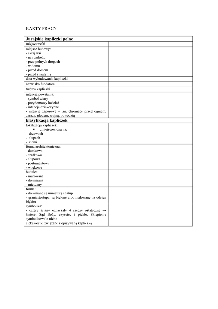 KARTY PRACY Jurajskie kapliczki polne klasyfikacja kapliczek