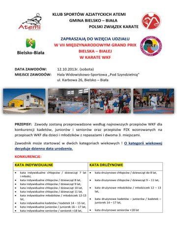 KLUB SPORTÓW AZJATYCKICH ATEMI GMINA BIELSKO – BIAŁA POLSKI ZWIĄZEK KARATE ZAPRASZAJĄ DO WZIĘCIA UDZIAŁU W VII MIĘDZYNARODOWYM GRAND PRIX BIELSKA – BIAŁEJ W KARATE WKF DATA ZAWODÓW: MIEJSCE ZAWODÓW: 12.10.2013r. (sobota) Hala Widowiskowo-Sportowa „Pod Szyndzielnią” ul. Karbowa 26, Bielsko – Biała PRZEPISY: Zawody zostaną przeprowadzone według najnowszych przepisów WKF dla konkurencji kadetów, juniorów i seniorów oraz przepisów PZK wzorowanych na przepisach WKF dla dzieci i młodzików z repasażami i dwoma 3. miejscami. Zawodnik może startować w dwóch kategoriach wiekowych ! O kategorii wiekowej decyduje dzienna data urodzenia. KONKURENCJE: KATA INDYWIDUALNE KATA DRUŻYNOWE kata drużynowe chłopców / dziewcząt do 8 lat, kata drużynowe chłopców / dziewcząt 9 – 11 lat, kata drużynowe młodzików / młodziczek 12 – 13 lat, kata drużynowe kadetów – juniorów / kadetek – juniorek 14 – 17 lat, kata drużynowe seniorów +18 lat kata indywidualne chłopców / dziewcząt 7 lat i młodsi, kata indywidualne chłopców / dziewcząt 8 lat, kata indywidualne chłopców / dziewcząt 9 lat, kata indywidualne chłopców / dziewcząt 10 lat, kata indywidualne chłopców / dziewcząt 11 lat, kata indywidualne młodzików / młodziczek 12-13 lat, kata indywidualne kadetów / kadetek 14 – 15 lat, kata indywidualne juniorów / juniorek 16 – 17 lat, kata indywidualne seniorów / seniorek +18 lat, KUMITE INDYWIDUALNE CHŁOPCÓW / KUMITE DRUŻYNOWE CHŁOPCÓW / MĘŻCZYZN MĘŻCZYZN Kumite indywidualne chłopców do 9 lat, kat. wag.: -30 kg, -40 kg, +40kg, Kumite indywidualne chłopców 10-11 lat, kat. wag.: -34kg, -40kg, +40kg, Kumite indywidualne chłopców 10-11 lat, kat. wag.: -34kg, -40kg, +40kg, Kumite indywidualne młodzików 12-13 lat, kat. wag.: - 35 kg, -40 kg, -45kg, -50 kg, +50 kg, Kumite indywidualne kadetów 14-15 lat, kat. wag.: – 52 kg, -57 kg, -63 kg, -70 kg, +70 kg, Kumite indywidualne juniorów 16-17 lat, kat. wag.: -55kg, -61kg, -68kg, -76kg, +76kg, open Kumite indywidualne seniorów +18 lat, kat. wag.: 60kg, -67kg, -75kg, -84kg, +84kg, open Kumite drużynowe chłopców 10-11 lat, Kumite drużynowe młodzików 12-13 lat, Kumite drużynowe kadetów 14-15 lat, Kumite drużynowe juniorów 16-17 lat, Kumite drużynowe seniorów +18 lat, KUMITE INDYWIDUALNE DZIEWCZĄT / KUMITE DRUŻYNOWE DZIEWCZĄT / KOBIET KOBIET Kumite indywidualne dziewcząt do 9 lat, kat. wag.: -30 kg, +30 kg, Kumite indywidualne dziewcząt 10-11 lat, kat. wag.: -34kg, -40kg, +40kg, Kumite indywidualne młodziczek 12-13 lat, kat. wag.: - 40 kg, -50 kg, +50 kg, Kumite indywidualne kadetek 14-15 lat, kat. wag.: - 47 kg, -54 kg, +54 kg, Kumite indywidualne juniorek 16-17 lat, kat. wag.: -48kg, -53kg, -59kg,+59kg, open, Kumite indywidualne seniorek +18 lat, kat. wag.: 50kg, -55kg, -61kg, -68kg, +68kg, open, Kumite drużynowe dziewcząt 10-11 lat, Kumite drużynowe młodziczek 12-13 lat, Kumite drużynowe kadetek 14-15 lat, Kumite drużynowe juniorek 16-17 lat, Kumite drużynowe seniorek +18 lat, KATA: w konkurencji kata indywidualne dzieci 7 i 8 lat można powtarzać kata, w konkurencji kata indywidualne dzieci 9, 10, 11 lat minimum dwa kata wykonane na przemian, w konkurencji kata indywidualne młodzików 12-13 lat w każdej rundzie inne kata (dozwolone Heian I – V, Pinian ) w konkurencji kata indywidualne kadet – senior przepisy WKF, w konkurencji kata drużynowe dzieci do 11 lat, można powtarzać kata, w konkurencji kata drużynowe młodzik – senior w każdej rundzie inne kata bez bunkai w finale, KUMITE: w konkurencji kumite indywidualne do 9 lat, czas walki wynosi 60 sekund, w konkurencji kumite indywidualne 10 – 11 lat oraz 12 – 13 lat czas walki wynosi 90 sekund, w konkurencji kumite indywidualne kadet – senior przepisy WKF, drużyna kumite może być uzupełniona zawodnikiem z młodszej kategorii wiekowej, zawodnicy startujący w konkurencjach kumite oprócz ochraniacza szczęki, napięstników, ochraniacza stopy i goleni, muszą posiadać inne ochraniacze: - w konkurencji kumite kadetów zawodnicy muszą posiadać maskę ochronną na twarz oraz ochraniacz korpusu, - w konkurencji kumite młodzików, juniorów i seniorów ochraniacze korpusu są obowiązkowe, OPŁATY: 45 zł konkurencja indywidualna (65 zł dopisanie zawodnika w dniu zawodów) i 90 zł konkurencja drużynowa (110 zł dopisanie drużyny w dniu zawodów), Wykreślenie zawodnika w dniu zawodów wiąże się z uiszczeniem pełnej opłaty startowej za wykreślonego zawodnika, Za każdą inną zmianę w zgłoszeniu w dniu zawodów będzie pobierana opłata w wysokości 20 zł, Ostateczny termin dokonania bezpłatnych zmian w zgłoszeniu upływa z dniem 11.10.2013r. do godz.18:00 (przed losowaniem), Losowanie odbędzie się około godz. 19:00. Wyniki losowania poszczególnych konkurencji będą dostępne na stronie Sportdaty. Wprowadzone opłaty dotyczące zmian w zgłoszeniach wynikają z kosztów prowizji i obsługi programu Sportdata oraz pozwalają na wgląd rozlosowanych konkurencji oraz sprawne przeprowadzenie zawodów. WARUNKI UDZIAŁU: W zawodach mogą brać udział kluby zrzeszone w Polskim Związku Karate, EKF, WKF. Zawodnicy powinni posiadać licencję zawodniczą, udokumentowany stopień karate, aktualne zaświadczenie lekarskie dopuszczające do startu w zawodach oraz ubezpieczenie od NNW. Dokumenty te powinny być przygotowane do ewentualnej kontroli podczas zawodów. NAGRODY: 100 € - ZA ZAJĘCIE 1. MIEJSCA W KATEGORIACH: - KATA INDYWIDUALNE JUNIORÓW / JUNIOREK - KATA INDYWIDUALNE SENIORÓW / SENIOREK - KUMITE INDYWIDUALNE OPEN JUNIORÓW / JUNIOREK - KUMITE INDYWIDUALNE OPEN SENIORÓW / SENIOREK Za zajęcie I miejsca w konkurencjach indywidualnych zawodnicy otrzymują pamiątkowe puchary i medale oraz dyplomy, za zajęcia II i III miejsca w konkurencjach indywidualnych zawodnicy otrzymują pamiątkowe medale i dyplomy. W konkurencjach drużynowych zwycięska drużyna otrzymuje