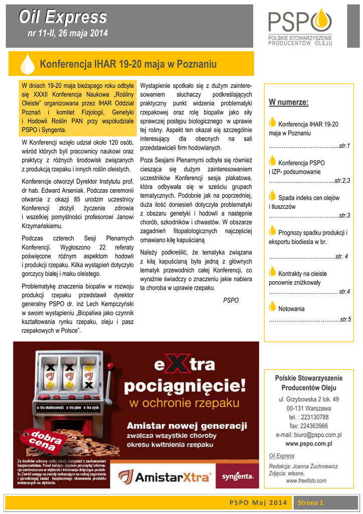 Oil Express nr 11-II, 26 maja 2014 Konferencja IHAR 19-20 maja w Poznaniu W dniach 19-20 maja bieżącego roku odbyła się XXXII Konferencja Naukowa „Rośliny Oleiste” organizowana przez IHAR Oddział Poznań i komitet Fizjologii, Genetyki i Hodowli Roślin PAN przy współudziale PSPO i Syngenta. Wystąpienie spotkało się z dużym zainteresowaniem słuchaczy podkreślających praktyczny punkt widzenia problematyki rzepakowej oraz rolę biopaliw jako siły sprawczej postępu biologicznego w uprawie tej rośny. Aspekt ten okazał się szczególnie interesujący dla obecnych na sali W Konferencji wzięło udział około 120 osób, przedstawicieli firm hodowlanych. wśród których byli pracownicy naukowi oraz praktycy z różnych środowisk związanych Poza Sesjami Plenarnymi odbyła się również z produkcją rzepaku i innych roślin oleistych. ciesząca się dużym zainteresowaniem uczestników Konferencji sesja plakatowa, Konferencje otworzył Dyrektor Instytutu prof. która odbywała się w sześciu grupach dr hab. Edward Arseniak. Podczas ceremonii tematycznych. Podobnie jak na poprzedniej, otwarcia z okazji 85 urodzin uczestnicy duża ilość doniesień dotyczyła problematyki Konferencji złożyli życzenia zdrowia z obszaru genetyki i hodowli a następnie i wszelkiej pomyślności profesorowi Janowi chorób, szkodników i chwastów. W obszarze Krzymańskiemu. zagadnień fitopatologicznych najczęściej Podczas czterech Sesji Plenarnych omawiano kiłę kapuścianą Konferencji. Wygłoszono 22 referaty Należy podkreślić, że tematyka związana poświęcone różnym aspektom hodowli z kiłą kapuścianą była jedną z głównych i produkcji rzepaku. Kilka wystąpień dotyczyło tematyk przewodnich całej Konferencji, co gorczycy białej i maku oleistego. wyraźnie świadczy o znaczeniu jakie nabiera Problematykę znaczenia biopaliw w rozwoju ta choroba w uprawie rzepaku. produkcji rzepaku przedstawił dyrektor PSPO generalny PSPO dr. inż Lech Kempczyński w swoim wystąpieniu „Biopaliwa jako czynnik kształtowania rynku rzepaku, oleju i pasz rzepakowych w Polsce”. W numerze: Konferencja IHAR 19-20 maja w Poznaniu …………..…………….….......str.1 Konferencja PSPO i IZP- podsumowanie …………..…………….…....str.2,3 Spada indeks cen olejów i tłuszczów …………..…………….….......str.3 Prognozy spadku produkcji i eksportu biodiesla w br. …………..……………….….str. 4 Kontrakty na oleiste ponownie zniżkowały …………..…………….…...... str.4 Notowania ………………..……...………..str.5 Polskie Stowarzyszenie Producentów Oleju ul. Grzybowska 2 lok. 49 00-131 Warszawa tel. : 223130788 fax: 224363966 e-mail: [email protected] www.pspo.com.pl Oil Express Redakcja: Joanna Żuchniewicz Zdjęcia: własne, www.freefoto.com PSPO Maj 2014 Strona 1 Oil Express Konferencja PSPO i IZP- podsumowanie W dniu 22 maja br. w budynku Ministerstwa Rolnictwa i Rozwoju Wsi odbyła się konferencja Polskiego Stowarzyszenia Producentów Oleju oraz Izby Zbożowo-Paszowej pt. „ Rynek pasz w Polsce, jego zaplecze surowcowe i kwestie bezpieczeństwa”. W konferencji wzięło udział ok. 100 uczestników, przedstawicieli administracji, świata nauki oraz przemysłu. Na spotkaniu obecne były również media, m.in. PAP, TVP1, Polskie Radio, agronews.pl. Tak wysoka frekwencja, pozwala nam wnioskować, że istnieje duża potrzeba dyskusji na zadany temat. Konferencję prowadzili Prezes PSPOMariusz Szeliga oraz Prezydent IZPAdam Tański. W imieniu Ministra Rolnictwa wystąpił Sekretarz Stanu w MRiRW - Kazimierz Plocke, który przedstawił aspekty finansowe nowej polityki gospodarczej na lata 2014-2020 oraz podkreślił znaczenie wysokobiałkowych roślin dla rozwoju produktów pochodzenia zwierzęcego. Jako pierwsza swoją prezentację wygłosiła pani Olga Michalik-Rutkowska z Wydziału Pasz Departamentu Bezpieczeństwa Żywności i Weterynarii MRiRW. Poinformowała ona zgromadzonych między innymi o działaniach Ministerstwa nad poszukiwaniem możliwości zastąpienia soi, m.in. poprzez większe wykorzystanie śrut: rzepakowej i słonecznikowej oraz o decyzji o przedłużeniu na kolejne lata dopłat do upraw roślin strączkowych i motylkowych. Następnie głos zabrał przedstawiciel Instytutu Ekonomiki Rolnictwa i Gospodarki Żywnościowej, który przedstawił swój głos w temacie perspektyw rynku pasz w kontekście rozwoju produkcji zwierzęcej. Podkreślał on niewystarczające zapasy pasz wysoko białkowych na rynku polskim, co zmusza nasz kraj do konieczności importu. Podkreślał, że pomimo dopłat ze strony państwa ich produkcja rośnie bardzo wolno. Jego zdaniem do 2017 roku i tak nie da się zastąpić śruty sojowej, śrutą rzepakową ze względu na rosnącą dynamikę wzrostu produkcji zwierzęcej, w tym drobiu. W dalszej części konferencji głos został przekazany przedstawicielowi przemysłu paszowego - Witoldowi Obidzińskiemu, reprezentującego firmę De Heus Sp. z o.o. Podkreślił on, że jednym z głównych czynników limitujących zużycie pasz rzepakowych w Polsce są kwestie emocjonalne, a nie ekonomiczne. Negatywne nastawienie rolników i producentów pasz do np. koloru pasz rzepakowych bierze niczym nie uzasadnioną górę nad rachunkiem ekonomicznym. Zaznaczył on, jak wielkie znaczenie ma podjęcie odpowiednich działań promocyjnych, które mają przekonać rolników o tym, aby chcieli oni karmić swoje zwierzęta śrutą rzepakową. Według jego szacunków w Polsce istnieje potencjalna możliwość zagospodarowania 2,5 mln ton śruty rzepakowej. Dyrektor Generalny PSPO - Lech Kempczyński w swojej prezentacji szczególną uwagę zwrócił na kwestię powiązania rynku biopaliwowego z przemysłem paszowym poprzez przemysł olejarski. Podkreślał też, że śruta oraz makuch, nie są produktami odpadowymi, jak zwykło się o nich mówić, ale stanowią jeden z produktów przemysłu olejar