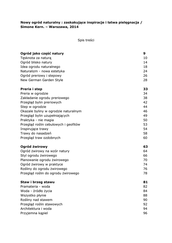 Nowy ogród naturalny : zaskakujące inspiracje i łatwa pielęgnacja / Simone Kern. – Warszawa, 2014 Spis treści Ogród jako część natury Tęsknota za naturą Ogród blisko natury Idea ogrodu naturalnego Naturalizm - nowa estetyka Ogród preriowy i stepowy New German Garden Style 9 10 14 18 24 26 28 Preria i step Preria w ogrodzie Zakładanie ogrodu preriowego Przegląd bylin preriowych Step w ogrodzie Okazale byliny w ogrodzie naturalnym Przegląd bylin uzupełniających Praktyka - nie magia Przegląd roślin cebulowych i geofitów Inspirujące trawy Trawy do nasadzeń Przegląd traw ozdobnych 33 34 38 42 44 46 49 50 53 54 58 60 Ogród żwirowy Ogród żwirowy na wzór natury Styl ogrodu żwirowego Planowanie ogrodu żwirowego Ogród żwirowy w praktyce Rośliny do ogrodu żwirowego Przegląd roślin do ogrodu żwirowego 63 64 66 70 74 76 78 Staw i brzeg stawu Pramateria - woda Woda - źródło życia Wszystko płynie Rośliny nad stawem Przegląd roślin stawowych Architektura i woda Przyjemna kąpiel 81 82 84 88 90 92 94 96 Las i jego brzeg W obronie drzew w ogrodzie Nowoczesny ogród leśny Struktura liści w zacienionym ogrodzie Liście i kwiaty Ulubione zakątki w cieniu Przegląd bylin cieniolubnych Mobilne cieniste ogrody 99 100 102 104 106 108 110 112 Ogród dla ludzi i zwierząt Ogród dla odkrywców Rośliny dla zmysłów Przegląd roślin o kwiatach pachnących Przegląd ziół Ogród dla fauny Przegląd roślin dla owadów i ptaków Ogród na pokolenia 115 116 118 122 126 128 134 136 Indeks 138 oprac. BPK