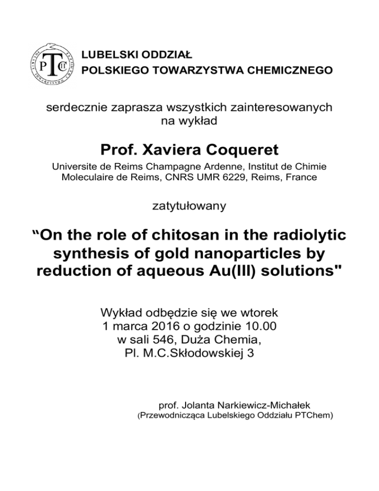 LUBELSKI ODDZIAŁ POLSKIEGO TOWARZYSTWA CHEMICZNEGO serdecznie zaprasza wszystkich zainteresowanych na wykład Prof. Xaviera Coqueret Universite de Reims Champagne Ardenne, Institut de Chimie Moleculaire de Reims, CNRS UMR 6229, Reims, France zatytułowany “On the role of chitosan in the radiolytic synthesis of gold nanoparticles by reduction of aqueous Au(III) solutions" Wykład odbędzie się we wtorek 1 marca 2016 o godzinie 10.00 w sali 546, Duża Chemia, Pl. M.C.Skłodowskiej 3 prof. Jolanta Narkiewicz-Michałek (Przewodnicząca Lubelskiego Oddziału PTChem)