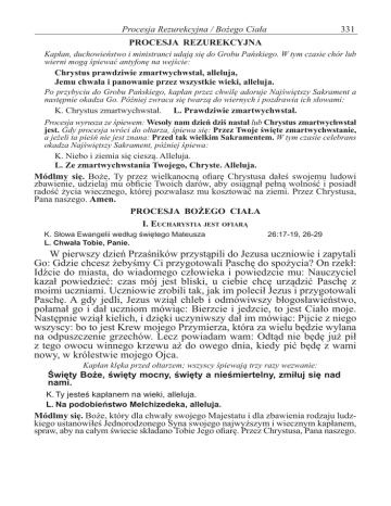Procesja Rezurekcyjna / Bożego Ciała 331 PROCESJA REZUREKCYJNA Kapłan, duchowieństwo i ministranci udają się do Grobu Pańskiego. W tym czasie chór lub wierni mogą śpiewać antyfonę na wejście: Chrystus prawdziwie zmartwychwstał, alleluja, Jemu chwała i panowanie przez wszystkie wieki, alleluja. Po przybyciu do Grobu Pańskiego, kapłan przez chwilę adoruje Najświętszy Sakrament a następnie okadza Go. Później zwraca się twarzą do wiernych i pozdrawia ich słowami: K. Chrystus zmartwychwstał. L. Prawdziwie zmartwychwstał. Procesja wyrusza ze śpiewem: Wesoły nam dzień dziś nastał lub Chrystus zmartwychwstał jest. Gdy procesja wróci do ołtarza, śpiewa się: Przez Twoje święte zmartwychwstanie, a jeżeli ta pieśń nie jest znana: Przed tak wielkim Sakramentem. W tym czasie celebrans okadza Najświętszy Sakrament, później śpiewa: K. Niebo i ziemia się cieszą. Alleluja. L. Ze zmartwychwstania Twojego, Chryste. Alleluja. Módlmy się. Boże, Ty przez wielkanocną ofiarę Chrystusa dałeś swojemu ludowi zbawienie, udzielaj mu obficie Twoich darów, aby osiągnął pełną wolność i posiadł radość życia wiecznego, której pozwalasz mu kosztować na ziemi. Przez Chrystusa, Pana naszego. Amen. PROCESJA BOŻEGO CIAŁA I. Eucharystia jest ofiarą K. Słowa Ewangelii według świętego Mateusza 26:17-19, 26-29 L. Chwała Tobie, Panie. W pierwszy dzień Przaśników przystąpili do Jezusa uczniowie i zapytali Go: Gdzie chcesz żebyśmy Ci przygotowali Paschę do spożycia? On rzekł: Idźcie do miasta, do wiadomego człowieka i powiedzcie mu: Nauczyciel kazał powiedzieć: czas mój jest bliski, u ciebie chcę urządzić Paschę z moimi uczniami. Uczniowie zrobili tak, jak im polecił Jezus i przygotowali Paschę. A gdy jedli, Jezus wziął chleb i odmówiwszy błogosławieństwo, połamał go i dał uczniom mówiąc: Bierzcie i jedzcie, to jest Ciało moje. Następnie wziął kielich, i dzięki uczyniwszy dał im mówiąc: Pijcie z niego wszyscy: bo to jest Krew mojego Przymierza, która za wielu będzie wylana na odpuszczenie grzechów. Lecz powiadam wam: Odtąd nie będę już pił z tego owocu winnego krzewu aż do owego dnia, kiedy pić będę z wami nowy, w królestwie mojego Ojca. Kapłan klęka przed ołtarzem; wszyscy śpiewają trzy razy wezwanie: Święty Boże, święty mocny, święty a nieśmiertelny, zmiłuj się nad nami. K.Ty jesteś kapłanem na wieki, alleluja. L.Na podobieństwo Melchizedeka, alleluja. Módlmy się. Boże, który dla chwały swojego Majestatu i dla zbawienia rodzaju ludzkiego ustanowiłeś Jednorodzonego Syna swojego najwyższym i wiecznym kapłanem, spraw, aby na całym świecie składano Tobie Jego ofiarę. Przez Chrystusa, Pana naszego. 332 Procesja Bożego Ciała II. Eucharystia jest pokarmem duszy K. Słowa Ewangelii według świętego Marka L. Chwała Tobie, Panie. 8:1-9 W owym czasie, gdy wielka rzesza była z Jezusem i nie mieli co jeść, przywołał do siebie uczniów i rzekł im: Żal mi tego ludu, bo już trzy dni trwają przy mnie, a nie mają nic do jedzenia. A jeśli ich puszczę zgłodniałych do domu, ustaną w drodze, bo niektórzy z nich przyszli z daleka. Odpowiedzieli Mu uczniowie: Skąd tu na pustkowiu będzie mógł ktoś nakarmić ich chlebem? Zapytał ich: Ile macie chlebów? Odpowiedzieli: Siedem. I rozkazał ludowi usiąść na ziemi, a wziąwszy te siedem chlebów, dzięki uczynił, połamał je i dawał uczniom, aby je rozdzielali ludowi. Mieli też kilka rybek. Odmówił błogosławieństwo nad nimi i polecił je również rozdać. Jedli i nasycili się: a pozostałych ułomków zebrali siedem koszów. Było zaś tych, którzy jedli, około czterech tysięcy. Potem ich odprawił. Wszyscy śpiewają trzy razy wezwanie: Od powietrza, głodu, ognia i wojny, wybaw nas, Panie. K. Pan dał pożywienie swoim czcicielom, alleluja. L. Aby uwiecznić pamięć swoich cudów, alleluja. Módlmy się. Tchnij w nas, Panie, Twojego ducha miłości i w swojej dobroci doprowadź do jedności wszystkich, których posilasz jednym chlebem niebieskim. Przez Chrystusa, Pana naszego. III. Eucharystia jest sakramentem zjednoczenia K. Słowa Ewangelii według świętego Łukasza L. Chwała Tobie, Panie. 14:16-24 W owym czasie Jezus opowiedział faryzeuszom tę przypowieść: Pewien człowiek wyprawił wielką ucztę i zaprosił wielu. W porze uczty posłał swego sługę, aby powiedział zaproszonym: Przyjdźcie, bo już wszystko gotowe. Wtedy wszyscy zaczęli się jednomyślnie wymawiać. Pierwszy kazał mu powiedzieć: Kupiłem pole, muszę wyjść i obejrzeć je; proszę cię, miej mnie za usprawiedliwionego. Drugi rzekł: Kupiłem pięć par wołów i idę je wypróbować; proszę cię, miej mnie za wymówionego. Jeszcze inny rzekł: Ożeniłem się i dlatego przyjść nie mogę. Sługa powróciwszy oznajmił to swemu panu. Wtedy pan rozgniewał się i nakazał słudze: Wyjdź co prędzej na ulice i zaułki, wprowadź tu ubogich, niewidomych i chromych. Sługa oznajmił: Panie, stało się jak rozkazałeś, a jeszcze jest miejsce. Na to pan rzekł do sługi: Wyjdź na drogi i między opłotki i zmuszaj do wejścia, aby dom mój był zapełniony. Bo mówię wam: Żaden z owych ludzi, którzy byli zaproszeni, nie skosztuje mojej uczty. Wszyscy śpiewają trzy razy wezwanie: Od nagłej a niespodziewanej śmierci, zachowaj nas, Panie. K. Oto chleb żywy, który zstąpił z nieba, alleluja. L. Kto go pożywa, będzie żył na wieki, alleluja. Módlmy się. Wszechmogący, wieczny Boże, spraw, abyśmy żyjąc rozsądnie, pobożnie i sprawiedliwie, zasłużyli na przyjęcie w chwili naszej śmierci Najświętszego Sakramentu Ciała i Krwi Pana naszego, Jezusa Chrystusa. Który żyje i króluje na wieki wieków. Procesja Bożego Ciała 333 IV. Eucharystia jest zadatkiem nieśmiertelności K. Słowa Ewangelii według św. Jana L. Chwała Tobie, Panie. 15:5-11 W owym czasie Jezus powiedział swoim uczniom: Ja jestem krze