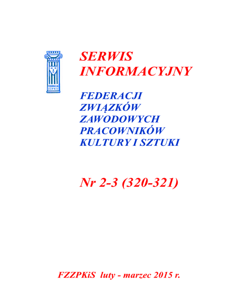 SERWIS INFORMACYJNY FEDERACJI ZWIĄZKÓW ZAWODOWYCH PRACOWNIKÓW KULTURY I SZTUKI Nr 2-3 (320-321) FZZPKiS luty - marzec 2015 r. SPIS TREŚCI: 1. „Wartość zobowiązuje” - ks. Józef Tiszner . . . . . . . . . . . . . . . . . . . . . . . . . . str.1 2. Domagamy się prawa odpisywania składek związkowych w PIT-ach str.2 3. Obrady II Prezydium Zgromadzenia Delegatów Związkowych . . . . . . . str.3 4. W marcu posiedzenia Komisji Rewizyjnej i Zgromadzenia Delegatów str.4 5. OPZZ. List otwarty do Prezydenta Rzeczypospolitej Polskiej . . . . . . . . . str.5 6. Gratulacje dla Marii Brodzickiej-Satora . . . . . . . . . . . . . . . . . . . . . . . . . . str.6 7. Wybory nad Notecią . . . . . . . . . . . . . . . . . . . . . . . . . . . . . . . . . . . . . . . . . . . str.7 8. LABOR LEX: - Kto może być Społecznym Inspektorem Pracy . . . . . . . . . . . . . . . . . . . . - Państwowa Inspekcja Pracy w Koninie odpowiada . . . . . . . . . . . . . . . . str.8-9 str.10-11 Na 129 wniosków Komisja CEA uwzględniła 125. Notatka Elżbiety Miś . . . . . . . . . . . . . . . . . . . . . . . . . . . . . . . . . . . . . . . . . . str.12 10. Zaopatrzenia Emerytalne Twórców w roku 2014 . . . . . . . . . . . . . . . . . . . str.13 11. Jaki będzie dialog społeczny? . . . . . . . . . . . . . . . . . . . . . . . . . . . . . . . . . . . str.14 12. „Na pół gwizdka” – prof. Jacek Wojciechowski . . . . . . . . . . . . . . . . . . . . str.15-19 13. KTO jest KTO . . . . . . . . . . . . . . . . . . . . . . . . . . . . . . . . . . . . . . . . . . . . . . . str.20-21 14. Kronika związkowa (grudzień 2014 - marzec 2015 r.) . . . . . . . . . . . . . . . str.22-24 9. Dokumenty: - Manifest UNI MEI w sprawie niezależnej, o wysokiej jakości publicznej TV. - Kto płaci za molestowanie (art. GW - 2.03.2015 r.) Serwis przeznaczony do użytku wewnętrznego związków członkowskich Federacji ZZPKiS Strona internetowa http://www.fzzpkis.pl e-mail: [email protected] Red. prowadzący: Jan Budkiewicz; współpraca: Urszula Wieczorek 00–871 Warszawa, ul. Żelazna 67 lok. 66 Telefony: Przew. 22 629 85 80, fax 22 628 90 39, dz. fin. 22 621 43 81, dz. org. 22 621 80 51, porady związkowe i prawne 22 621 80 51 lub 22 629 85 80 Konto bankowe: PKO Bank Polski SA XV Oddział Centrum Nr 34 1020 1156 0000 7102 0060 1146 Nakład 130 egz. Oddano do druku 10.03.2015 r. Wydawca: FZZPKiS; Przygotowanie do druku: Firma LEWMARK „Wartość zobowiązuje” ks. Józef Tischner Federacja Związków Zawodowych Pracowników Kultury i Sztuki L.dz. 96/2015 Warszawa, 9.02. 2015 r. Kol. Jan Guz Przewodniczący Ogólnopolskiego Porozumienia Związków Zawodowych Realizując uchwałę VIII Zjazdu Związków Członkowskich, Prezydium ZDZ Federacji Związków Zawodowych Pracowników Kultury i Sztuki zwraca się do Kierownictwa OPZZ o wprowadzenie na listę postulatów związkowych skierowanych do Rządu RP, ustawowego prawa odpisywania w indywidualnym zeznaniu podatkowym PIT, składek członkowskich przekazywanych na rzecz Związku Zawodowego. W imieniu Prezydium ZDZ Jan Budkiewicz Przewodniczący Federacji ZZPKiS Do wiadomości: - Związki Członkowskie Federacji ZZPKiS 2 SERWIS INFORMACYJNY FZZPKiS Obrady II Prezydium Zgromadzenia Delegatów Związkowych Federacji W dniu 9 lutego 2015 r. odbyło się drugie posiedzenie Prezydium Zgromadzenia Delegatów Związkowych Federacji. W posiedzeniu uczestniczyło 7 członków Prezydium: Jan Budkiewicz, Jerzy Doliński, Agnieszka Kociuban, Bogumiła Kruszka, Sławomir Mikołajczyk, Romuald Rykiert, Janusz Wolicki oraz Przewodniczący Komisji Rewizyjnej Piotr Szczechowiak. Przedmiotem obrad było m.in.: - omówienie stanu negocjacji z kancelarią adwokacką mec. S. Kłysa dot. roszczeń PAU, - informacje o przebiegu spraw sądowych przeciwko b. menedżerom „Świętoszka”, - problemy związkowe – stan prawny, ankiety, składki. - zatwierdzenie zaktualizowanych regulaminów dla pracowników Federacji. Prezydium podjęło uchwały m.in. w sprawach: • zatwierdzenia dotychczasowych działań przedstawicieli Federacji z kancelarią adwokacką mec. Stanisława Kłysa dot. roszczeń PAU. • zatwierdzenia Regulaminu Wynagradzania Pracowników Biura Federacji. • zatwierdzenia Regulaminu w sprawie dodatkowych wynagrodzeń rocznych pracowników Biura Federacji. • zatwierdzenia Regulaminu Wynagradzania Osób Zatrudnionych w Agendzie Federacji ZZPKiS – Dział IPA . • skreślenia z listy członków Federacji, Regionalnego Związku Zawodowego Pracowników Instytucji Kultury w Sieradzu z powodu rozwiązania się Związku. • skreślenia z listy członków FZZPKiS, Międzyzakładowego Związku Zawodowego Pracowników Bibliotek Publicznych w Koninie z powodu uchwały tej organizacji o wystąpieniu z Federacji. Prezydium ZDZ podjęło decyzję o zwołaniu II posiedzenia Zgromadzenia Delegatów Związkowych, które odbędzie się w dniu 16 marca 2015 r. i zostanie poprzedzone posiedzeniem KR. SERWIS INFORMACYJNY FZZPKiS 3 Przewidywane tematy na posiedzenie Zgromadzenia Delegatów Związkowych 16 marca 2015 r.: Analiza i przyjęcie sprawozdania z działalności Prezydium Zgromadzenia Delegatów od 25 października 2014r. do 16 marca 2015r. Ocena realizacji preliminarza finansowego w oraz wyników bilansowych za rok 2014. Wysłuchanie opinii i zaleceń Komisji Rewizyjnej dot. sprawozdania finansowego. Zatwierdzenie sprawozdania i bilansu za rok 2014 r. Omówienie staniu negocjacji z kancelarią adwokacką mec. S. Kłysa dotyczących roszczeń PAU, oraz przebiegu spraw procesowych, których uczestnikiem jest Federacja. Uchwalenie preliminarza budżetowego Federacji na 2015 r. Problemy związkowe - stan prawny, ankiety, składki oraz przyjęcie do Federacji Związku Zawodowego Bibliotekarzy Biblioteki Narodowej. Tematy na posiedzenie Komisji Rewizyjnej Federacji 15 marca 2015 r.: Omówienie projektu Regulaminu działalności Komisji Rewizyjnej FZZPKiS. Podjęcie uchwały o jego przyjęciu (z wnioskiem d