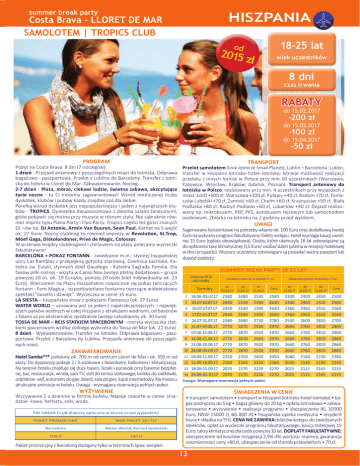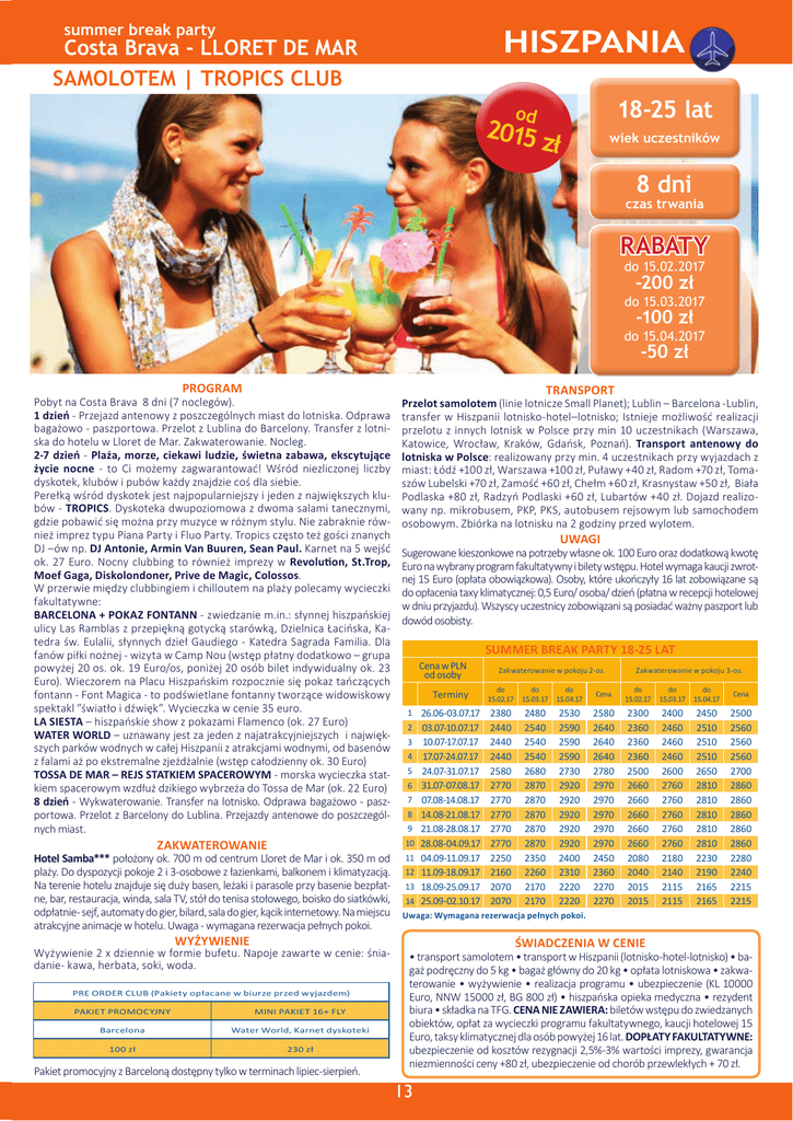 summer break party HISZPANIA Costa Brava - LLORET DE MAR SAMOLOTEM | TROPICS CLUB 18-25 lat od 2015 zł wiek uczestników 8 dni czas trwania RABATY do 15.02.2017 -200 zł do 15.03.2017 -100 zł do 15.04.2017 -50 zł PROGRAM Pobyt na Costa Brava 8 dni (7 noclegów). 1 dzień - Przejazd antenowy z poszczególnych miast do lotniska. Odprawa bagażowo - paszportowa. Przelot z Lublina do Barcelony. Transfer z lotniska do hotelu w Lloret de Mar. Zakwaterowanie. Nocleg. 2-7 dzień - Plaża, morze, ciekawi ludzie, świetna zabawa, ekscytujące życie nocne - to Ci możemy zagwarantować! Wśród niezliczonej liczby dyskotek, klubów i pubów każdy znajdzie coś dla siebie. Perełką wśród dyskotek jest najpopularniejszy i jeden z największych klubów - TROPICS. Dyskoteka dwupoziomowa z dwoma salami tanecznymi, gdzie pobawić się można przy muzyce w różnym stylu. Nie zabraknie również imprez typu Piana Party i Fluo Party. Tropics często też gości znanych DJ –ów np. DJ Antonie, Armin Van Buuren, Sean Paul. Karnet na 5 wejść ok. 27 Euro. Nocny clubbing to również imprezy w Revolution, St.Trop, Moef Gaga, Diskolondoner, Prive de Magic, Colossos. W przerwie między clubbingiem i chilloutem na plaży polecamy wycieczki fakultatywne: BARCELONA + POKAZ FONTANN - zwiedzanie m.in.: słynnej hiszpańskiej ulicy Las Ramblas z przepiękną gotycką starówką, Dzielnica Łacińska, Katedra św. Eulalii, słynnych dzieł Gaudiego - Katedra Sagrada Familia. Dla fanów piłki nożnej - wizyta w Camp Nou (wstęp płatny dodatkowo – grupa powyżej 20 os. ok. 19 Euro/os, poniżej 20 osób bilet indywidualny ok. 23 Euro). Wieczorem na Placu Hiszpańskim rozpocznie się pokaz tańczących fontann - Font Magica - to podświetlane fontanny tworzące widowiskowy spektakl ”światło i dźwięk”. Wycieczka w cenie 35 euro. LA SIESTA – hiszpańskie show z pokazami Flamenco (ok. 27 Euro) WATER WORLD – uznawany jest za jeden z najatrakcyjniejszych i największych parków wodnych w całej Hiszpanii z atrakcjami wodnymi, od basenów z falami aż po ekstremalne zjeżdżalnie (wstęp całodzienny ok. 30 Euro) TOSSA DE MAR – REJS STATKIEM SPACEROWYM - morska wycieczka statkiem spacerowym wzdłuż dzikiego wybrzeża do Tossa de Mar (ok. 22 Euro) 8 dzień - Wykwaterowanie. Transfer na lotnisko. Odprawa bagażowo - paszportowa. Przelot z Barcelony do Lublina. Przejazdy antenowe do poszczególnych miast. ZAKWATEROWANIE TRANSPORT Przelot samolotem (linie lotnicze Small Planet); Lublin – Barcelona -Lublin, transfer w Hiszpanii lotnisko-hotel–lotnisko; Istnieje możliwość realizacji przelotu z innych lotnisk w Polsce przy min 10 uczestnikach (Warszawa, Katowice, Wrocław, Kraków, Gdańsk, Poznań). Transport antenowy do lotniska w Polsce: realizowany przy min. 4 uczestnikach przy wyjazdach z miast: Łódź +100 zł, Warszawa +100 zł, Puławy +40 zł, Radom +70 zł, Tomaszów Lubelski +70 zł, Zamość +60 zł, Chełm +60 zł, Krasnystaw +50 zł, Biała Podlaska +80 zł, Radzyń Podlaski +60 zł, Lubartów +40 zł. Dojazd realizowany np. mikrobusem, PKP, PKS, autobusem rejsowym lub samochodem osobowym. Zbiórka na lotnisku na 2 godziny przed wylotem. UWAGI Sugerowane kieszonkowe na potrzeby własne ok. 100 Euro oraz dodatkową kwotę Euro na wybrany program fakultatywny i bilety wstępu. Hotel wymaga kaucji zwrotnej 15 Euro (opłata obowiązkowa). Osoby, które ukończyły 16 lat zobowiązane są do opłacenia taxy klimatycznej: 0,5 Euro/ osoba/ dzień (płatna w recepcji hotelowej w dniu przyjazdu). Wszyscy uczestnicy zobowiązani są posiadać ważny paszport lub dowód osobisty. SUMMER BREAK PARTY 18-25 LAT Cena w PLN od osoby Terminy 1 26.06-03.07.17 2 3 4 5 6 7 8 9 10 Hotel Samba*** położony ok. 700 m od centrum Lloret de Mar i ok. 350 m od plaży. Do dyspozycji pokoje 2 i 3-osobowe z łazienkami, balkonem i klimatyzacją. Na terenie hotelu znajduje się duży basen, leżaki i parasole przy basenie bezpłatne, bar, restauracja, winda, sala TV, stół do tenisa stołowego, boisko do siatkówki, odpłatnie- sejf, automaty do gier, bilard, sala do gier, kącik internetowy. Na miejscu atrakcyjne animacje w hotelu. Uwaga - wymagana rezerwacja pełnych pokoi. 11 12 13 14 PRE ORDER CLUB (Pakiety opłacane w biurze przed wyjazdem) PAKIET PROMOCYJNY MINI PAKIET 16+ FLY Barcelona Water World, Karnet dyskoteki 100 zł 230 zł Pakiet promocyjny z Barceloną dostępny tylko w terminach lipiec-sierpień. do 15.03.17 do 15.04.17 2380 2440 2440 2440 2580 2770 2770 2770 2770 2770 2250 2160 2070 2070 2480 2540 2540 2540 2680 2870 2870 2870 2870 2870 2350 2260 2170 2170 2530 2590 2590 2590 2730 2920 2920 2920 2920 2920 2400 2310 2220 2220 Zakwaterowanie w pokoju 3-os. Cena do 15.02.17 do 15.03.17 do 15.04.17 Cena 2580 2640 2640 2640 2780 2970 2970 2970 2970 2970 2450 2360 2270 2270 2300 2360 2360 2360 2500 2660 2660 2660 2660 2660 2080 2040 2015 2015 2400 2460 2460 2460 2600 2760 2760 2760 2760 2760 2180 2140 2115 2115 2450 2510 2510 2510 2650 2810 2810 2810 2810 2810 2230 2190 2165 2165 2500 2560 2560 2560 2700 2860 2860 2860 2860 2860 2280 2240 2215 2215 Uwaga: Wymagana rezerwacja pełnych pokoi. WYŻYWIENIE Wyżywienie 2 x dziennie w formie bufetu. Napoje zawarte w cenie: śniadanie- kawa, herbata, soki, woda. 03.07-10.07.17 10.07-17.07.17 17.07-24.07.17 24.07-31.07.17 31.07-07.08.17 07.08-14.08.17 14.08-21.08.17 21.08-28.08.17 28.08-04.09.17 04.09-11.09.17 11.09-18.09.17 18.09-25.09.17 25.09-02.10.17 Zakwaterowanie w pokoju 2-os. do 15.02.17 ŚWIADCZENIA W CENIE • transport samolotem • transport w Hiszpanii (lotnisko-hotel-lotnisko) • bagaż podręczny do 5 kg • bagaż główny do 20 kg • opłata lotniskowa • zakwaterowanie • wyżywienie • realizacja programu • ubezpieczenie (KL 10000 Euro, NNW 15000 zł, BG 800 zł) • hiszpańska opieka medyczna • rezydent biura • składka na TFG. CENA NIE ZAWIERA: biletów wstępu do zwiedzanych obiektów, opłat za wycieczki programu fakultatywn