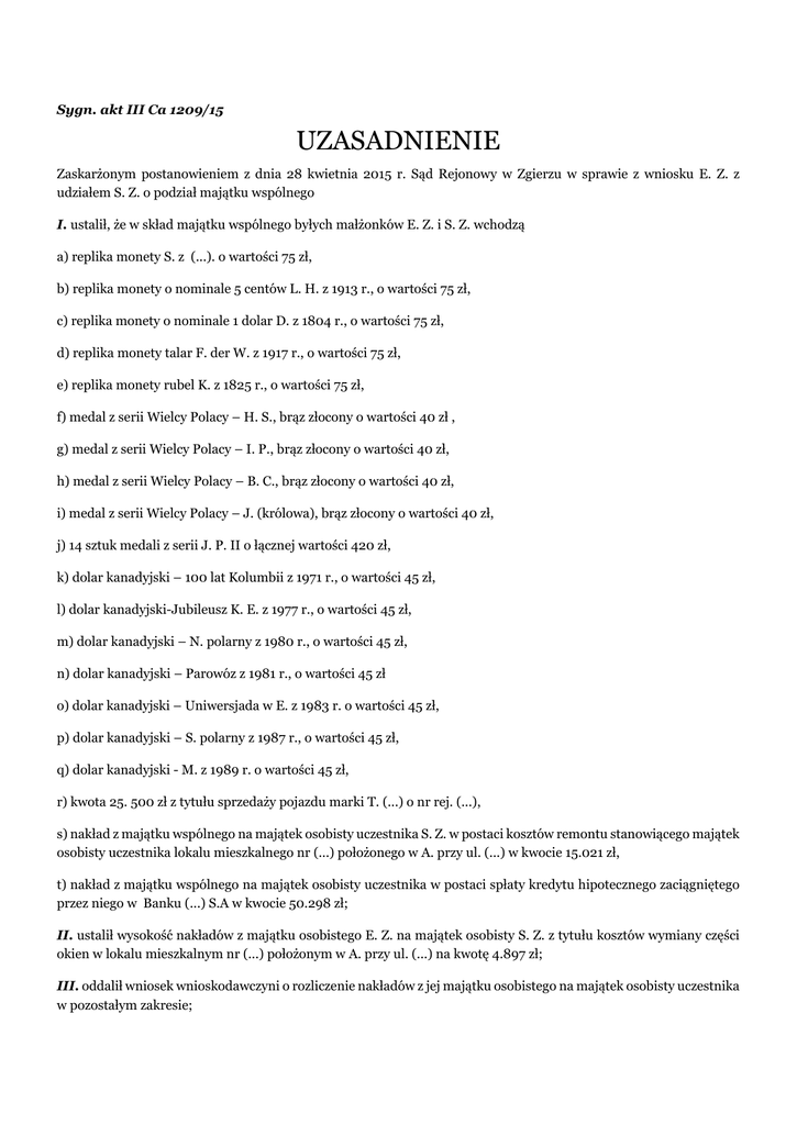 Sygn. akt III Ca 1209/15 UZASADNIENIE Zaskarżonym postanowieniem z dnia 28 kwietnia 2015 r. Sąd Rejonowy w Zgierzu w sprawie z wniosku E. Z. z udziałem S. Z. o podział majątku wspólnego I. ustalił, że w skład majątku wspólnego byłych małżonków E. Z. i S. Z. wchodzą a) replika monety S. z (...). o wartości 75 zł, b) replika monety o nominale 5 centów L. H. z 1913 r., o wartości 75 zł, c) replika monety o nominale 1 dolar D. z 1804 r., o wartości 75 zł, d) replika monety talar F. der W. z 1917 r., o wartości 75 zł, e) replika monety rubel K. z 1825 r., o wartości 75 zł, f) medal z serii Wielcy Polacy – H. S., brąz złocony o wartości 40 zł , g) medal z serii Wielcy Polacy – I. P., brąz złocony o wartości 40 zł, h) medal z serii Wielcy Polacy – B. C., brąz złocony o wartości 40 zł, i) medal z serii Wielcy Polacy – J. (królowa), brąz złocony o wartości 40 zł, j) 14 sztuk medali z serii J. P. II o łącznej wartości 420 zł, k) dolar kanadyjski – 100 lat Kolumbii z 1971 r., o wartości 45 zł, l) dolar kanadyjski-Jubileusz K. E. z 1977 r., o wartości 45 zł, m) dolar kanadyjski – N. polarny z 1980 r., o wartości 45 zł, n) dolar kanadyjski – Parowóz z 1981 r., o wartości 45 zł o) dolar kanadyjski – Uniwersjada w E. z 1983 r. o wartości 45 zł, p) dolar kanadyjski – S. polarny z 1987 r., o wartości 45 zł, q) dolar kanadyjski - M. z 1989 r. o wartości 45 zł, r) kwota 25. 500 zł z tytułu sprzedaży pojazdu marki T. (...) o nr rej. (...), s) nakład z majątku wspólnego na majątek osobisty uczestnika S. Z. w postaci kosztów remontu stanowiącego majątek osobisty uczestnika lokalu mieszkalnego nr (...) położonego w A. przy ul. (...) w kwocie 15.021 zł, t) nakład z majątku wspólnego na majątek osobisty uczestnika w postaci spłaty kredytu hipotecznego zaciągniętego przez niego w Banku (...) S.A w kwocie 50.298 zł; II. ustalił wysokość nakładów z majątku osobistego E. Z. na majątek osobisty S. Z. z tytułu kosztów wymiany części okien w lokalu mieszkalnym nr (...) położonym w A. przy ul. (...) na kwotę 4.897 zł; III. oddalił wniosek wnioskodawczyni o rozliczenie nakładów z jej majątku osobistego na majątek osobisty uczestnika w pozostałym zakresie; IV. ustalił wysokości nakładów z majątku osobistego S. Z. na majątek wspólny w postaci spłaty kredytów zaciągniętych przez E. i S. Z. na łączną kwotę 70.575,09 zł; V. oddalił wniosek uczestnika o rozliczenie nakładów poczynionych z jego majątku osobistego na majątek wspólny w pozostałym zakresie; VI. dokonał podziału majątku wspólnego byłych małżonków E. Z. i S. Z. w ten sposób, że składniki majątkowe opisane w punkcie I a) – t) przyznał S. Z.; VII. zasądził od E. Z. na rzecz S. Z., tytułem spłaty dokonanych przez niego nakładów z majątku osobistego na majątek wspólny kwotę 19.633,59 zł w terminie 2 miesięcy od dnia uprawomocnienia się postanowienia – wraz z ustawowymi odsetkami w przypadku uchybienia terminowi płatności; VIII. przyznać (...) Bankowi (...) S.A z siedzibą w W. kwotę 25 zł tytułem wynagrodzenia za przekazanie informacji bankowych, którą to kwotę wypłacić tymczasowo z funduszy Skarbu Państwa – Sądu Rejonowego w Zgierzu; IX. ustalić, że każdy z uczestników ponosi koszty związane ze swoim udziałem w sprawie, pozostawiając ich szczegółowe wyliczenie referendarzowi sądowemu. Z zapadłym orzeczeniem nie zgodził się wnioskodawca S. Z., który zakwestionował postanowienie w części co do: ● pkt II ustalającego fakt poczynienia nakładów z majątku osobistego wnioskodawczyni na majątek osobisty uczestnika przez pokrycie przez E. Z. kosztów wymiany części okien w kwocie 4.897 zł; ● pkt IV ustalającego wysokość nakładów z majątku osobistego S. Z. na majątek wspólny w postaci spłaty kredytów zaciągniętych przez byłych małżonków w kwocie 70.575,09 zł zamiast faktycznie wydatkowanej przez niego kwoty 96.659,21 zł; ● pkt V oddalającego wniosek uczestnika o rozliczenie nakładów poczynionych z jego majątku osobistego na majątek wspólny w pozostałym zakresie; ● pkt VI, w którym Sąd przyznał uczestnikowi składniki majątkowe w postaci monet, nie orzekając o ich wydaniu ● pkt VII zasądzającego od wnioskodawczyni na rzecz uczestnika spłaty w wysokości 19.633,59 zł, zamiast należnej mu z tego tytułu kwoty 96.024,21 zł. Sformułowane pod adresem rozstrzygnięcia zarzuty dotyczyły zaś: 1. naruszenia przepisów postępowania, które miało istotny wpływ na treść wydanego orzeczenia, a mianowicie: a) art. 233 § 1 k.p.c., art. 227 k.p.c. i art. 316 k.p.c. w zw. z art. 13 § 2 k.p.c. przez brak wszechstronnego rozważenia zebranego w sprawie materiału dowodowego, pominięcie celów na jakie były zaciągane były kredyty przez byłych małżonków, ich sytuacji rodzinnej i warunków wspólnego życia, niewłaściwą ocenę zebranego w sprawie materiału dowodowego i w związku z tym dokonanie błędnych ustaleń (np. przyjęcie wbrew treści wyjaśnień informacyjnie przesłuchanego uczestnika, że przyznał on pokrycie kosztów wymiany części okiem z majątku osobistego wnioskodawczyni), pominięcie istotnych dowodów takich jak zaświadczenie z M. o spłacie kredytu samochodowego kwotą 20.800 zł z konta bankowego firmy (...) – S. Z., które to konto Sąd uznał za związane z majątkiem osobistym uczestnika, bezkrytyczne potraktowanie opinii biegłego W. P., który stwierdził znaczący wzrost wartości lokalu wobec dokonania w nim prac remontowo – modernizacyjnych, które miały jedynie przywrócić stan lokalu do istniejącego w 2000 r.; b) art. 567 § 3 k.p.c. w zw. z art. 688 k.p.c. i art. 624 k.p.c., co polegało na nie orzeczeniu o wydaniu na rzecz S. Z. monet opisanych w pkt I postanowienia, znajdujących się w posiadaniu E. Z. , których własność została mu przyznana; 2. obrazę prawa materialnego