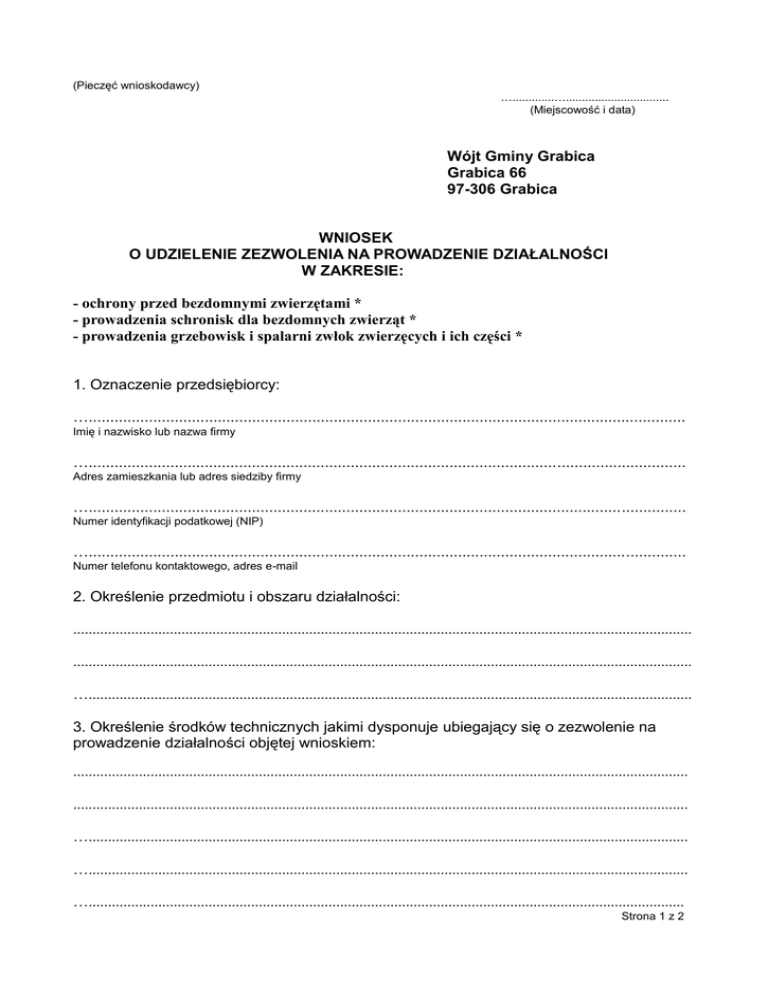 (Pieczęć wnioskodawcy) ….............…................................ (Miejscowość i data) Wójt Gminy Grabica Grabica 66 97-306 Grabica WNIOSEK O UDZIELENIE ZEZWOLENIA NA PROWADZENIE DZIAŁALNOŚCI W ZAKRESIE: - ochrony przed bezdomnymi zwierzętami * - prowadzenia schronisk dla bezdomnych zwierząt * - prowadzenia grzebowisk i spalarni zwłok zwierzęcych i ich części * 1. Oznaczenie przedsiębiorcy: …........................................................................................................................................... Imię i nazwisko lub nazwa firmy …........................................................................................................................................... Adres zamieszkania lub adres siedziby firmy …........................................................................................................................................... Numer identyfikacji podatkowej (NIP) …........................................................................................................................................... Numer telefonu kontaktowego, adres e-mail 2. Określenie przedmiotu i obszaru działalności: ................................................................................................................................................................ ................................................................................................................................................................ …............................................................................................................................................................ 3. Określenie środków technicznych jakimi dysponuje ubiegający się o zezwolenie na prowadzenie działalności objętej wnioskiem: ............................................................................................................................................................... ............................................................................................................................................................... …........................................................................................................................................................... …........................................................................................................................................................... ….......................................................................................................................................................... Strona 1 z 2 4. Informacje o technologiach stosowanych lub przewidzianych do stosowania przy świadczeniu usług w zakresie działalności objętej wnioskiem: ................................................................................................................................................ ................................................................................................................................................ …............................................................................................................................................ …............................................................................................................................................ 5. Proponowane zabiegi z zakresu ochrony środowiska i ochrony sanitarnej planowane po zakończeniu działalności: ................................................................................................................................................ ................................................................................................................................................ …............................................................................................................................................ 6. Określenie terminu podjęcia działalności objętej wnioskiem oraz zamierzonego czasu jej prowadzenia: ................................................................................................................................................ ................................................................................................................................................ …............................................................................................................................................ .................................... (podpis wnioskodawcy) Strona 2 z 2 Załączniki: I Zaświadczenia i oświadczenia: 1. Zaświadczenie / oświadczenie * o braku zaległości podatkowych. 2. Zaświadczenie / oświadczenie * o braku zaległości w płaceniu składek na ubezpieczenie zdrowotne lub społeczne. Oświadczenie składa się pod rygorem odpowiedzialności karnej za składanie fałszywych zeznań. Składający oświadczenie jest obowiązany do zawarcia w nim klauzuli następującej treści: „Jestem świadomy odpowiedzialności karnej za złożenie fałszywego oświadczenia.”. Klauzula ta zastępuje pouczenie organu o odpowiedzialności karnej za składanie fałszywych zeznań. II Dokumenty związane z prowadzeniem poszczególnej działalności: 1. Dotyczy zezwolenia na prowadzenie działalności w zakresie ochrony przed bezdomnymi zwierzętami: - aktualny odpis z właściwego rejestru albo zaświadczenie o wpisie do ewidencji działalności gospodarczej potwierdzające, że profil działania przedsiębiorcy odpowiada działalności zawartej we wniosku o udzielenie zezwolenia, - umowa lub porozumienie ze schroniskiem na przyjmowanie bezdomnych zwierząt - w przypadku prowadzenia schroniska dla bezdomnych zwierząt przez przedsiębiorcę – kopię potwierdzoną za zgodność z oryginałem obowiązującą decyzję wójta, burmistrza lub prezydenta miasta zezwalającą na prowadzenie schronisk dla bezdomnych zwierząt, ze względu na siedzibę schroniska, - kopię potwierdzoną za zgodność z oryginałem obowiązującą dec